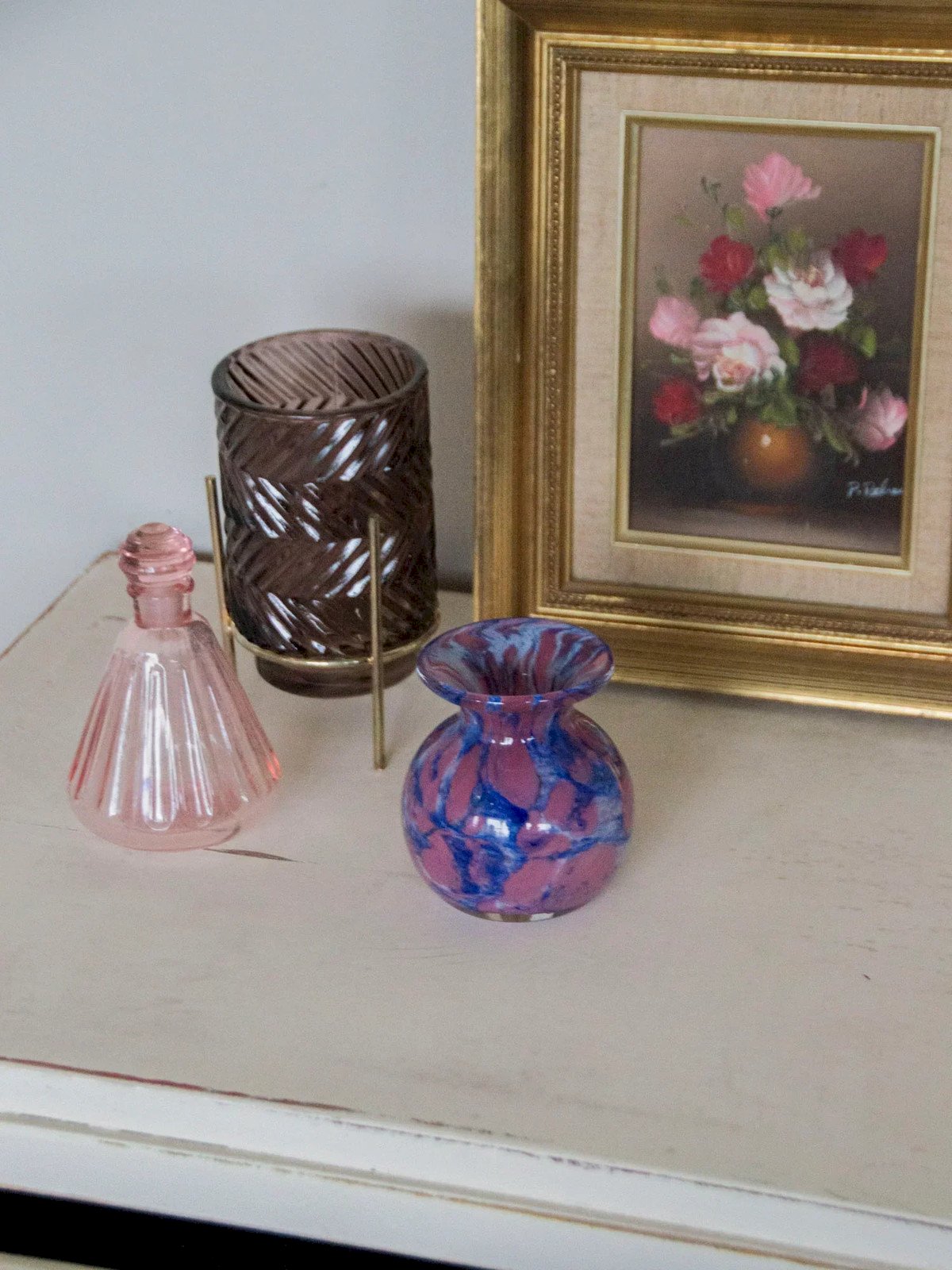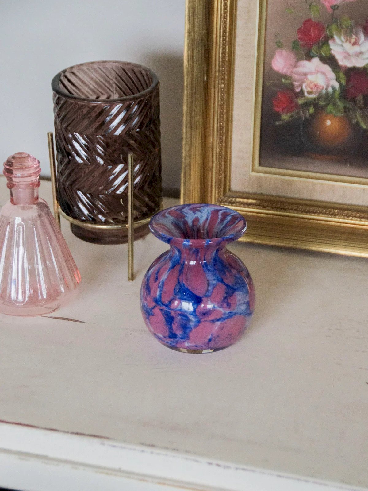 Add a delicate touch to your interior with this small violet-pink tinted glass vase, designed to showcase a single flower or bud. Its compact size and harmonious proportions easily fit on a shelf, windowsill, or side table, providing a subtle pop of color. The glass captures light and diffuses a soft, contemporary aura, ideal for creating a refined and poetic atmosphere. Perfect for assembling small bouquets or as a gift. Height: 10 cm Diameter: 9 cm Condition: Pre-owned: Item has been used. Item shows some signs of superficial wear... Pre-owned: Item has been used. Item shows some signs of superficial wear, fully operational and functioning correctly. It may be a display model or a returned item after a short period of use. any potential imperfections. Brand: Debongout Type: Thrifted Product Material: Glass Style: Contemporary