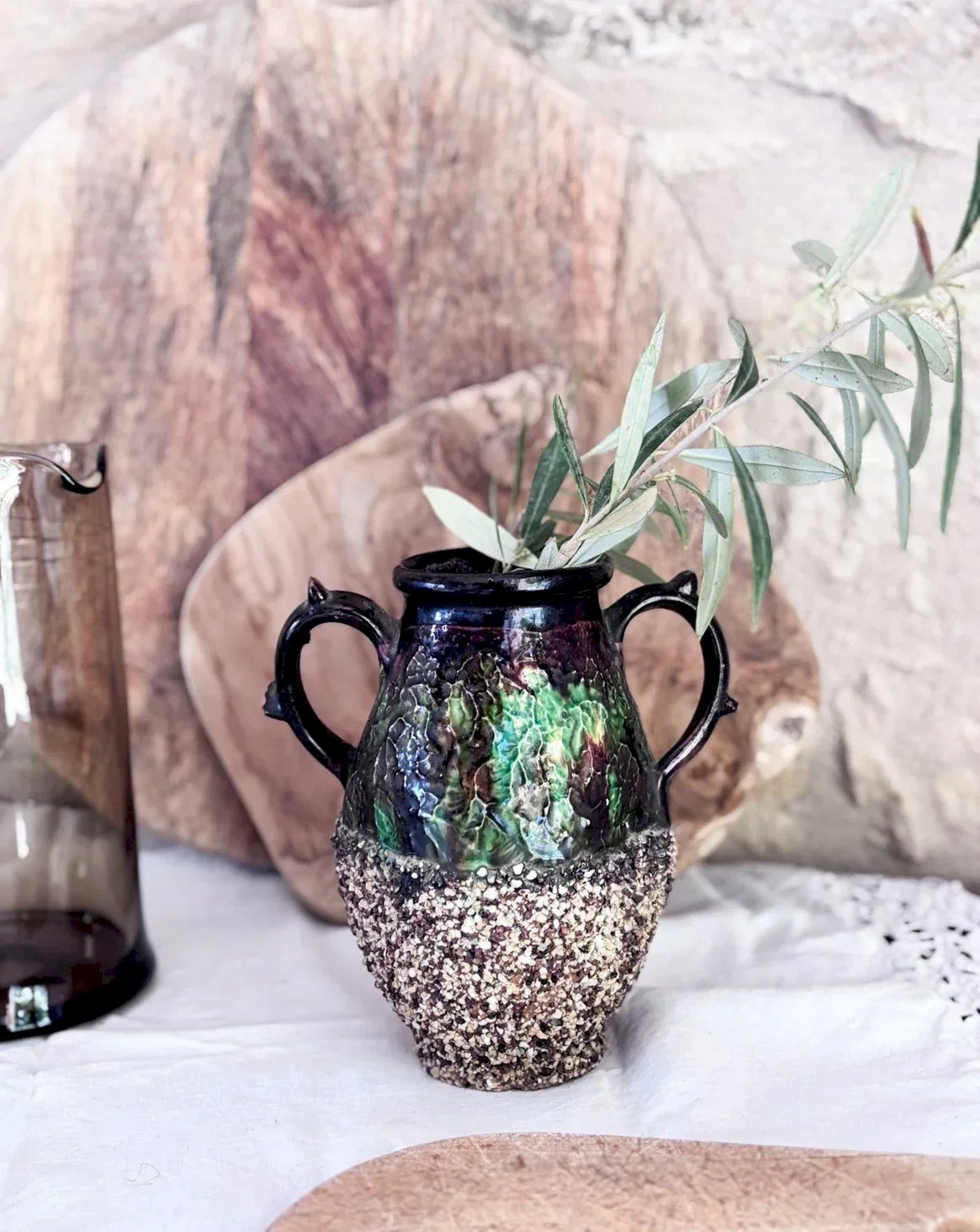 Add a touch of elegance to your interior with this glazed earthenware vase, adorned with two delicate handles. Its subtle sand decoration evokes a calming and natural atmosphere, perfect for showcasing your bouquets or as a decorative piece in its own right. Ideal for enhancing any space, this vase combines aesthetics and functionality with a meticulous finish. A must-have piece for lovers of refined decoration. Height: 18 cm Diameter: 8 cm Condition: Used: Item that has been used. Item showing some superficial signs of wear, fully operational and functioning properly. It may be a display model or an item returned to the store after a short period of use, with possible imperfections. Brand: Debongout Type: Vintage product Material: Earthenware Style: Contemporary