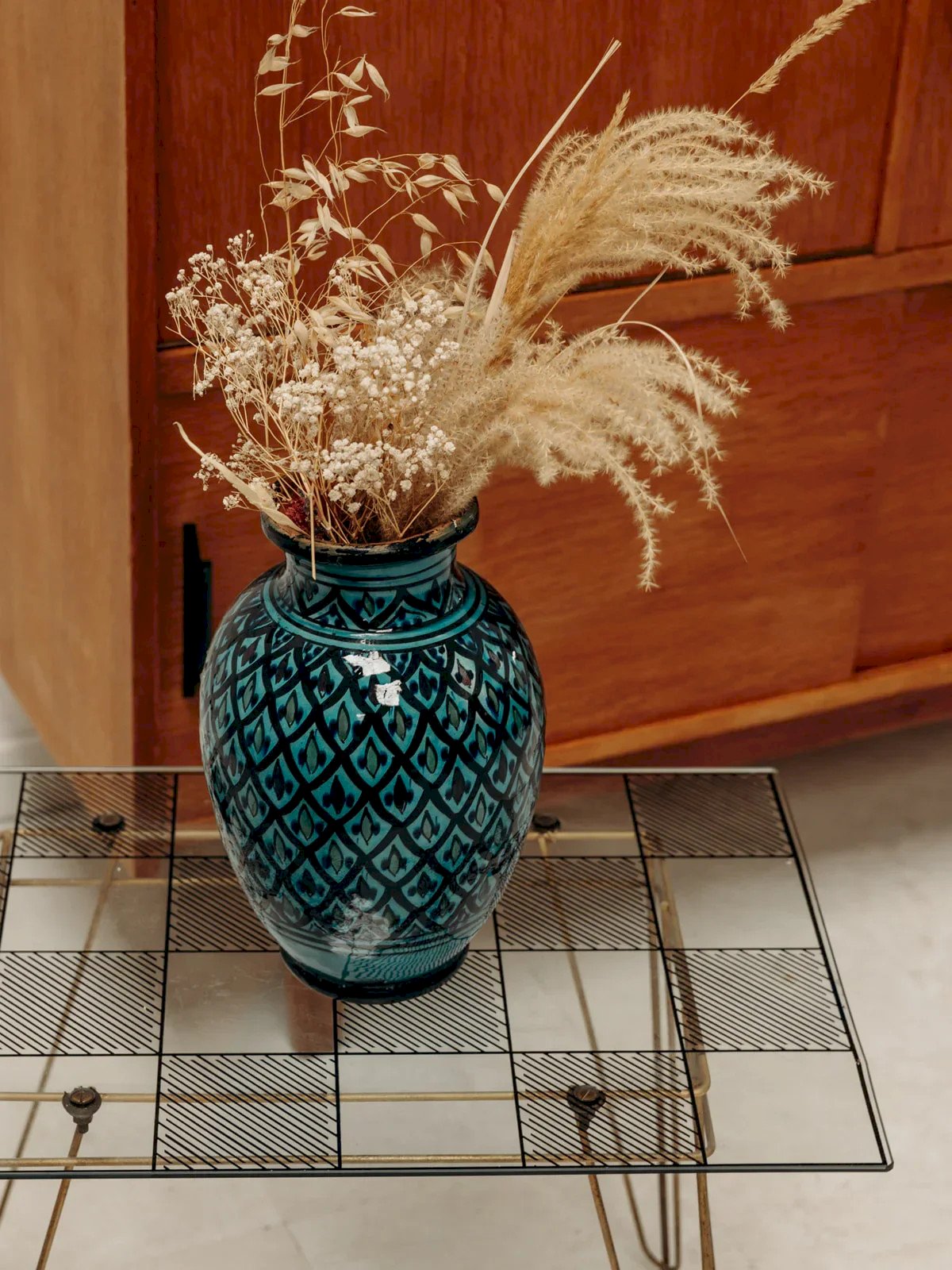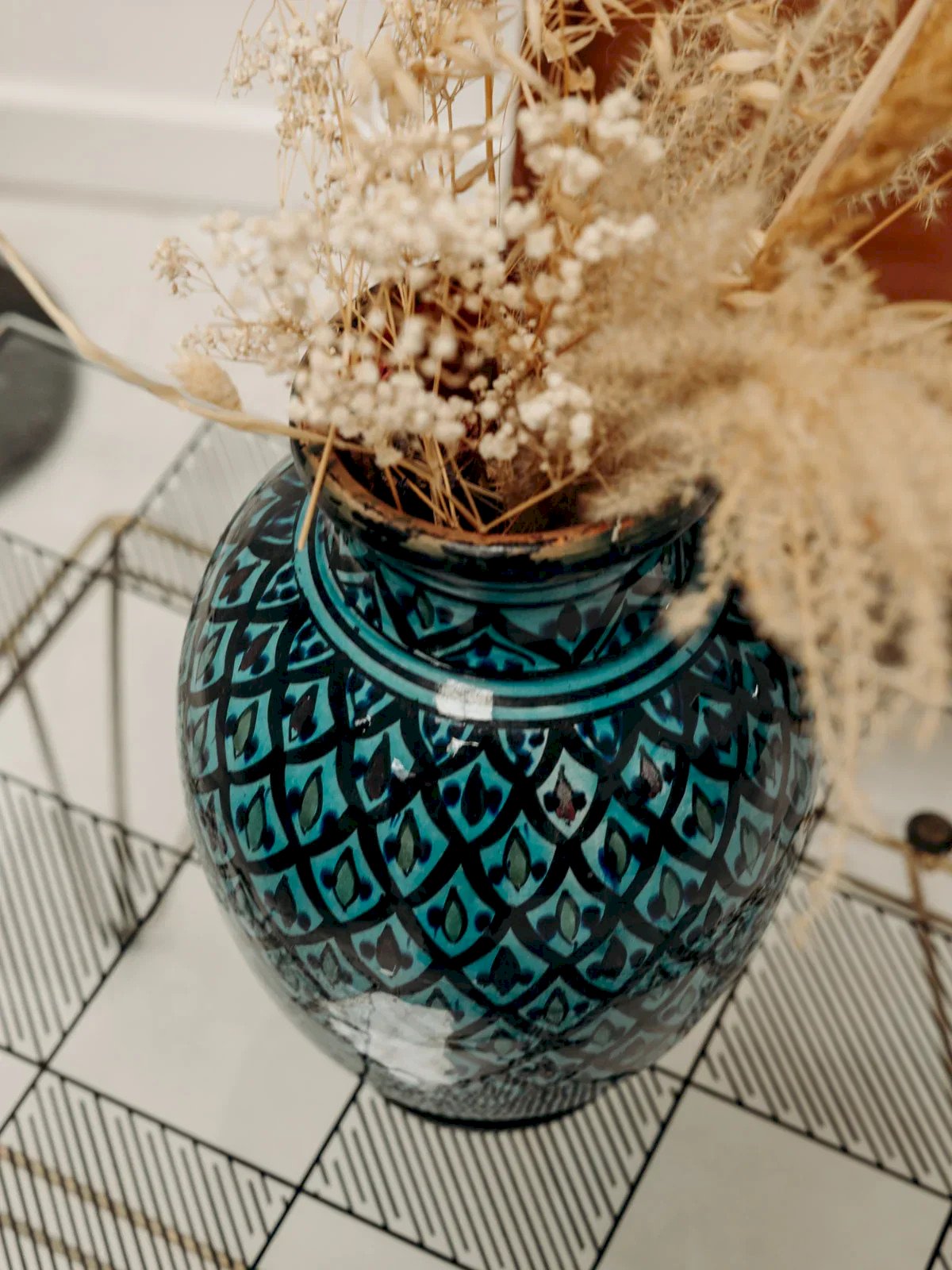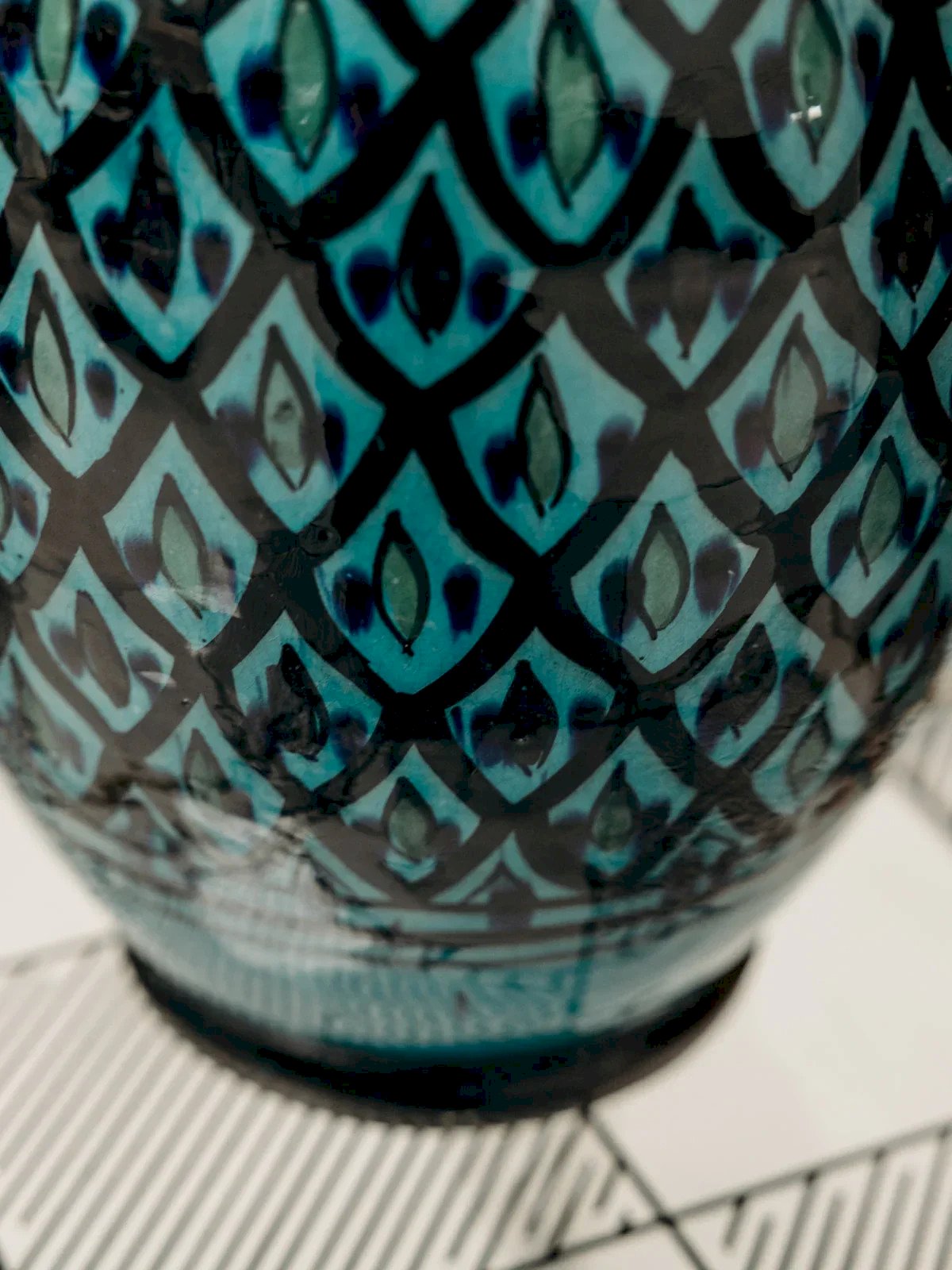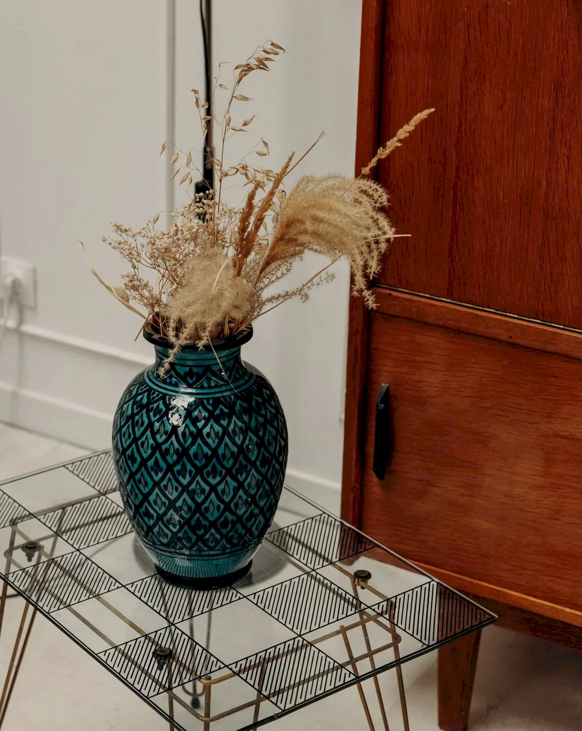Add a touch of freshness to your interior with this turquoise blue vase. Its vibrant color and elegant design make it a perfect accent for your floral arrangements or as a decorative object on a shelf. Made from quality ceramic, this vase combines durability and aesthetic appeal, bringing a contemporary note to your decor. Ideal dimensions for a wildflower arrangement or a more structured bouquet. Give your space a zen and colorful atmosphere with this beautiful accessory. Height: 30 cm Diameter: 22 cm Condition: Used: Item has been used. Item shows some signs of superficial wear, ... Used: Item has been used. Item shows some signs of superficial wear, fully operational and functioning correctly. It may be a display model or an item returned to the store after a short period of use. any potential imperfections. Brand: Debongout Type: Thrifted product Material: Ceramic Style: Contemporary