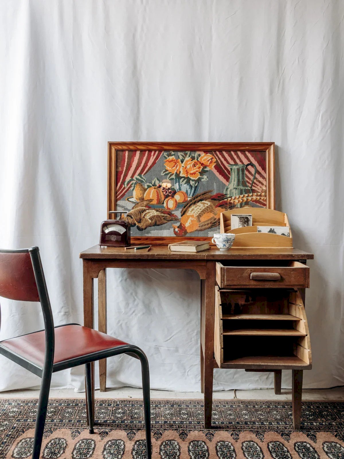 Adopt this small dark wood desk with clean and warm lines, designed for an intimate work corner or an elegant entrance. Its three drawers and a large drop front offer organized storage, while adjustable shelves in the drop front allow you to store supplies and papers according to your needs. The integrated wooden handles emphasize the harmony of the piece, and the presence of a side extension, originally conceived to enlarge the work surface, recalls its modular functionality. Compact but generous in capacity, it creates a studious and calming atmosphere. Length: 89 cm Width: 45.5 cm Height: 69 cm Drawer height: 6 cm Legroom: Width: 44 cm Height: 64 cm Condition: Used: Item has been used. Item shows some superficial signs of wear, fully operational and working correctly. It may be a demonstration model or an item returned to the store after a short period of use. any possible imperfections. Brand: Debongout Type: Curated product Material: Wood Style: Country Custom: Desks