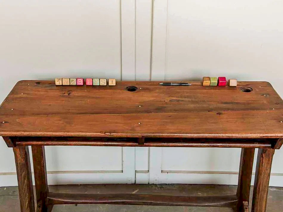 Antique double school desk made entirely of wood, designed for two seats, it offers an elongated and proportionate workspace ideal for contemporary use by two. The varnished top reveals a beautiful warmth of the wood, while two compartments, a pencil holder, and the two original inkwells provide functional and characterful storage. With a classic spirit, it fits well as both a desk corner and a side table, adding a touch of sober and inspiring authenticity. In excellent condition, it retains a lovely patina. Slight signs of wear that contribute to its charm. Length: 109 cm Width: 40 cm Height: 68.5 cm Height under the top: 51 cm Dimensions of the top: 109 cm x 41.5 cm Dimensions of the left compartment: 26.5 cm x 46 cm Dimensions of the right compartment: 26.5 cm x 47 cm Condition: Used: Item that has been used. Item showing some superficial wear marks, fully operational and functioning properly. It may be a demonstration model or an item returned to the store after a short period of use. Any possible imperfections. Brand: Debongout Type: Thrifted product Material: Wood Style: Country Customized: Desks