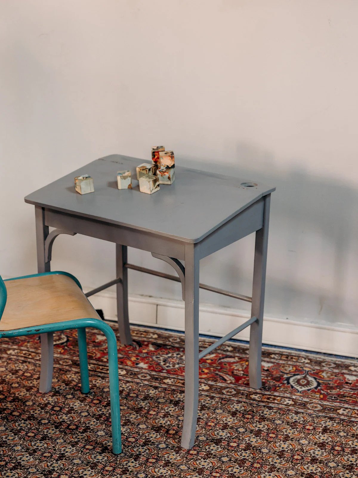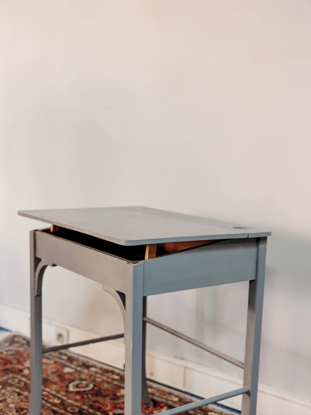 Adopt this gray wooden desk in a child-friendly size, designed to create a functional and charming study corner. Its plain surface and small hole for inkwell evoke the school furniture of yesteryear, offering a delicate retro touch without overwhelming the space. Compact and stable, it easily fits into a bedroom or reading nook, inviting writing and creative activities. In excellent condition despite some signs of wear. Length: 60 cm Width: 43 cm Height: 67 cm Height under the tabletop: 54 cm Condition: Used: Item has been used. Item shows some superficial signs of wear, fully operational and functioning correctly. It may be a display model or an item returned to the store after a short period of use. The possible imperfections. Brand: Debongout Type: Vintage product Material: Wood Style: Country Personalized: Desks