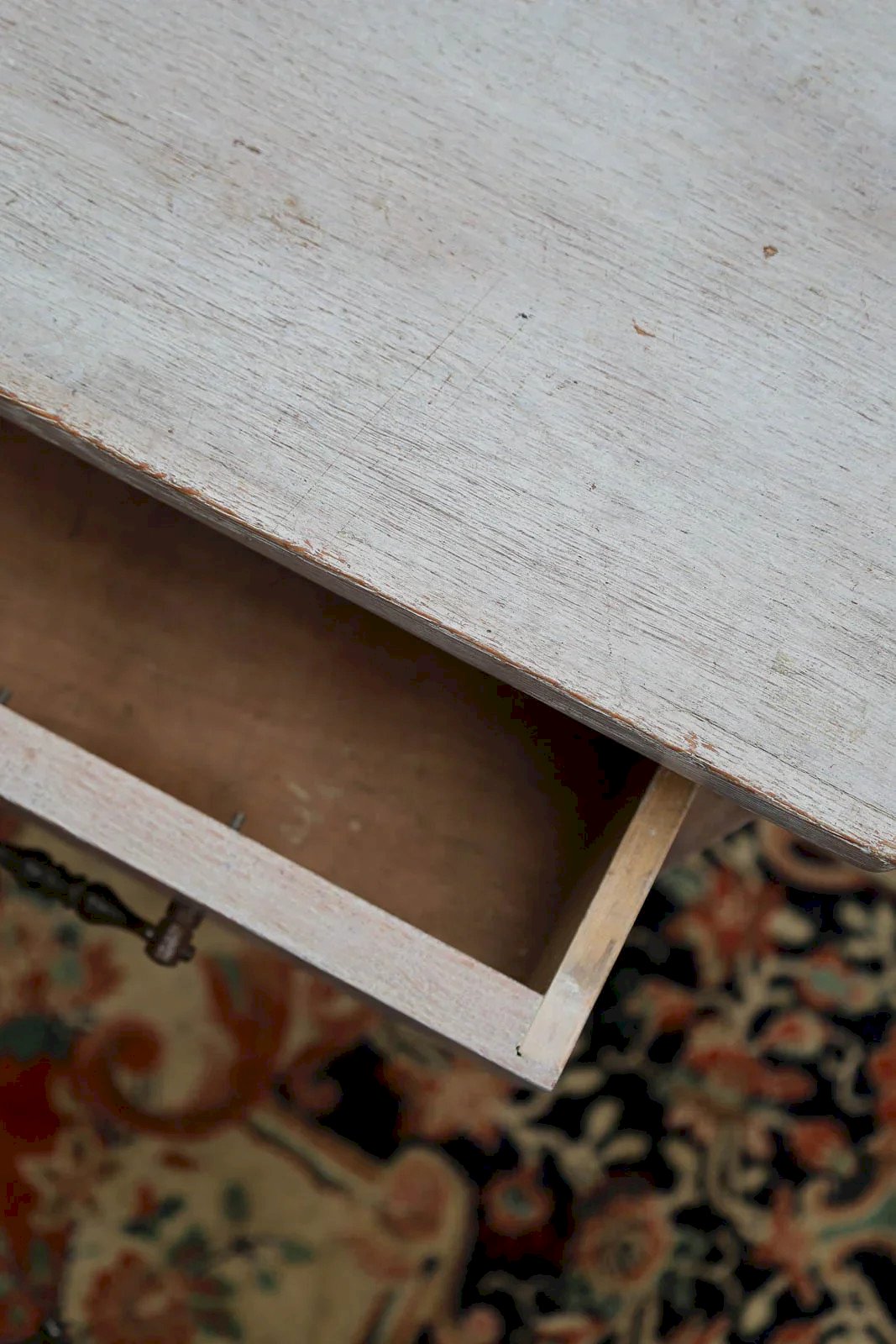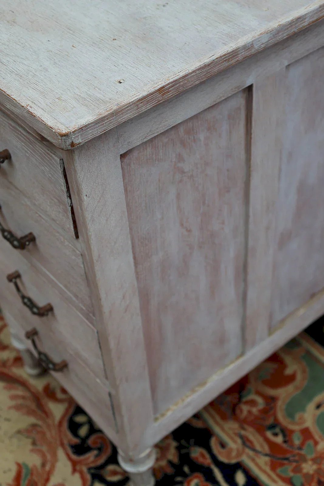 Adopt this pine desk with a beautiful white patina, whose delicate lines and crafted legs bring a subtle elegance to any interior. Four drawers with metal handles offer organized storage, while its compact yet deep format allows it to hold a computer and notebooks without clutter. Ideal for a workspace in a bedroom or an entryway, it creates a serene and bright ambiance, combining artisanal charm with everyday functionality. Length: 110 cm Width: 55 cm Height: 76 cm Height under the top: 71 cm Drawer height: 11 cm Condition: Used: Item has been used. Item shows some superficial signs of wear, fully operational and functioning correctly. It may be a demonstration model or a return that has been used for a short period. Any imperfections may be present. Brand: Debongout Type: Thrifted product Material: Pine, Metal, Wood Style: Country Custom: Desks