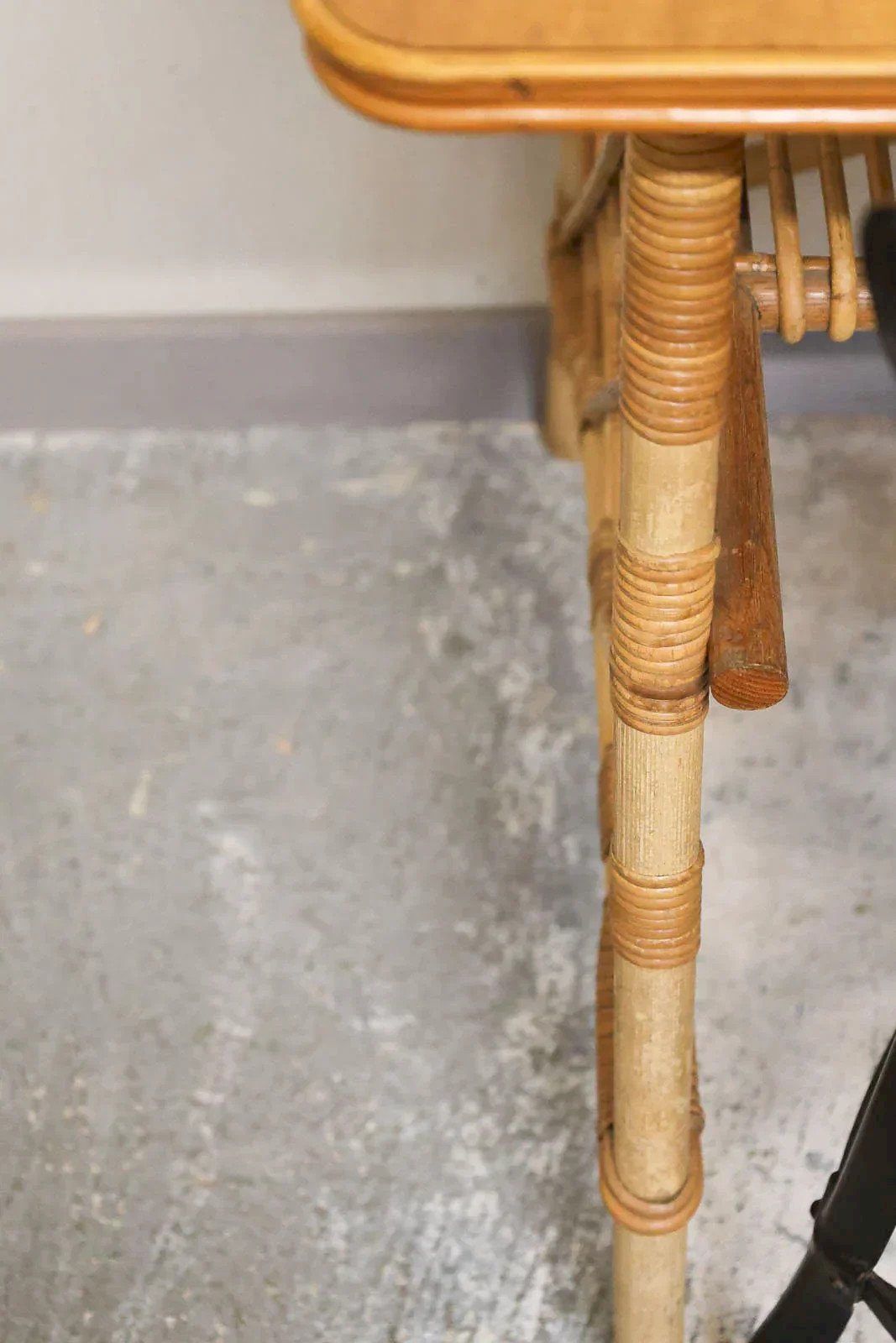 Adopt this lovely little rattan and wood desk from the 1960s signed by Louis Sognot, whose meticulous work with rattan gives it a warm and graphic appeal. Three side drawers and a half-shelf under the tabletop provide discreet storage, while the space for a compact chair and the classic height make it a comfortable workstation for daily use. Ideal for small spaces, it combines vintage charm and practicality; the tabletop is unstained. Some signs of use on the drawers. Length: 102 cm Width: 62 cm Height: 75 cm Length of right drawers: 27.5 cm Depth of right drawers: 38 cm Height of right drawers: 5.5 cm Length of half-shelf under the tabletop: 44 cm Depth of half-shelf under the tabletop: 27 cm Condition: Used: Item that has been used. Item showing some superficial wear marks, fully operational and functioning correctly. It could be a demonstration model or an item returned to the store after a short period of use. any potential imperfections. Brand: Debongout Type: Vintage product Material: Wood, Rattan Style: Country Custom: Desks