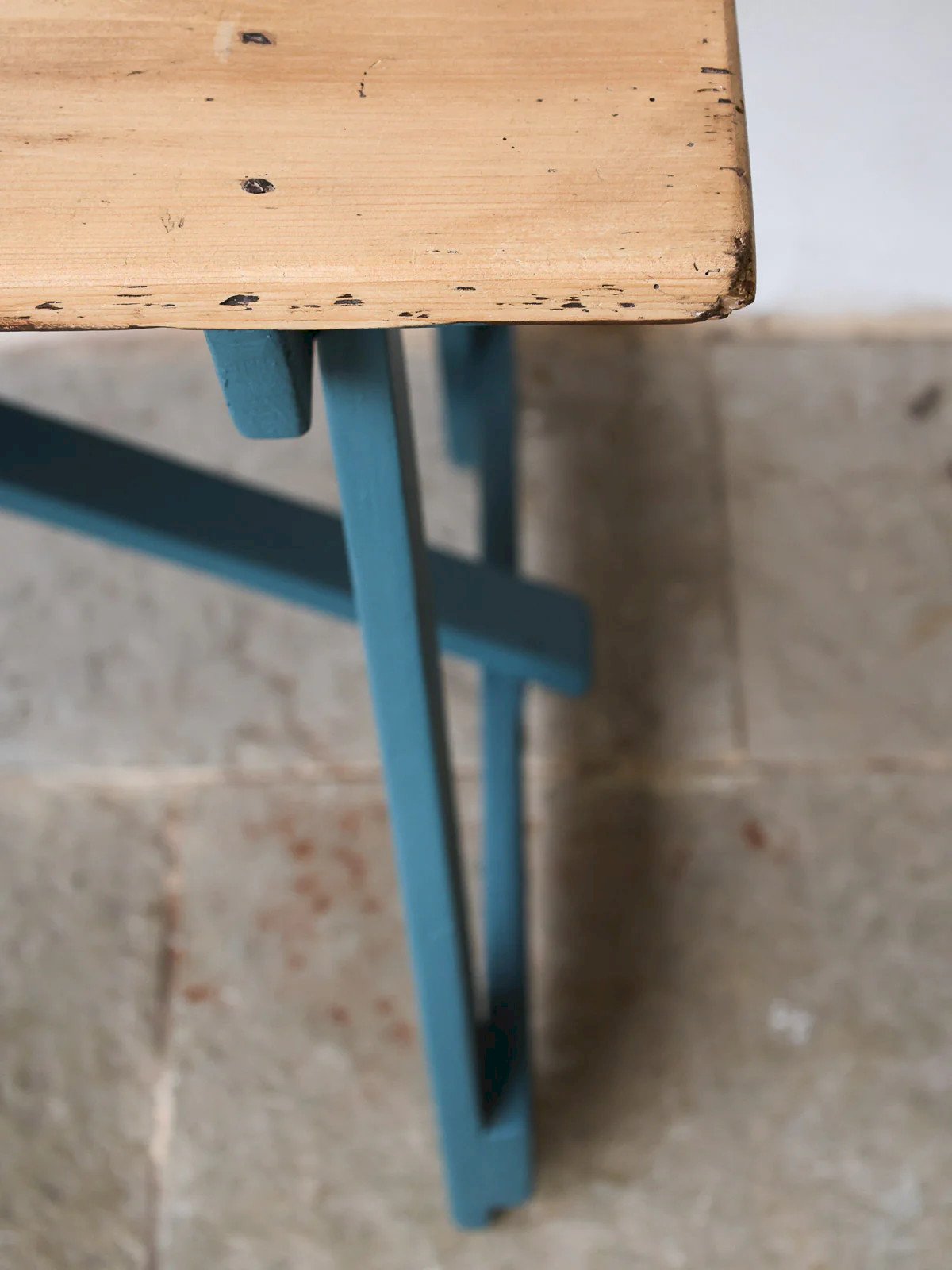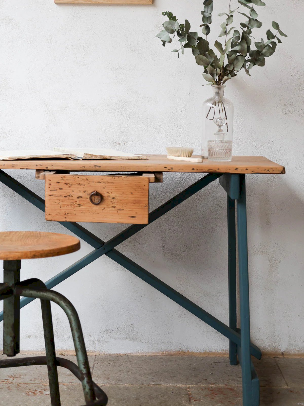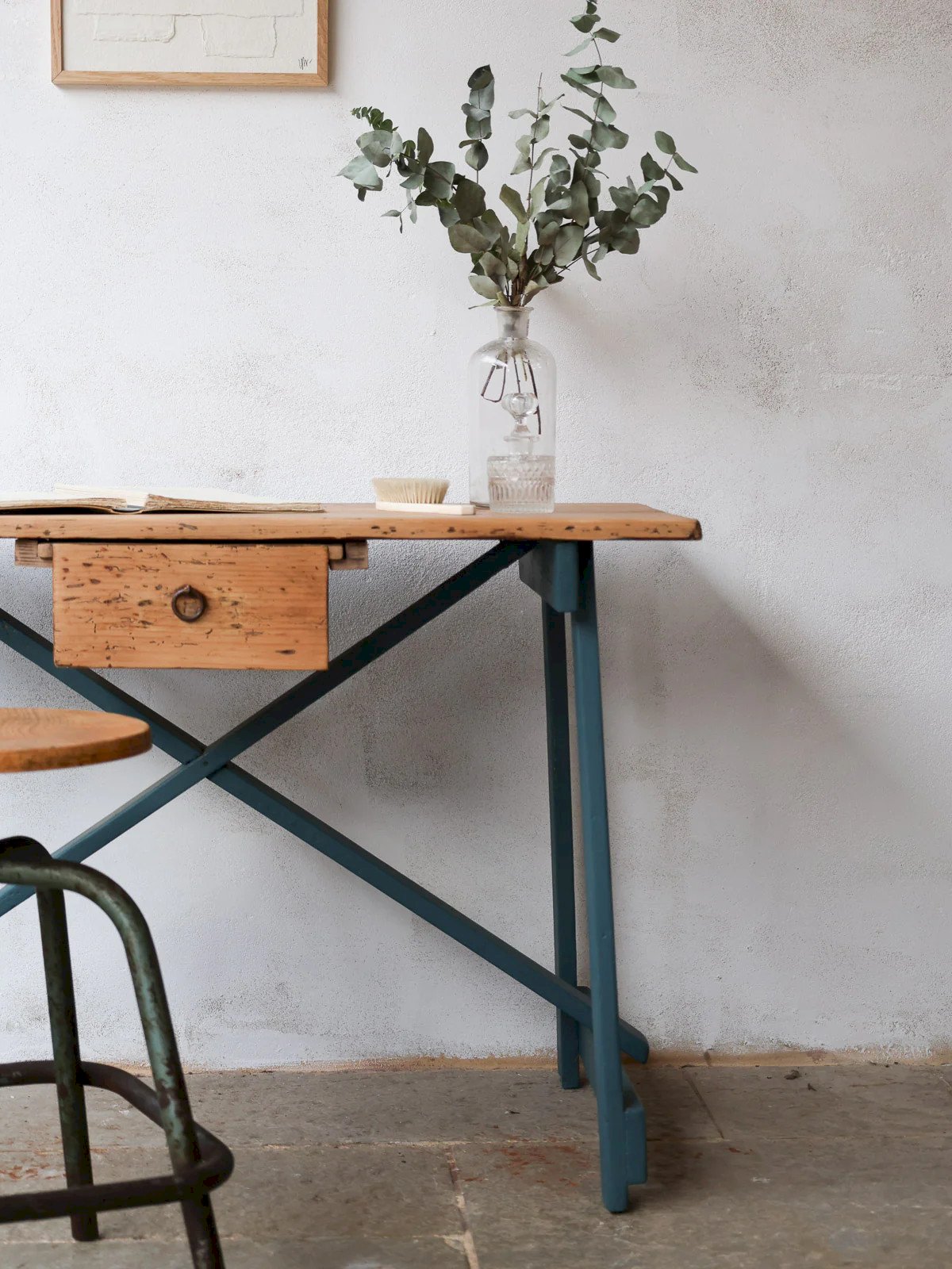 Adopt this compact wooden desk, featuring a slim top and dark green painted wooden legs that give it a delicate and contemporary look. A discreet drawer with a metal ring holds notebooks and small accessories, while the space under the top provides comfort for a laptop or a writing area. Its contained proportions make it ideal for an apartment, an entryway, or a spare office, bringing a warm and tidy atmosphere. Length: 98 cm Width: 49 cm Height: 69 cm Height under the top: 67 cm Condition: Used: Item that has been used. Item showing some superficial signs of wear, fully operational and functioning correctly. It may be a demonstration model or an item returned to the store after a short period of use. Any potential imperfections. Brand: Debongout Type: Vintage product Material: Wood, Oak, Metal Style: Country Custom: Desks