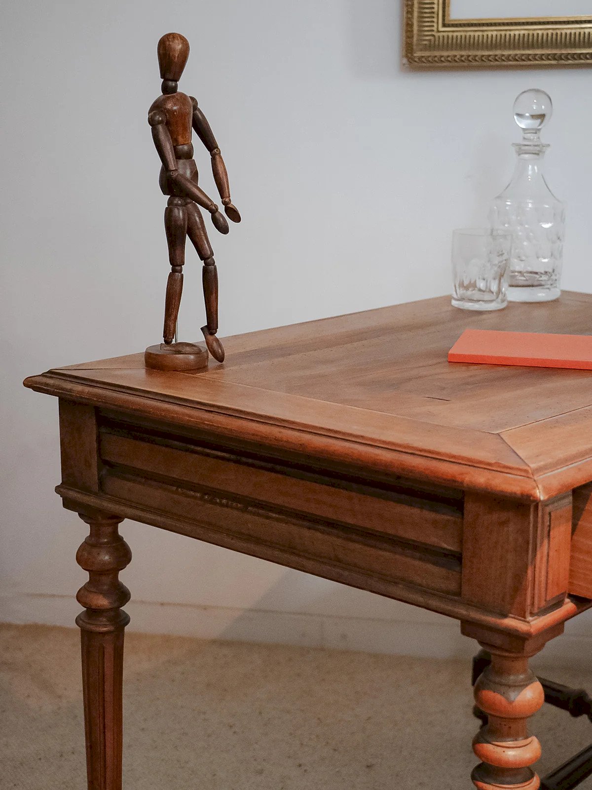 Adopt this dark solid wood Louis-Philippe desk, adorned with delicate moldings and a brass handle. Compact and well-proportioned, it easily fits into a living room or office nook, offering a welcoming surface and a deep drawer for files and accessories. Its presence brings a discreet elegance and a warm atmosphere, ideal for a classic or contemporary interior. Some signs of use add to its authenticity. Length: 90 cm Width: 60 cm Height: 71 cm Drawer height: 9 cm Condition: Used: Item that has been utilized. Item showing some superficial signs of wear, ...Used: Item that has been utilized. Item showing some superficial signs of wear, fully operational and functioning correctly. It may be a demonstration model or an item returned to the store after a short period of use. the possible imperfections. Brand: Debongout Type: Thrifted Product Material: Wood Style: Countryside Custom: Desks