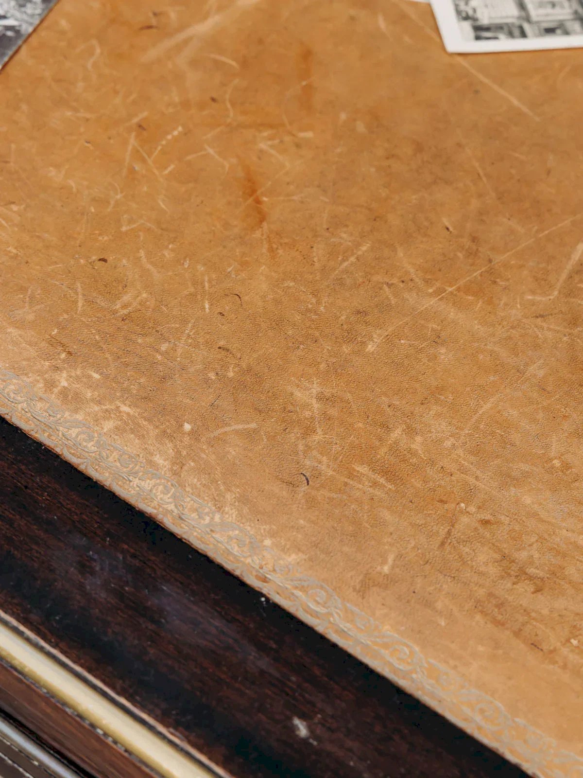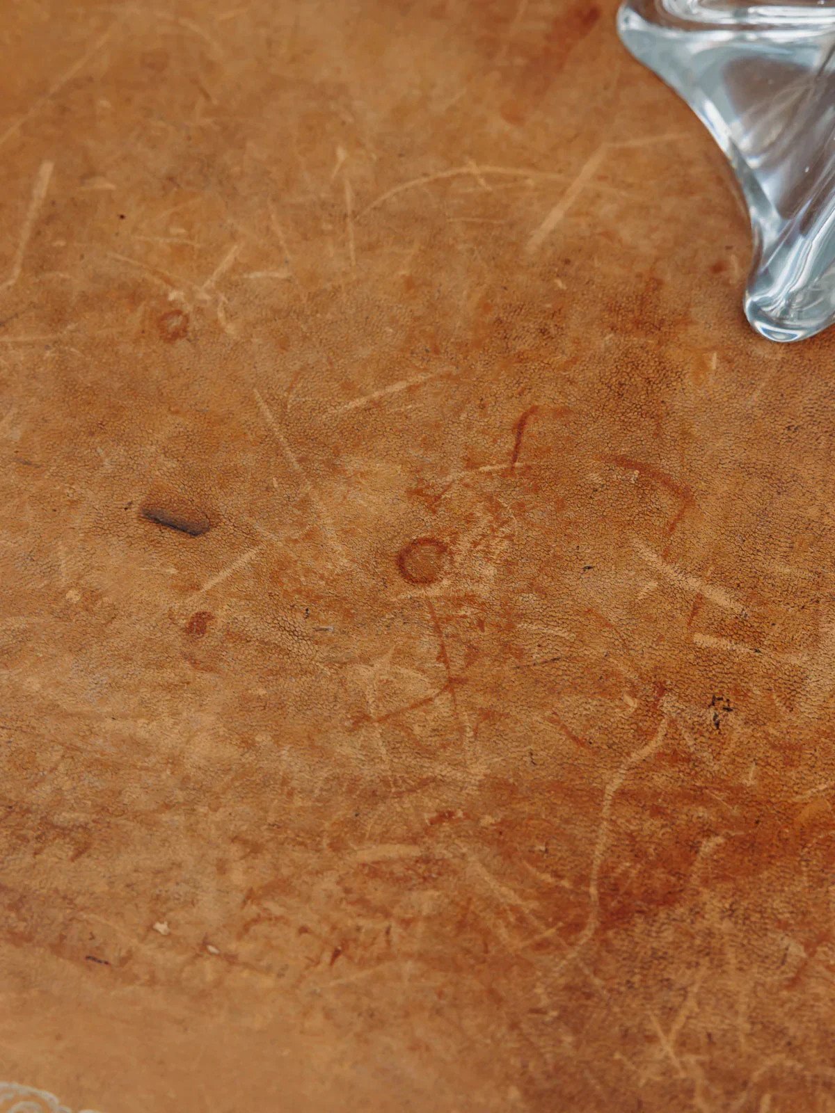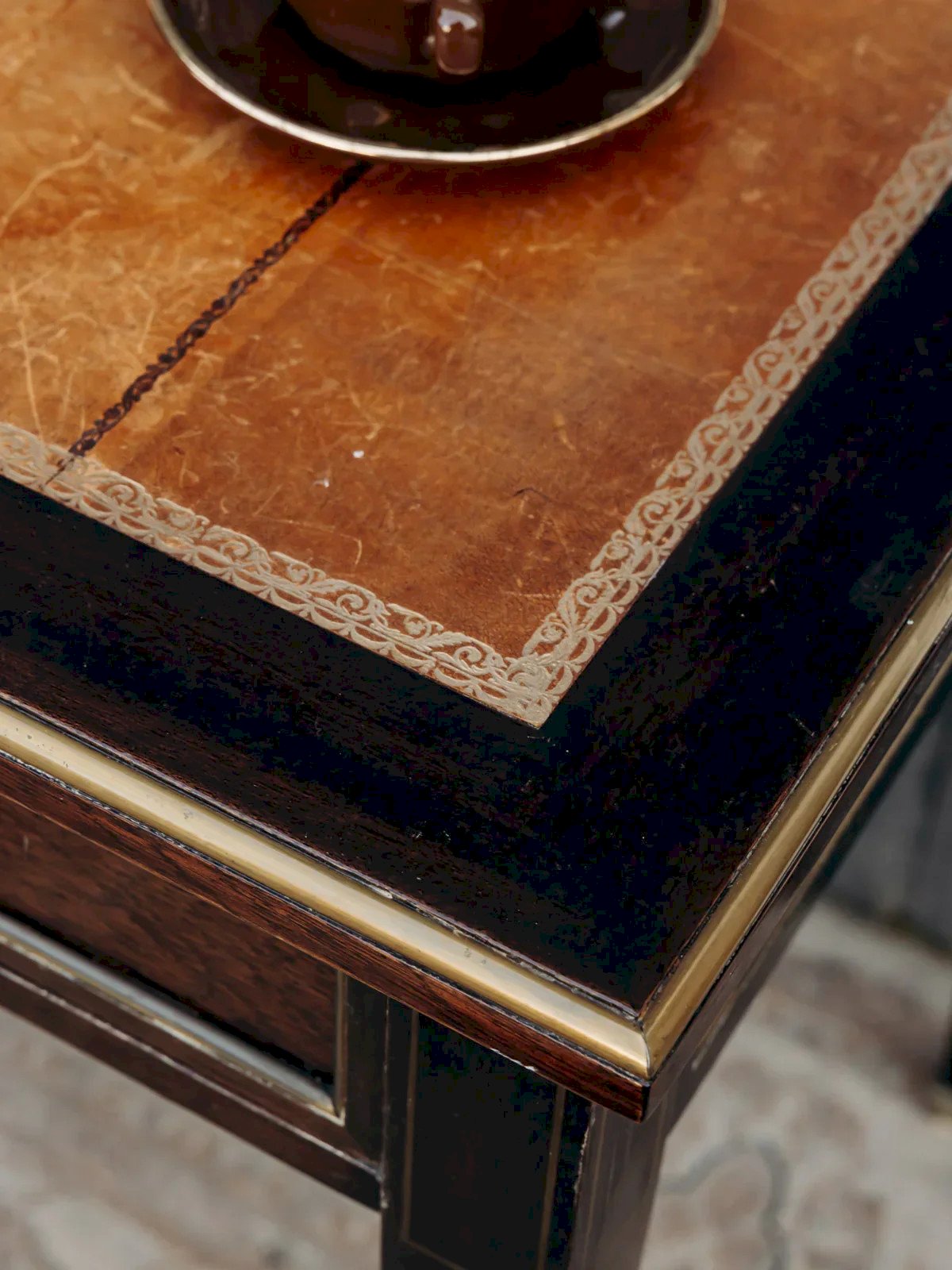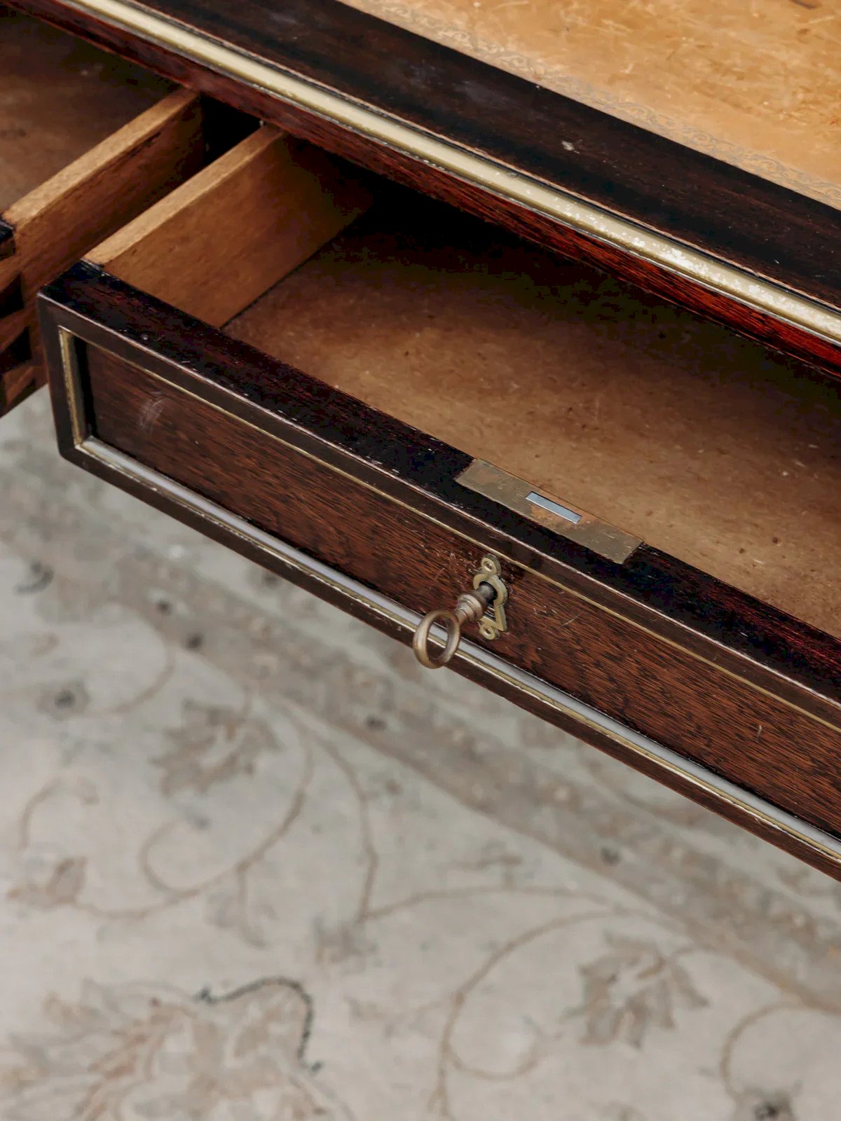 Elevate your workspace with this dark wood desk, featuring a leather top and a golden trim that highlights its classic and elegant lines. Its two lockable drawers with keys provide discreet and organized storage, ideal for a side desk or a bedroom, while its balanced proportions maximize the surface without cluttering the room. The combination of leather and wood creates a warm and refined atmosphere. Light traces of time are present. Length: 95 cm Width: 65 cm Height: 74 cm Drawer height: 7 cm Condition: Used: Item has been used. Item shows some superficial wear marks, fully operational and functioning correctly. It may be a demonstration model or an item returned to the store after a short period of use. Possible imperfections. Brand: Debongout Type: Thrifted product Material: Leather, Wood Style: Country Custom: Desks