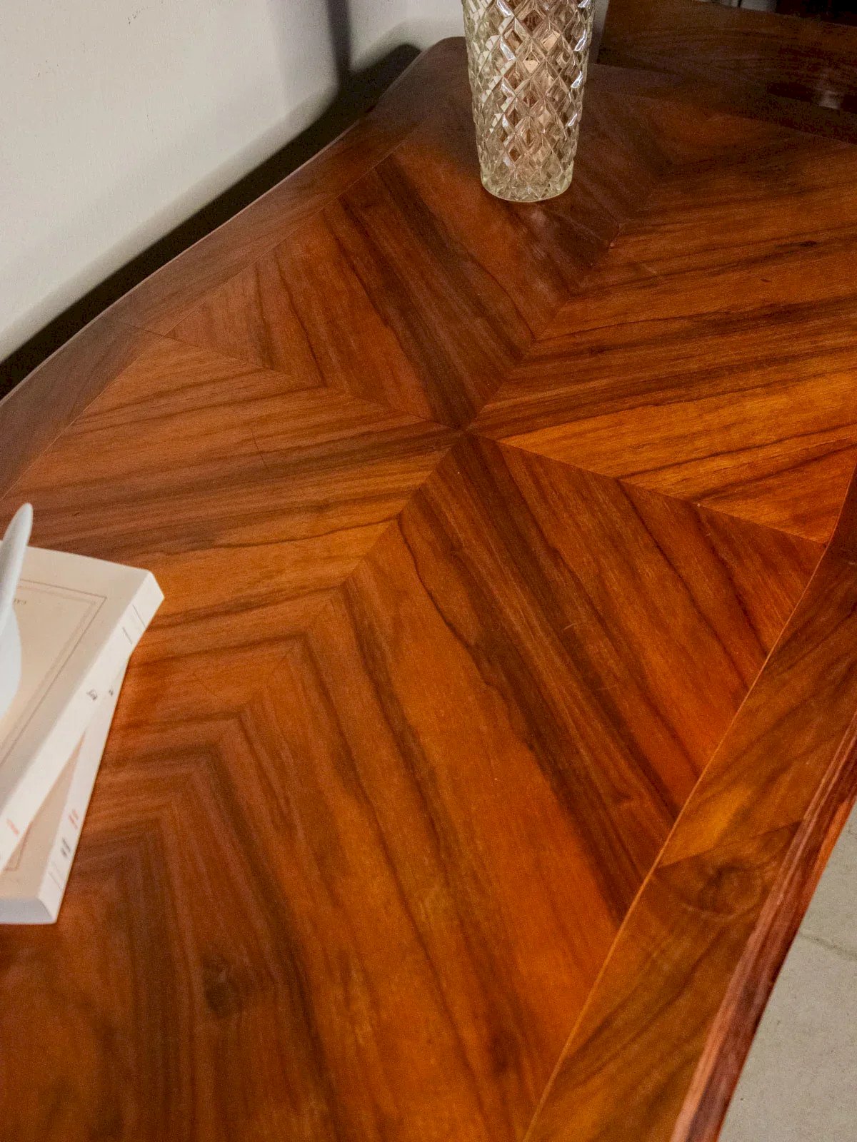 Adopt this three-drawer desk where refined marquetry adorns the façade and interacts with brass handles and ornaments, set on curved legs that give it an elegant silhouette. The top, decorated with triangular patterns, offers a welcoming and practical work surface, while the drop-down drawers reveal shelves and compartments for organized storage. Perfect for a classic and warm office corner or an entryway. Some traces of time and scratches blend into its beauty, and a lion's paw ornament is missing from the front right leg. Length: 111 cm Width: 64 cm Height: 99 cm Height under the top: 79 cm Height of the central drawer: 13.5 cm Height of the left front drawer: 13.5 cm Height of the left front drawer shelf: 6.5 cm Height of the right front drawer: 7.5 cm Condition: Used: Item that has been used. Item showing some superficial wear marks, fully operational and functioning correctly. It may be a demonstration model or an item returned to the store after a short period of use, including any imperfections. Brand: Debongout Type: Vintage product Material: Wood, Brass Style: Rustic Customized: Desks