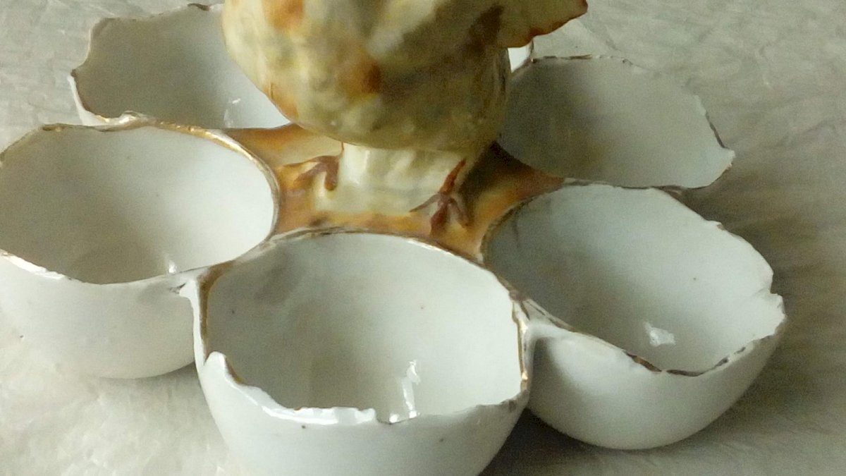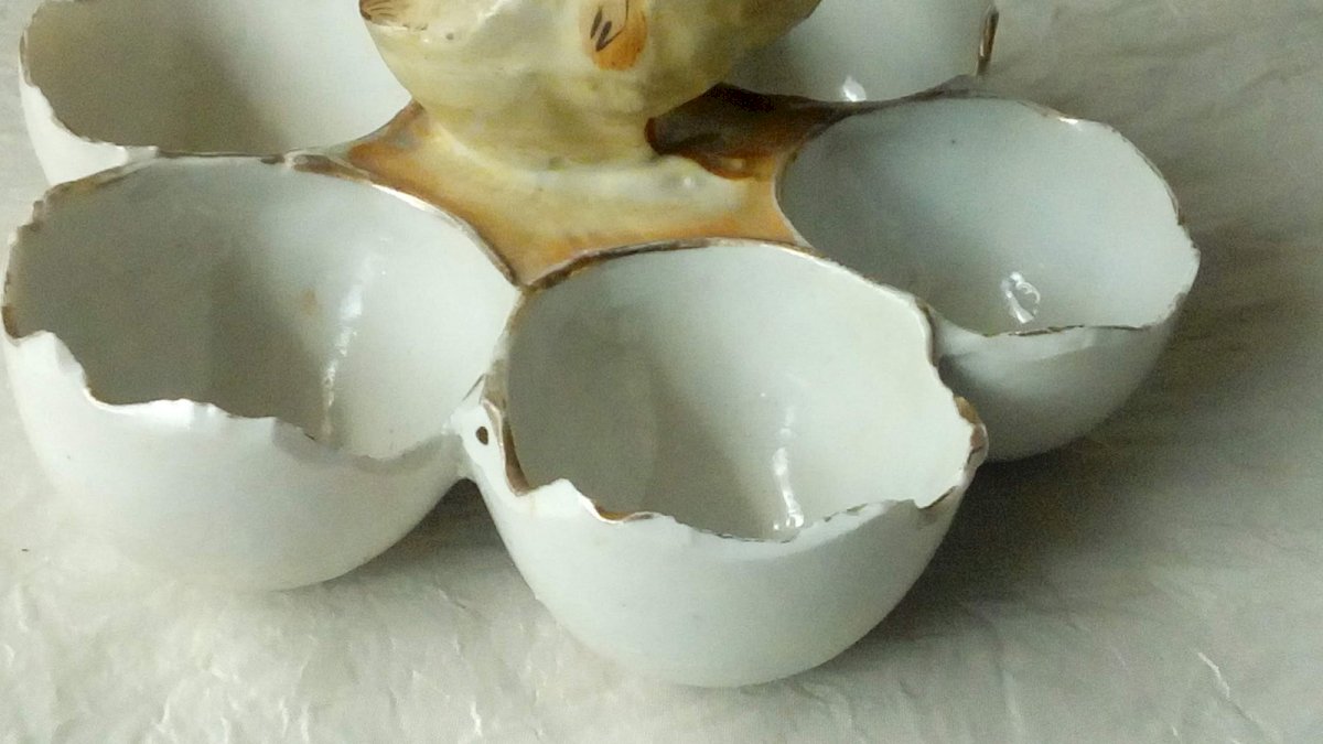 CHARMING LITTLE CHICK EGG HOLDER PORCELAIN GERMANY HEIGHT 10 cm DIAMETER 15 cm SEVERAL CHIPS AROUND THE EGG SLOTS AND ON THE BEAK OF THE CHICK VISIBLE IN THE PHOTOS