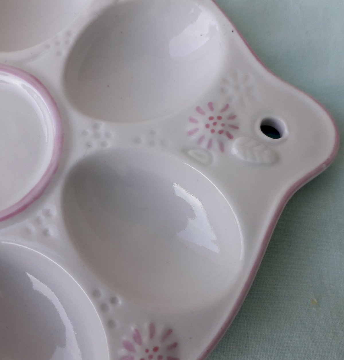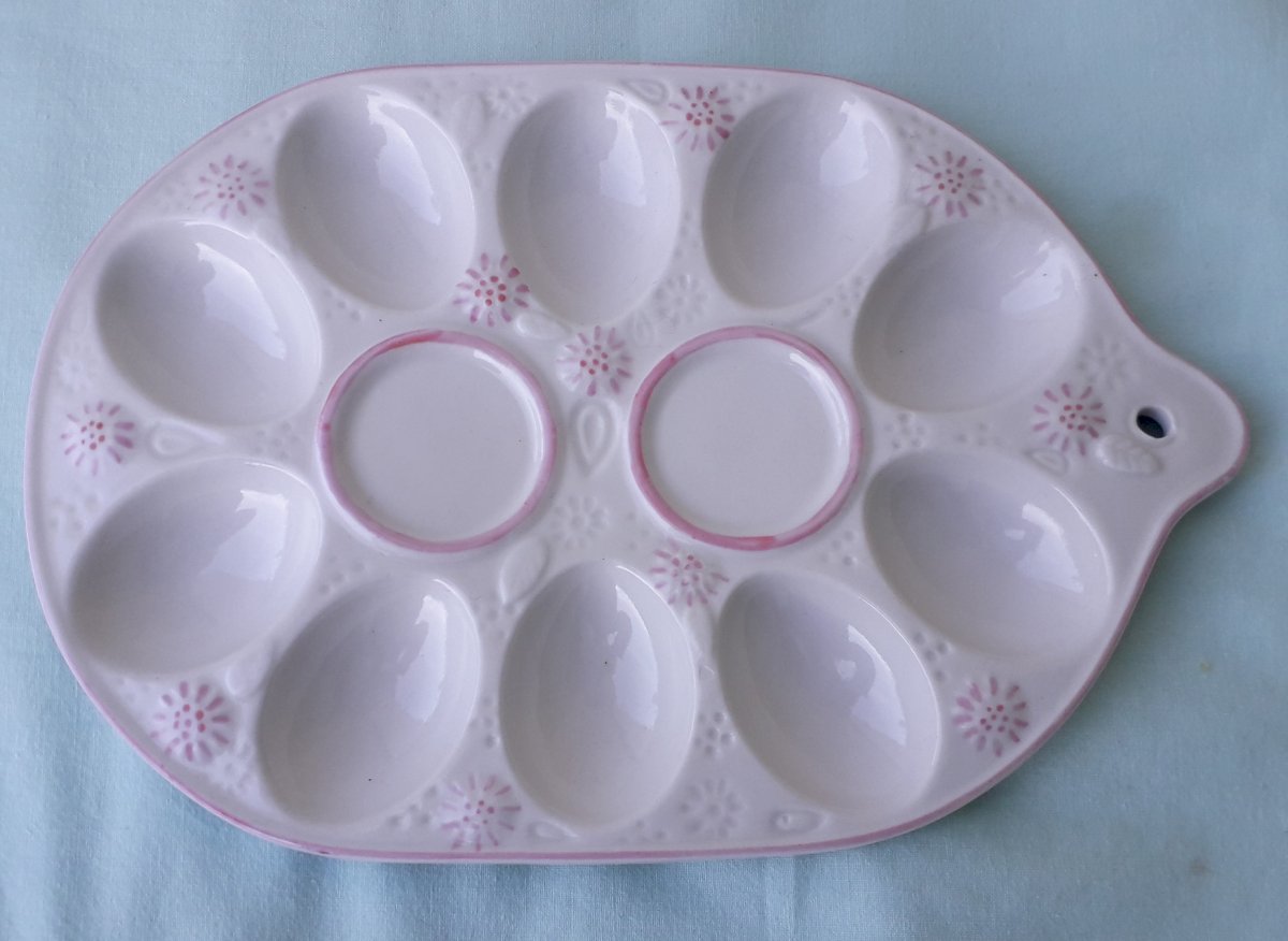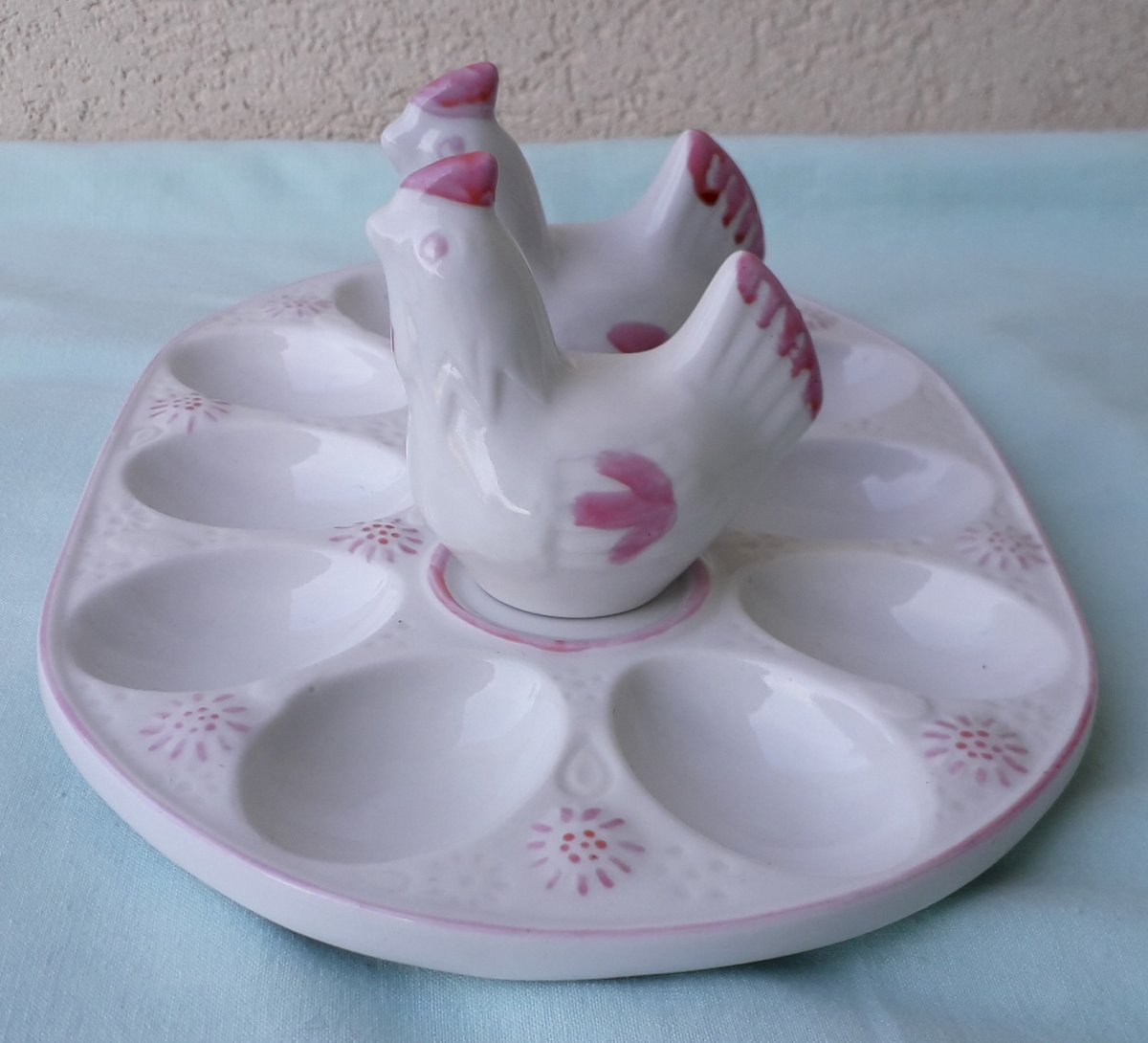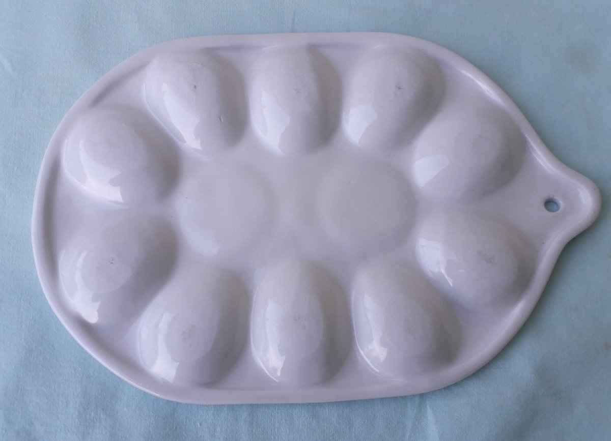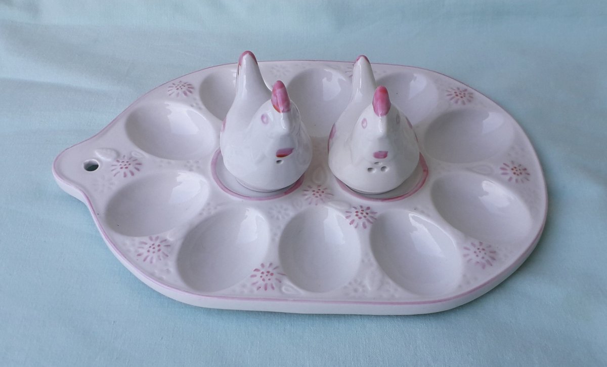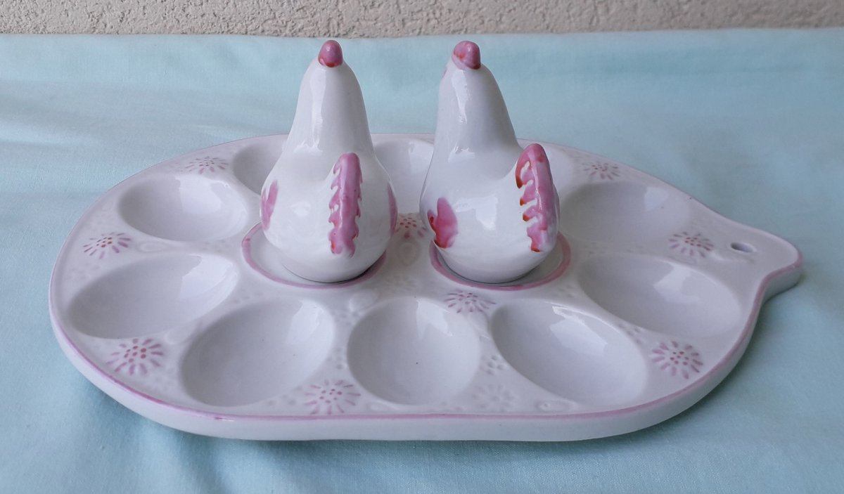 Ceramic egg tray, or egg holder, with 10 slots, accompanied by the salt shaker and pepper shaker, with no indication of manufacture. Very good overall condition, no breaks or chips. Dimensions: height of the tray 1.5 cm, width 24.5 cm, depth 16.5 cm. Weight 0.5 kg. Feel free to contact me for any additional information and/or to make your offers. See my other items for sale.