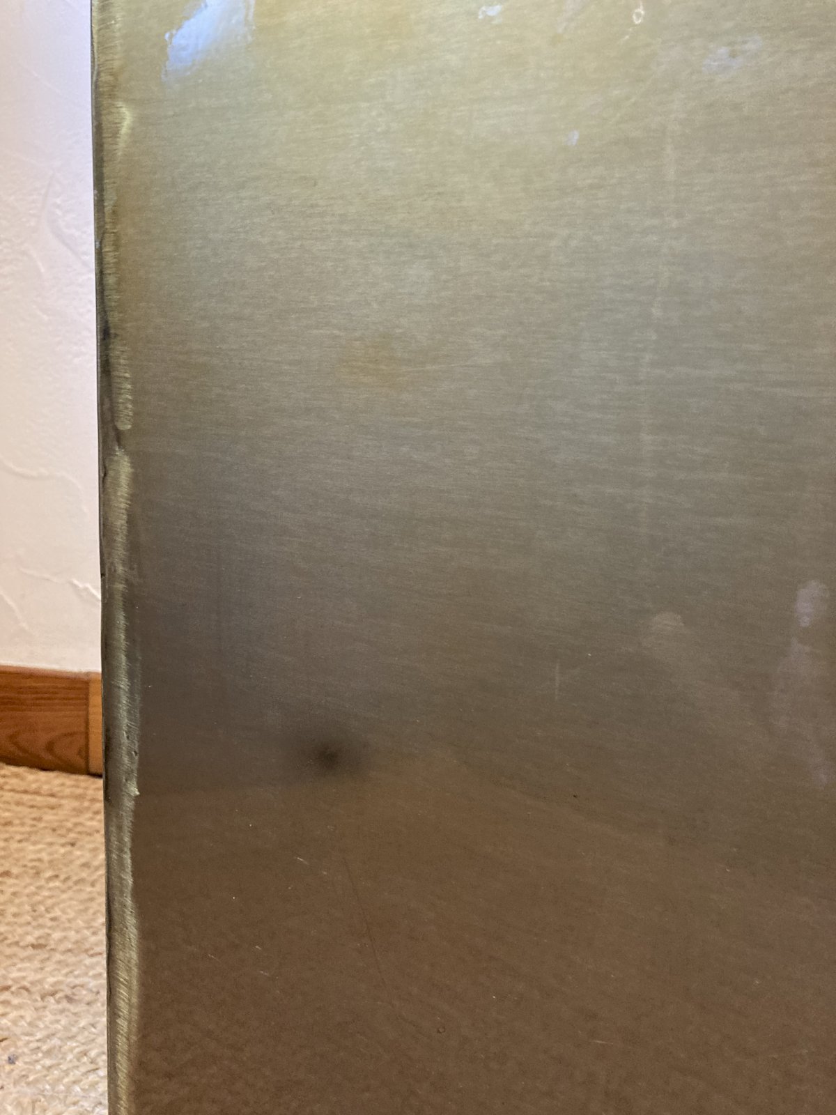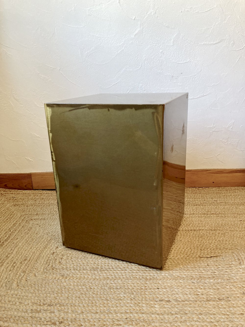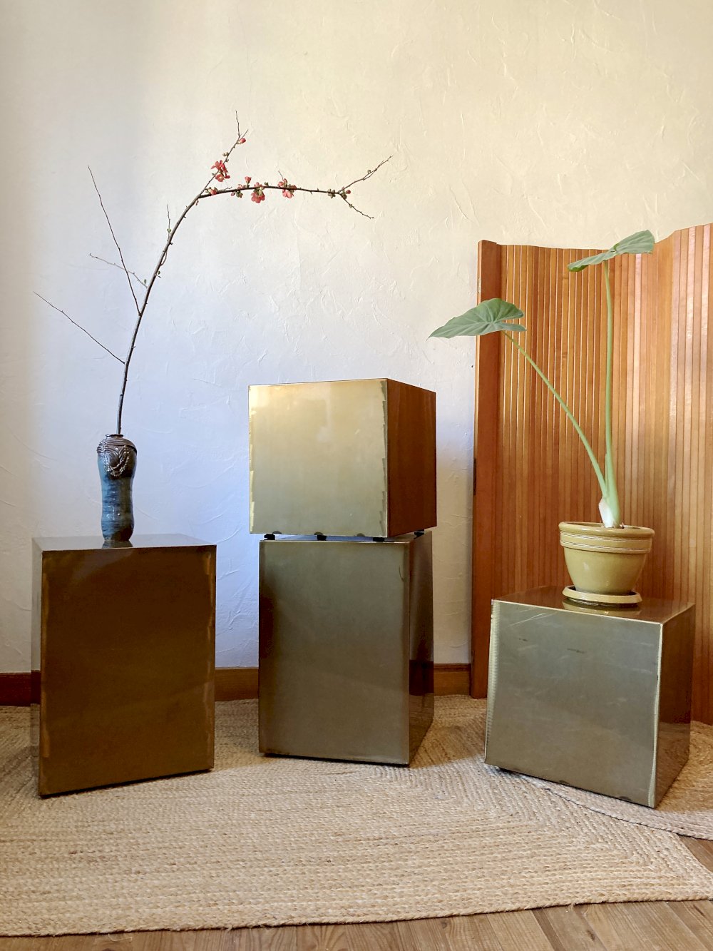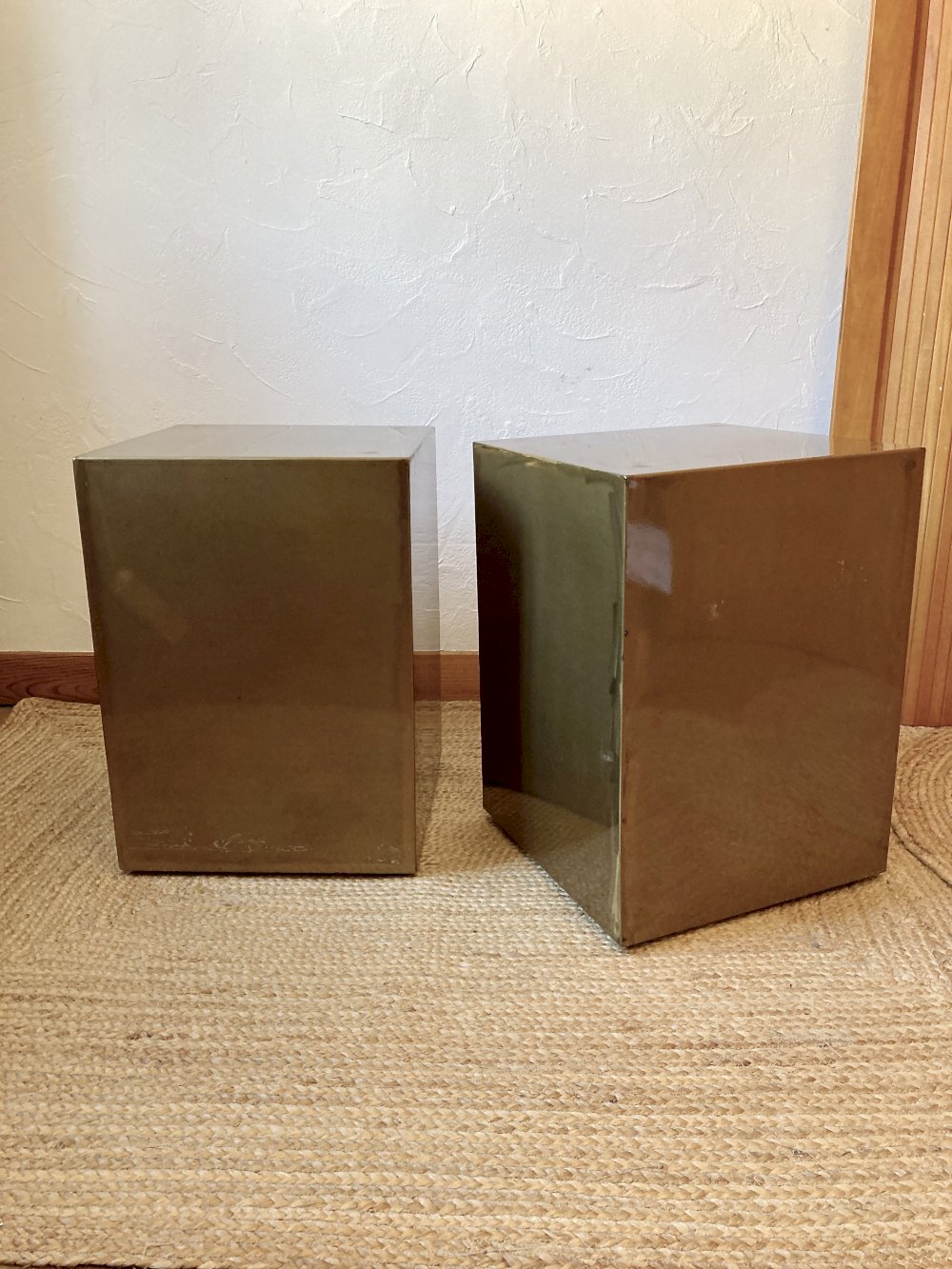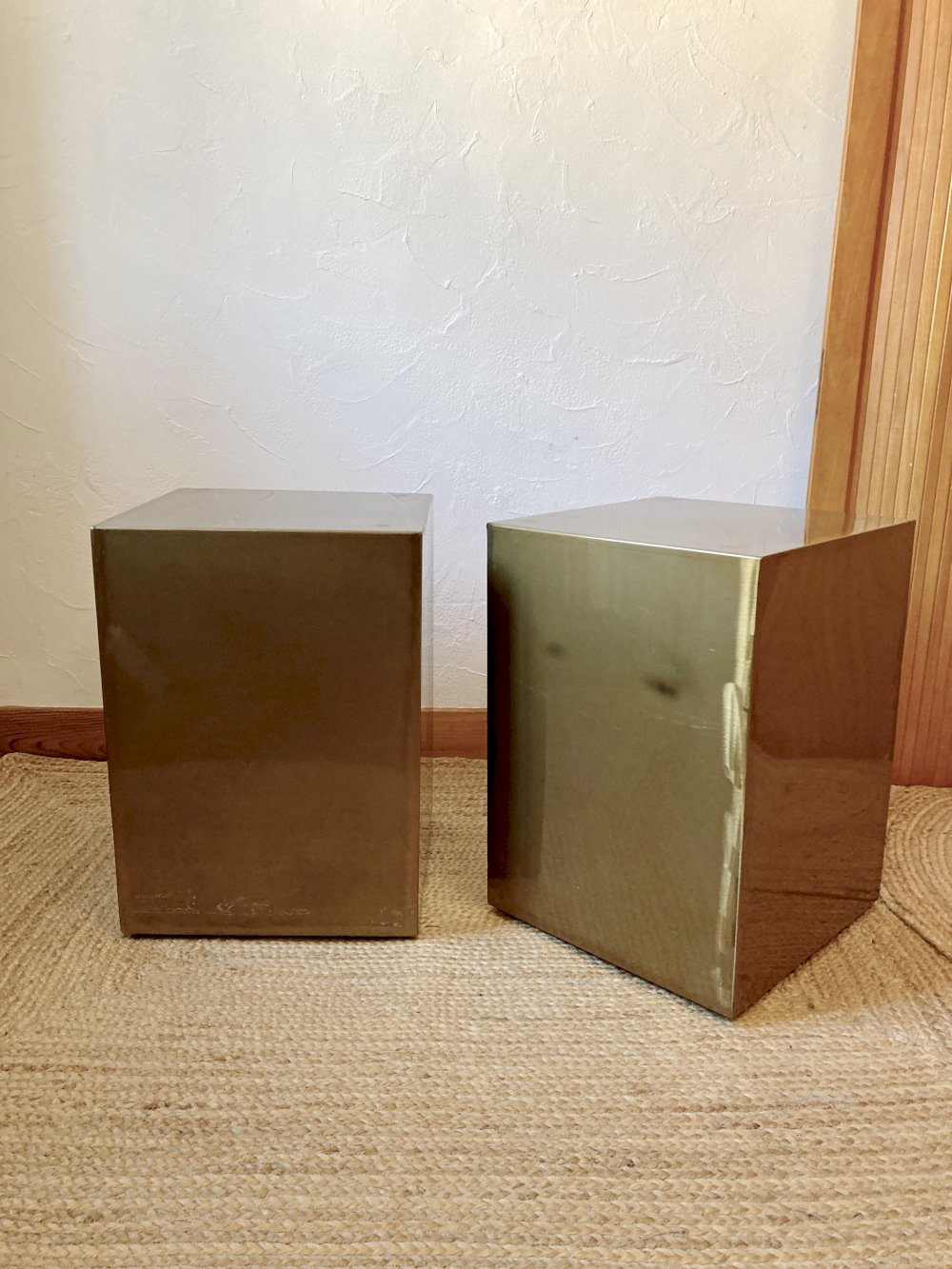 Pair of rectangular metallic seats, electroplated with a brass effect, having been used for the reception of around 1700 guests at the first Louis Vuitton Men’s collection show by Pharrell Williams in June 2024 on the Pont-Neuf in Paris (see last photo).