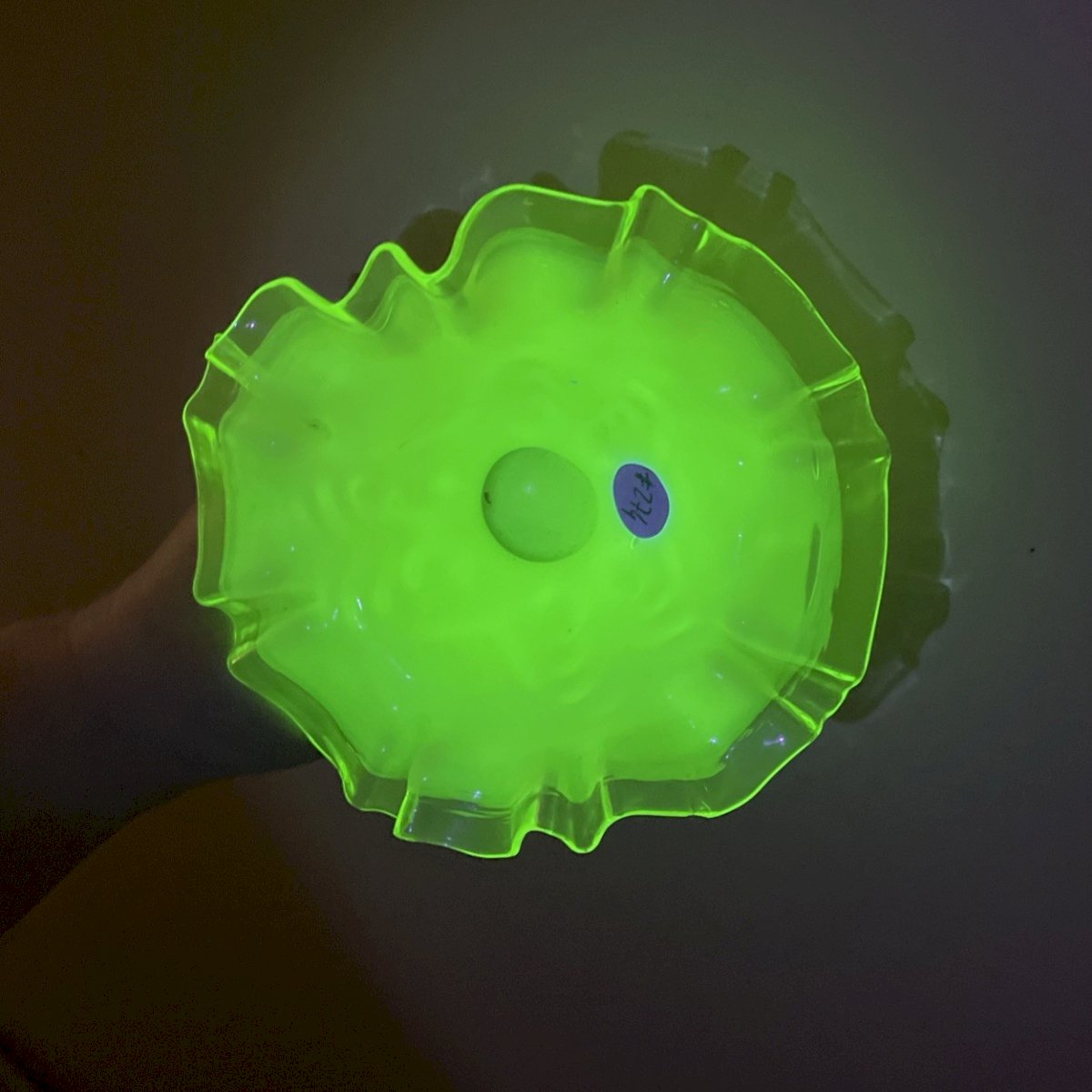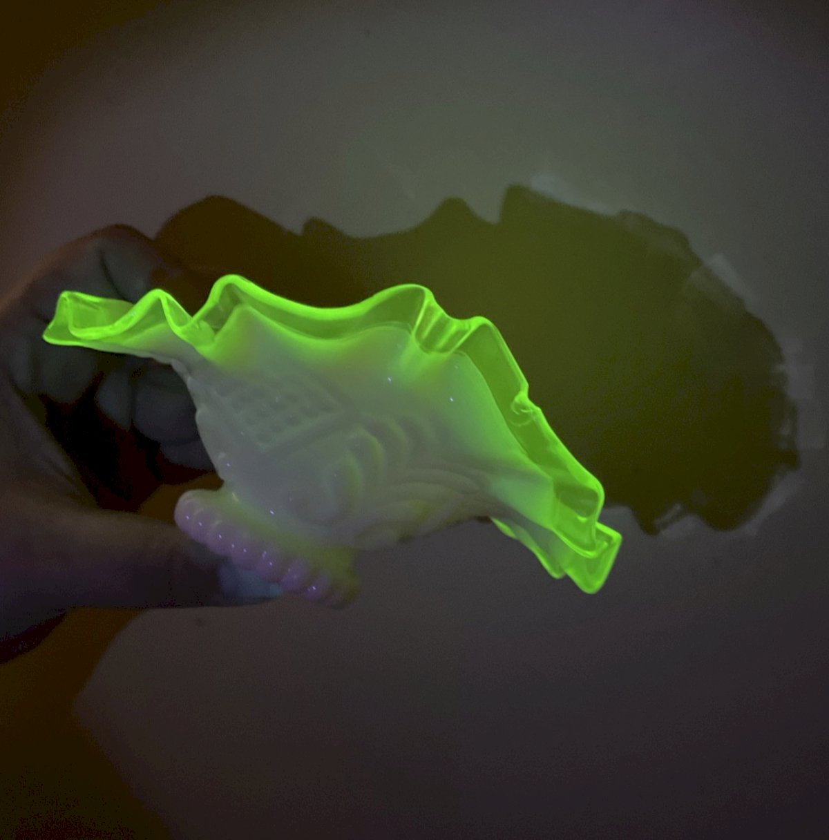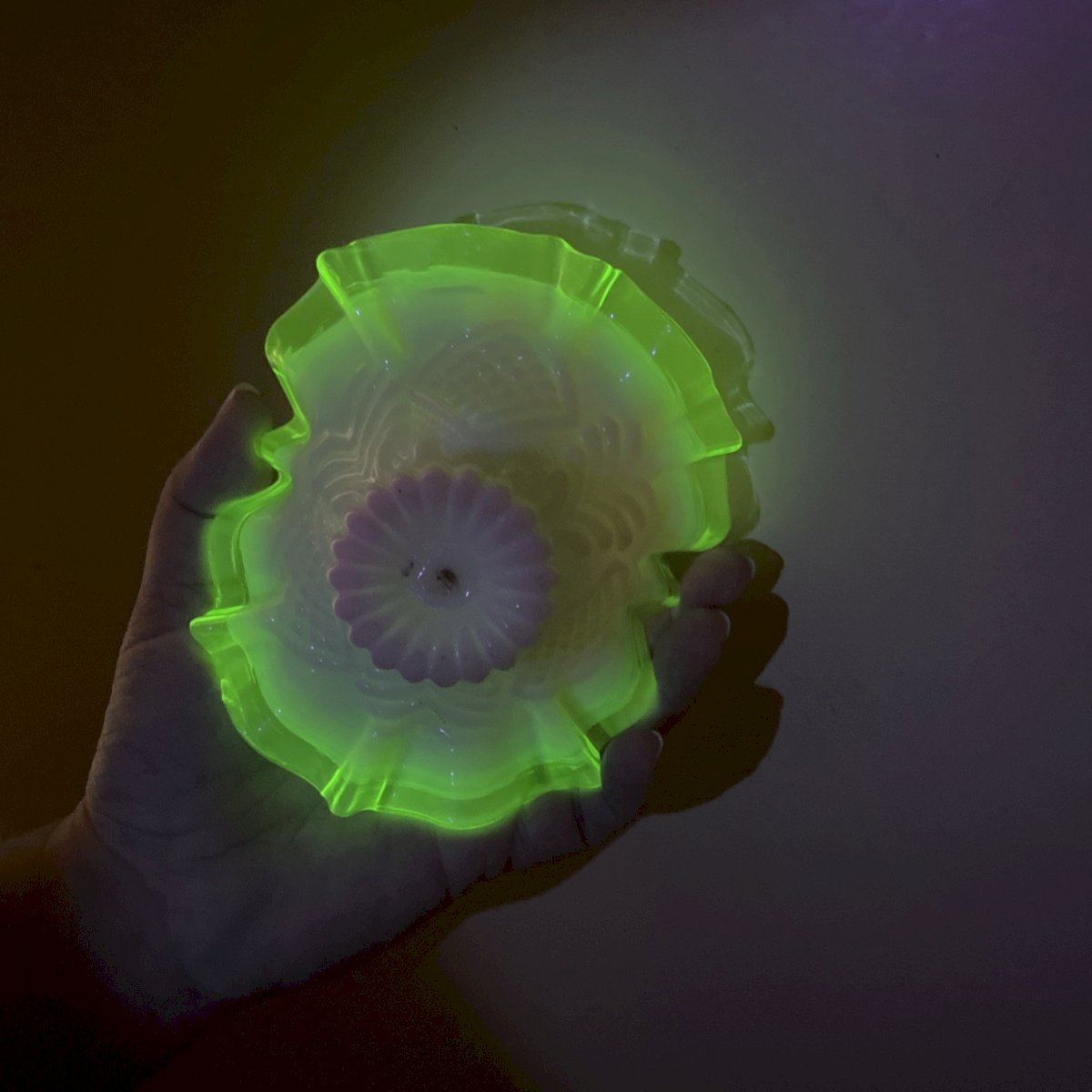 Elegant little basket bowl in white opaline glass and uranium uraline Height ~ 6.5 cm Diameter "bowl" ~ 13.5 cm Base diameter ~ 4.5 cm Total weight ~ 0.15 kg Good condition, a chip on the edge, see photos Remember to group your purchases to reduce shipping costs!