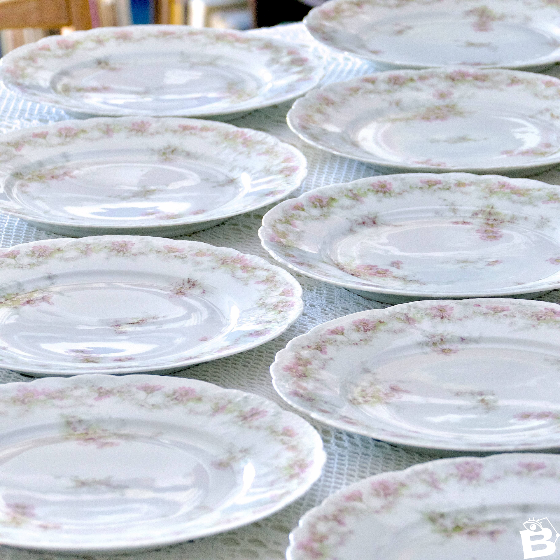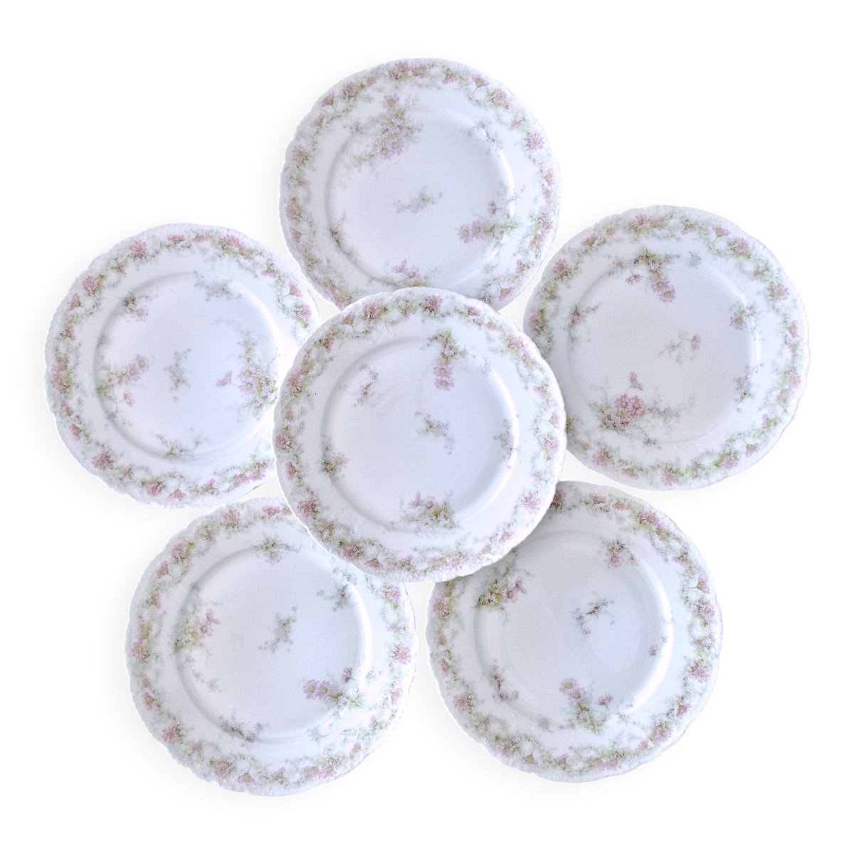 Beautiful set of antique porcelain plates stamped Emile Bourgeois Grand Dépôt, floral decoration. Charming spring floral design, a garland of small flowers like daisies and marguerites. Fine arabesque relief. For a delicate and elegant table. We have a total of 12 plates available upon request, as well as a sauceboat on a tray; see our other listings. ? 25 cm in diameter. ✨ Very careful shipping. ✨ We have other listings online, feel free to take a look! 2.8 kg / 6.05/25. L: 25 W: 25 H: 25
