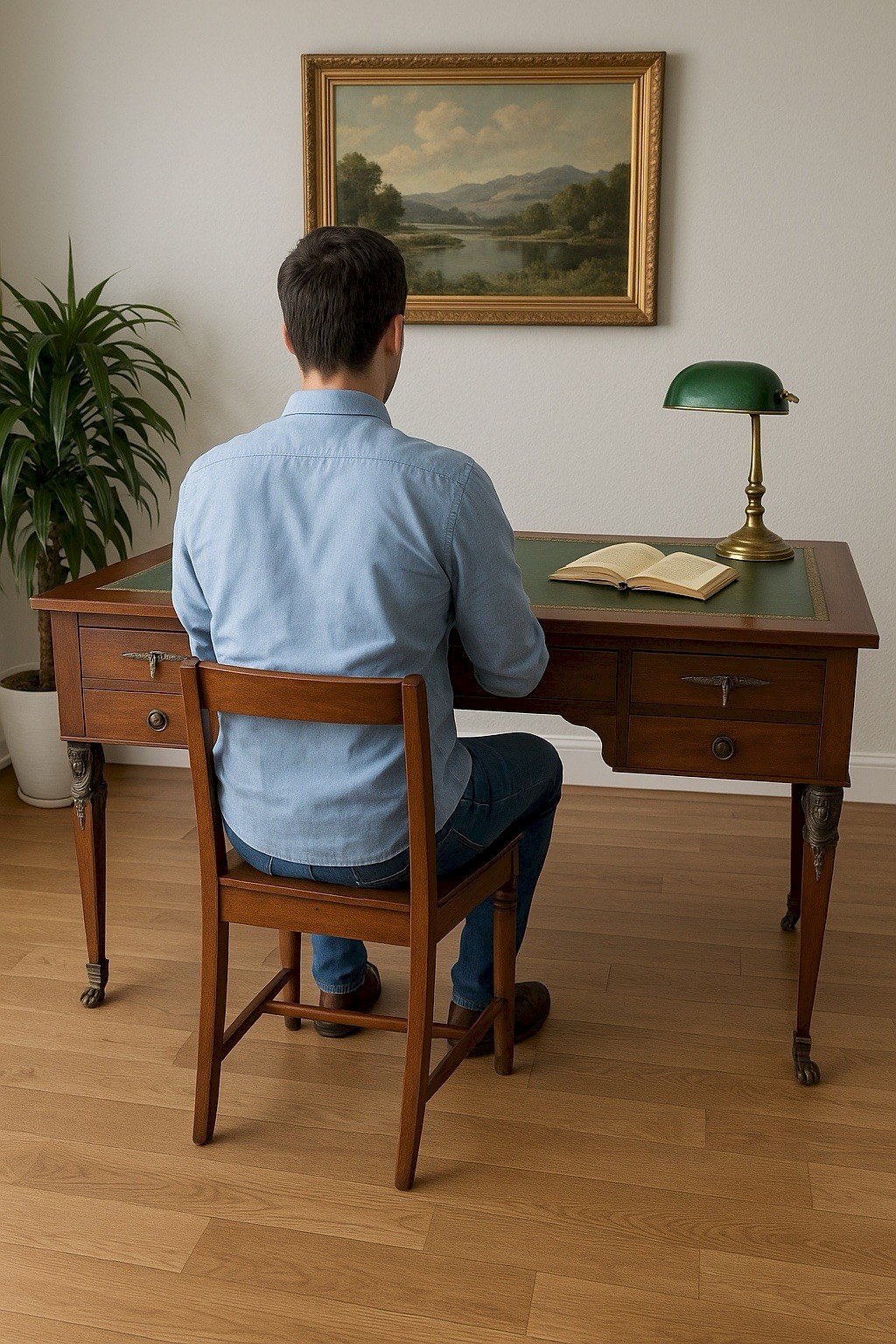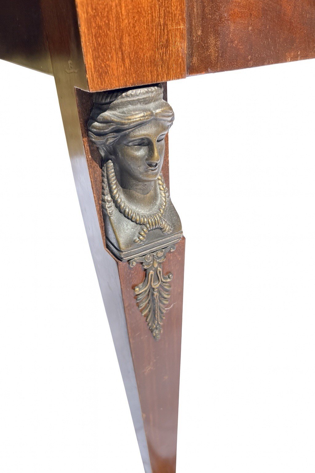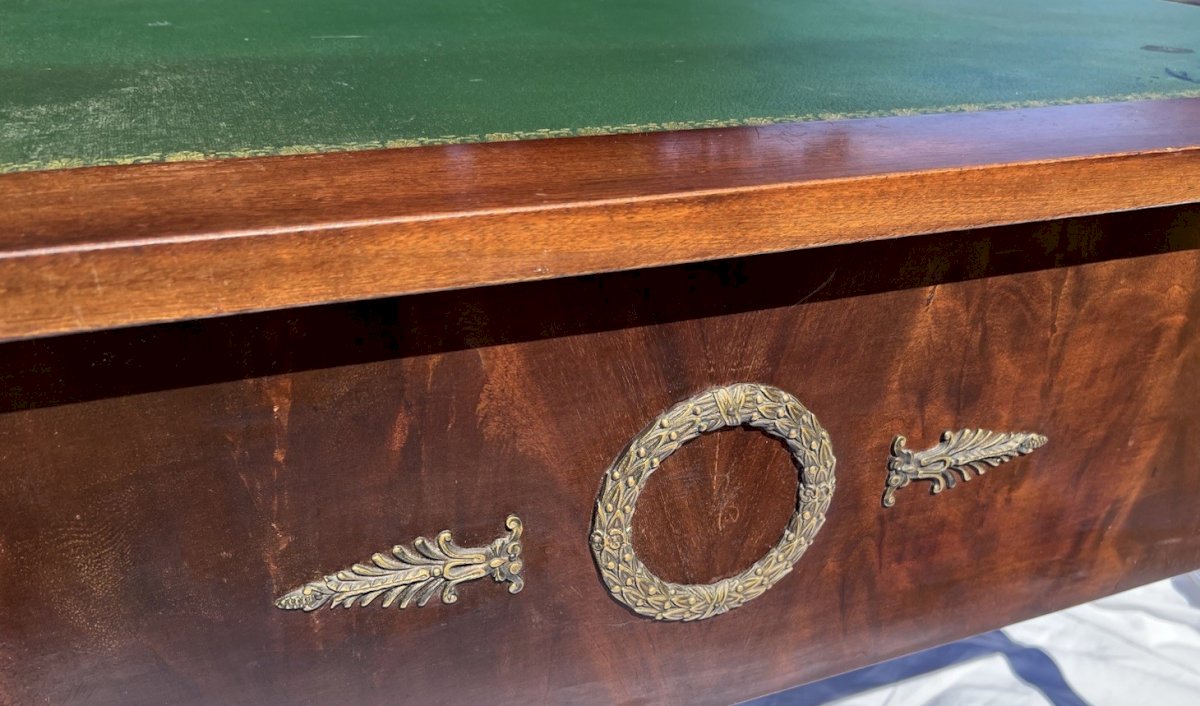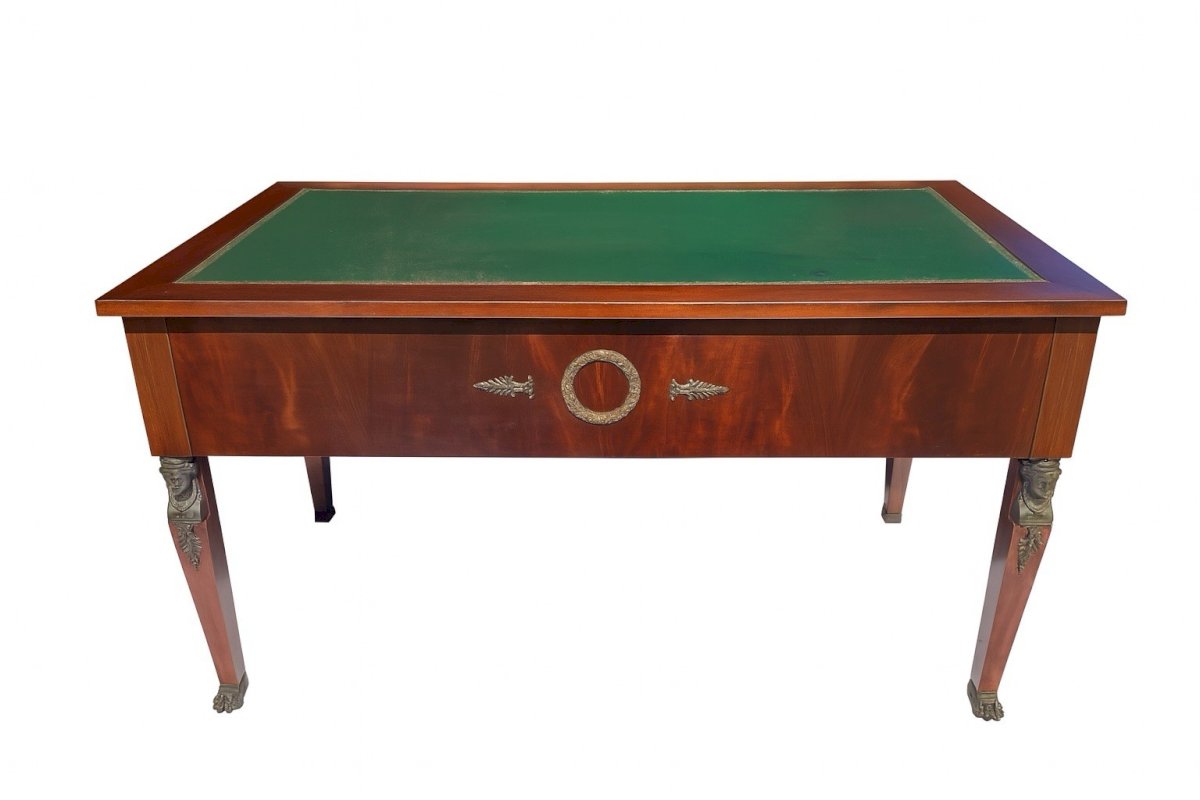 Discover this beautiful Empire-style desk, with elegant proportions and refined details, ideal for enhancing a classic interior or adding a majestic touch to an eclectic decor. ? Dimensions: • Length: 140 cm (55.1") • Width: 75 cm (29.5") • Height: 76 cm (29.9") ? Description: This solid mahogany desk features a stunning green leather top with gold decorations in an imperial frieze pattern. The leather shows some signs of aging (see photos), attesting to its authenticity. The front offers five functional drawers with handles and finely chiseled bronze lock entries in Empire style. Each leg is adorned with an antique woman’s head in gilded bronze, a symbol of imperial statuary. The feet end in bronze claws, adding a powerful touch to the furniture's silhouette. The back of the desk is also decorated, allowing for a central room placement. ? Condition: In generally good condition, with a beautiful period patina. Original leather with signs of wear (see detailed photos). A piece that is both functional and full of character, perfect for an office, library, or refined living room. ? Provenance: France, late 19th century. Material: Bronze Style: Napoleon III