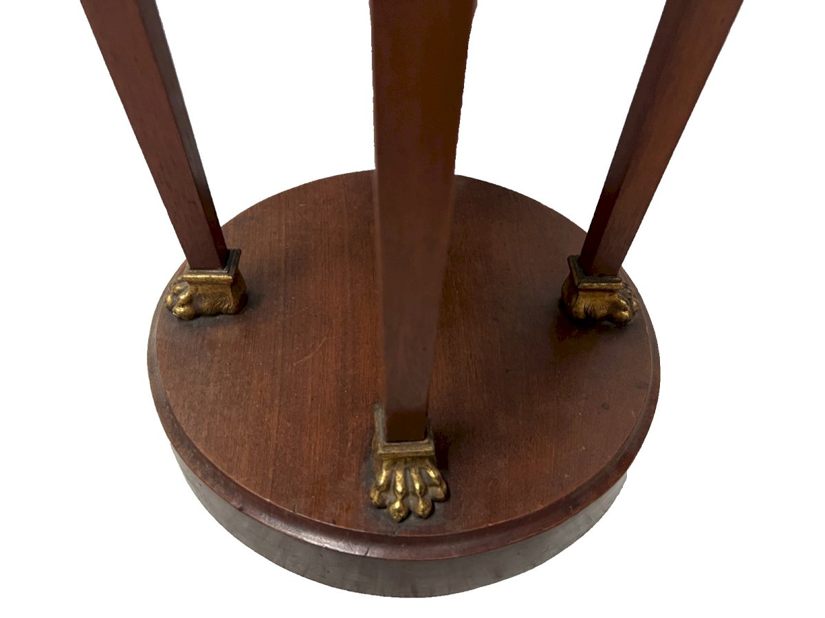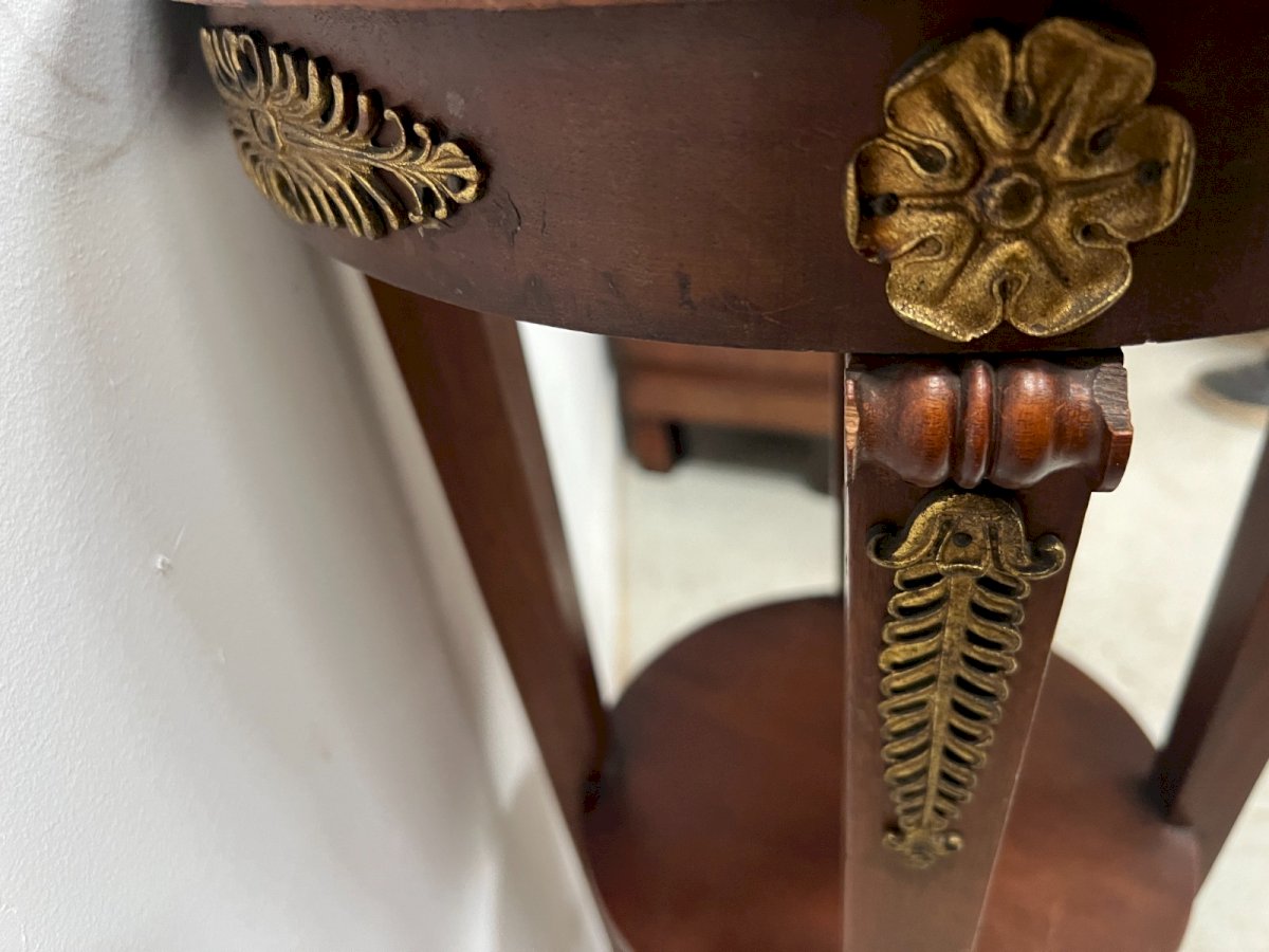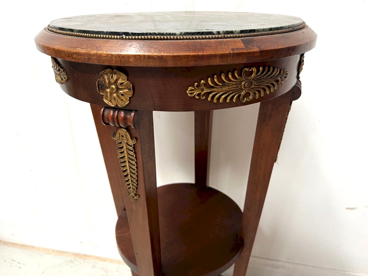 Empire style conical side table in mahogany and veneer Four legs in sheath with a crotch shelf Round base Top in sea green marble Beautiful ornamentation of palm leaves and a rosette in chiselled bronze Very good condition Dimensions H 82 cm x 41 cm in diameter 20th century Type: side table Country of manufacture: France Height: 82 Material: Mahogany Length: 41 Width: 41 Shape: Round
