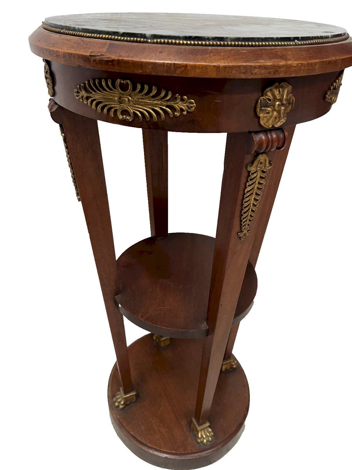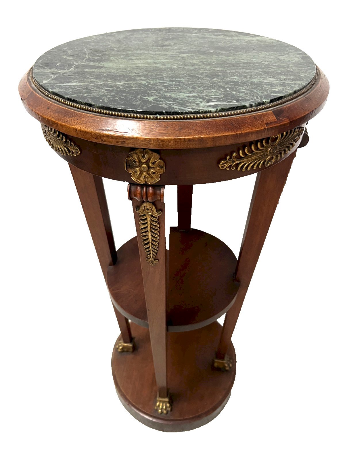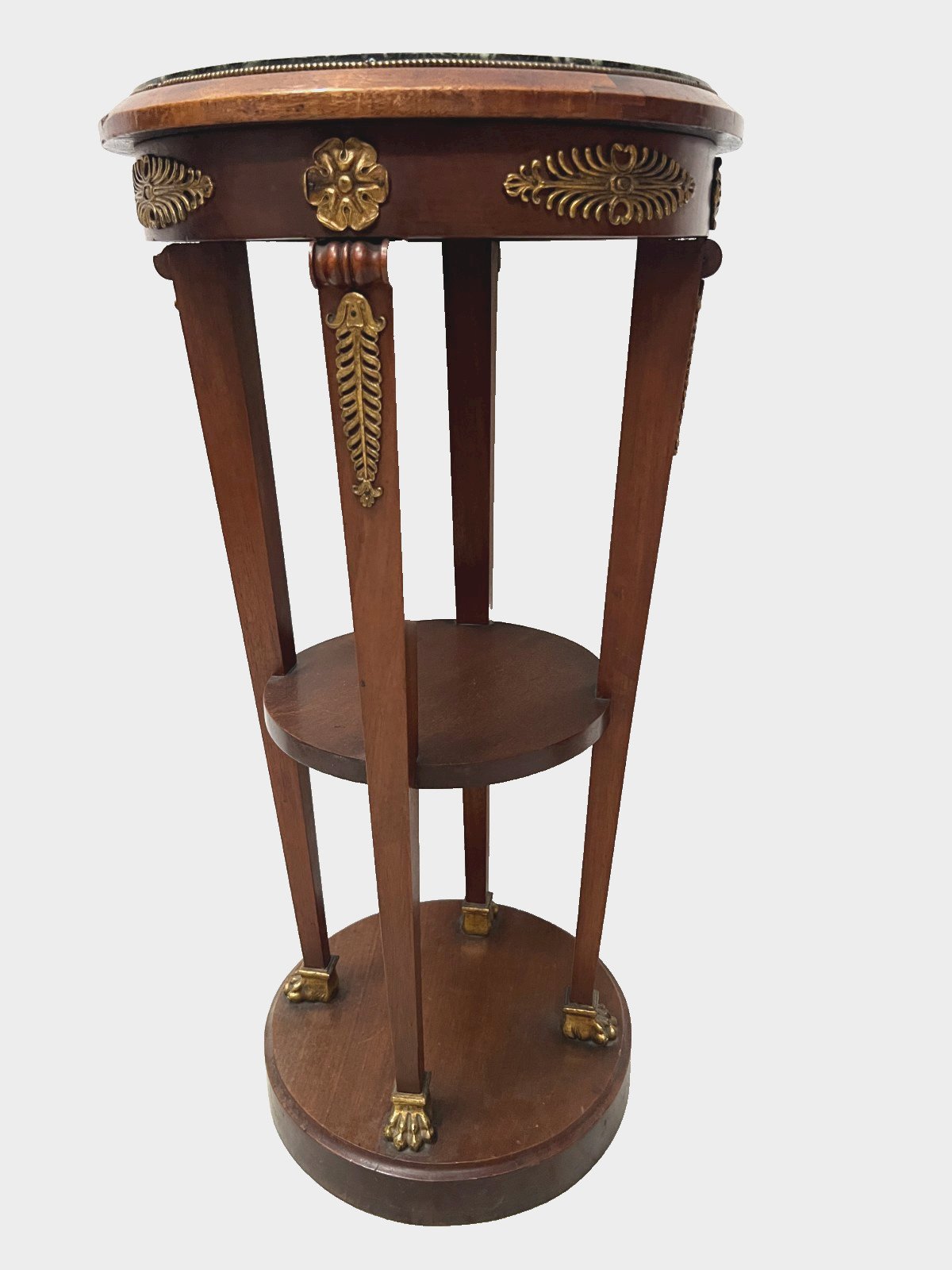 Empire style conical side table in mahogany and veneer Four legs in sheath with a crotch shelf Round base Top in sea green marble Beautiful ornamentation of palm leaves and a rosette in chiselled bronze Very good condition Dimensions H 82 cm x 41 cm in diameter 20th century Type: side table Country of manufacture: France Height: 82 Material: Mahogany Length: 41 Width: 41 Shape: Round