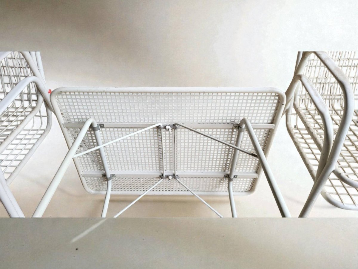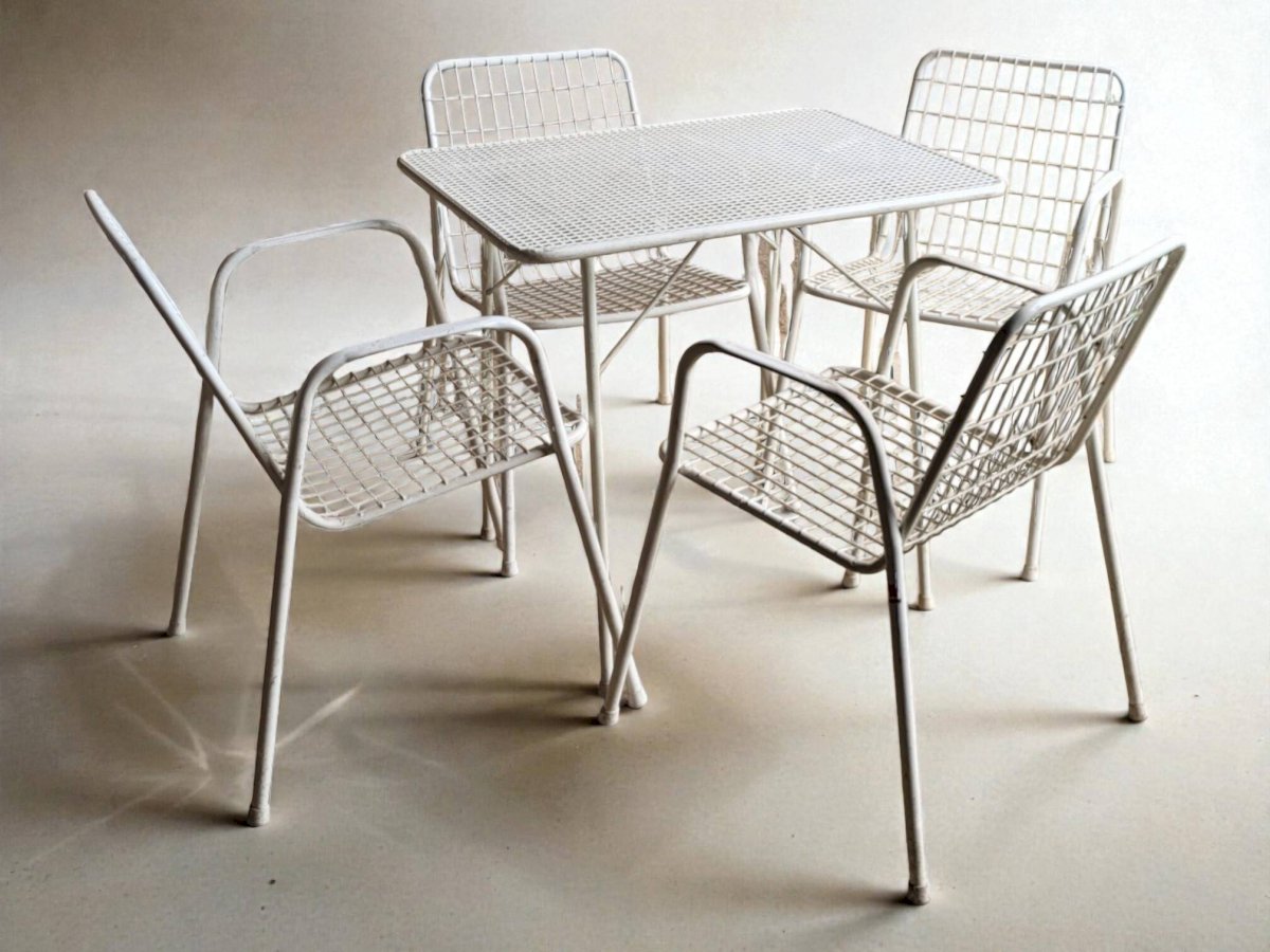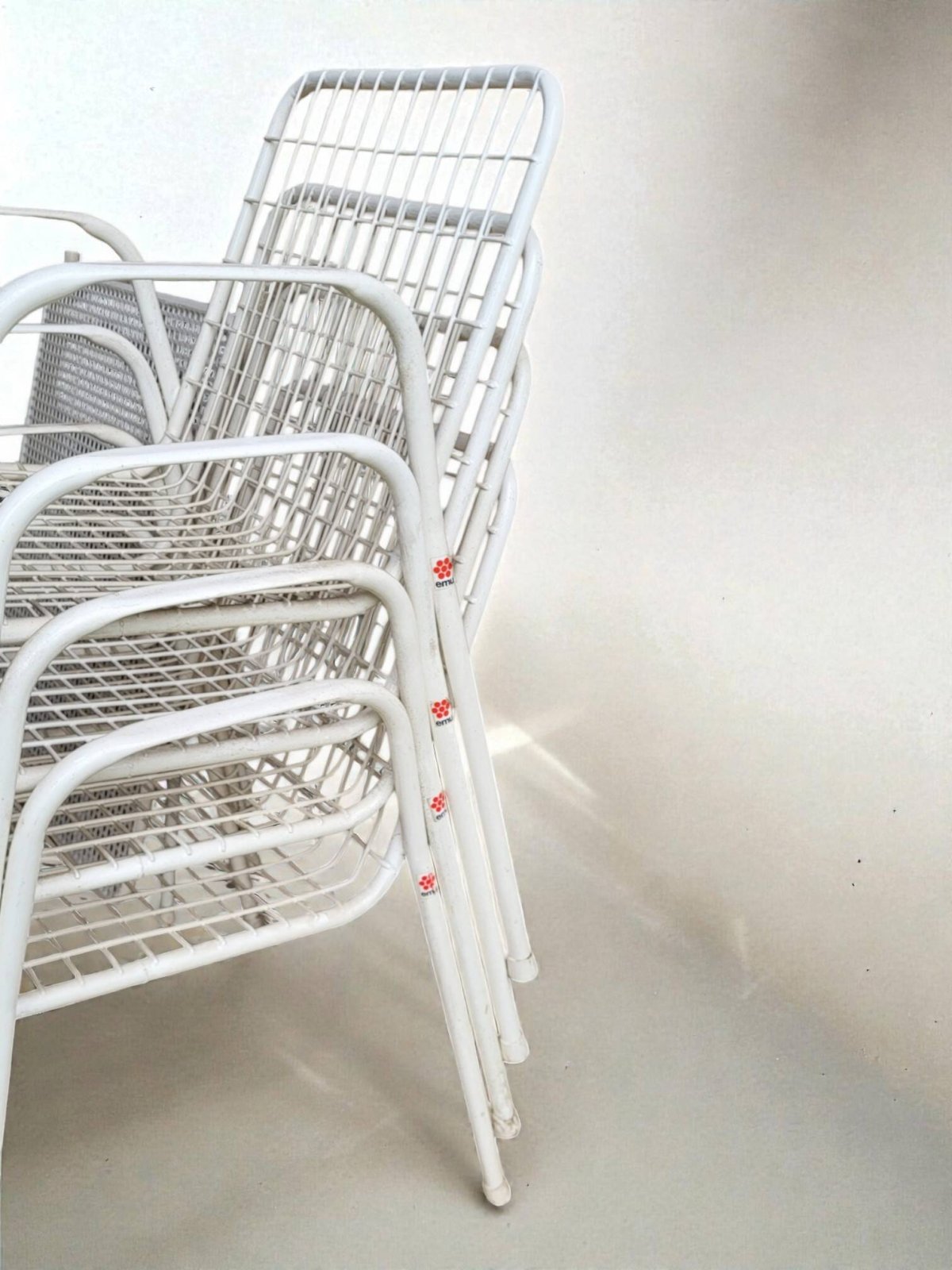 EMU outdoor furniture set including 4 armchairs and 1 table. This is the RIO model, emblematic of the brand. The model was launched in 1968.