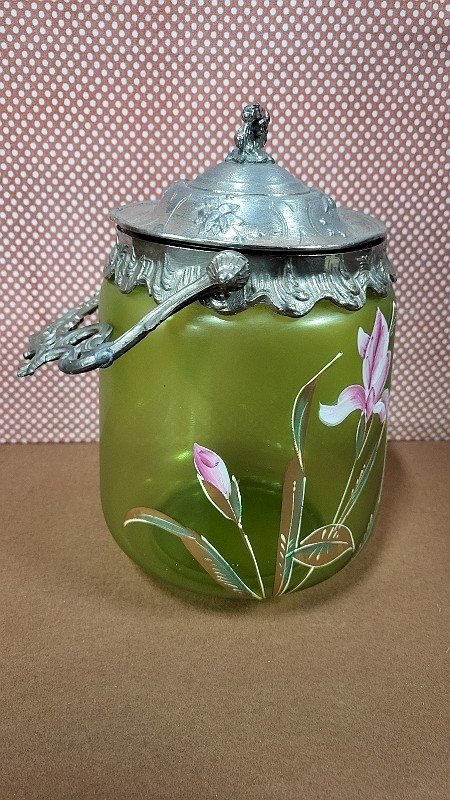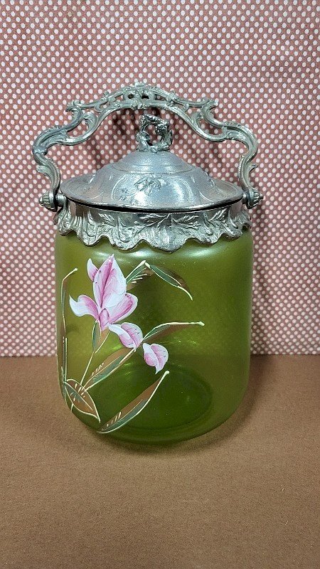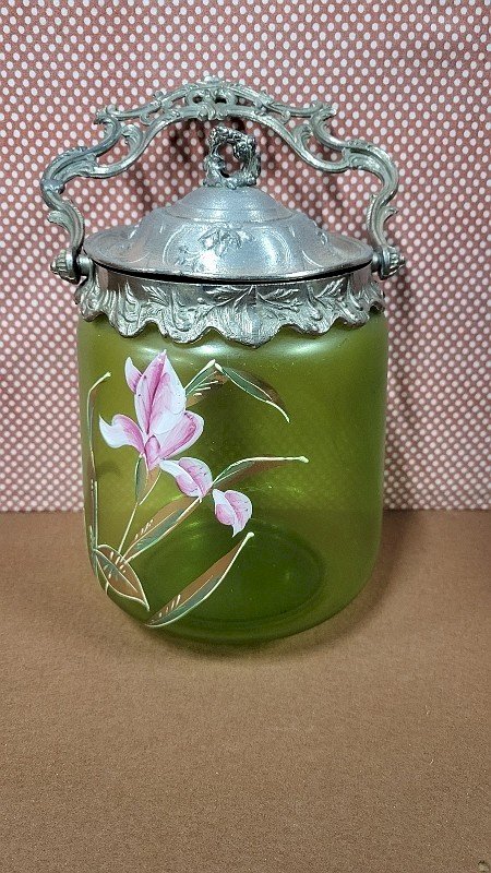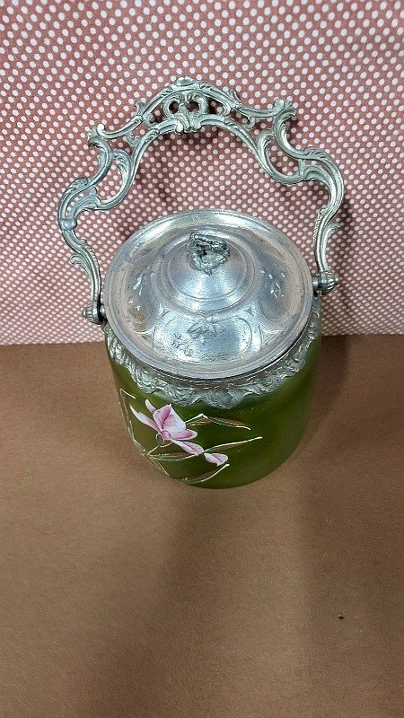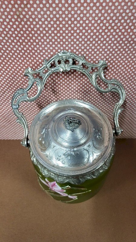 very nice and old enameled glass biscuit bucket with floral decoration, with lid and handles in regular it is in good condition, it is a very nice model of good quality, it measures 28 cm high and 13.5 cm in diameter for the body Type: Tableware, Kitchen Subtype: BISCUIT BUCKET Material: Glass