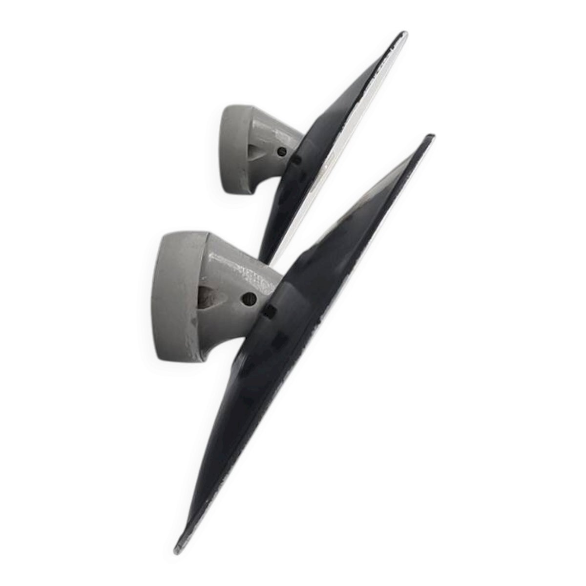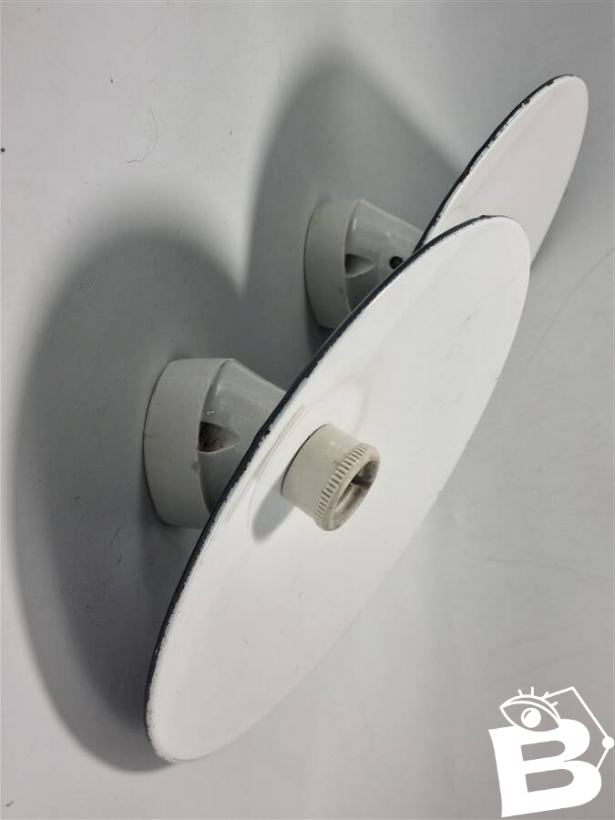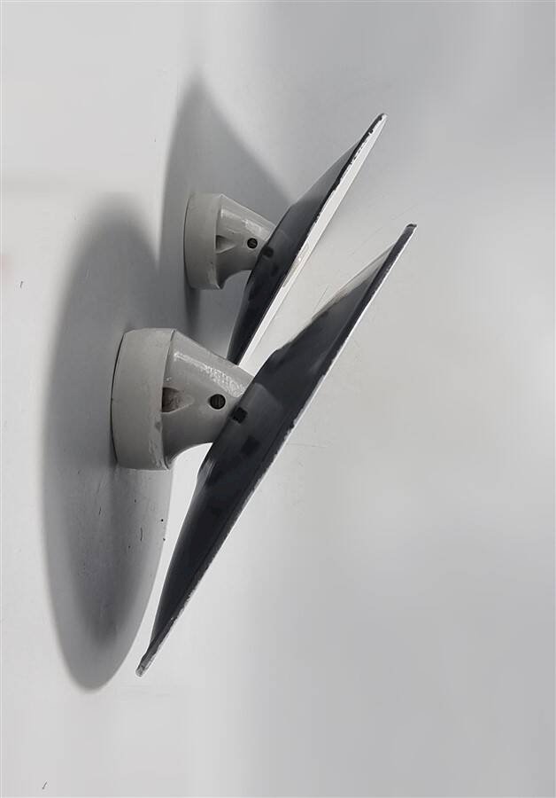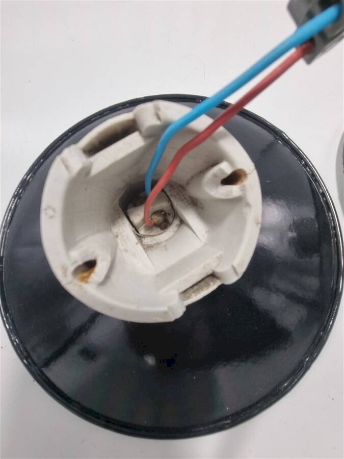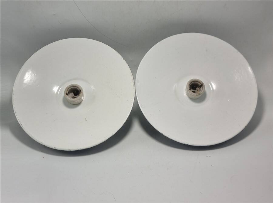 Pair of wall sconces in black enameled sheet metal with white porcelain mounting bases. B22 sockets (easy to find LED bulbs with bayonet). Height: 22 cm. Width: 24 cm. Depth: 14 cm. Weight: 800 g. L: 24 W: 14 H: 22