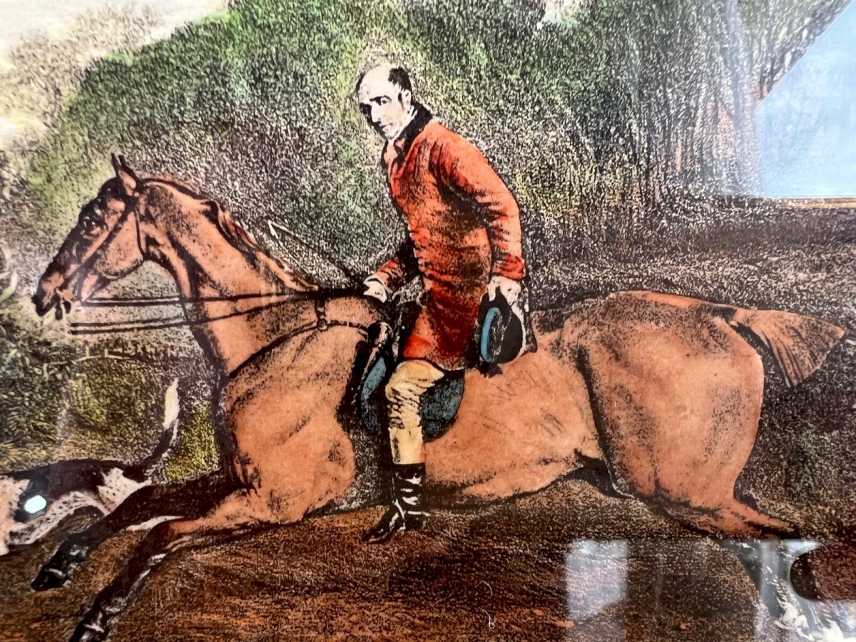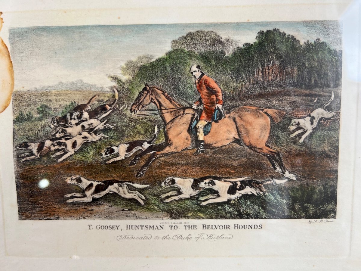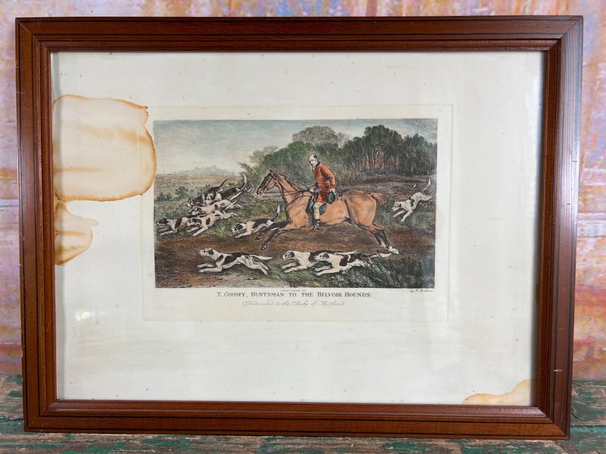 Antique engraving 1815 – T. Goosey, huntsman of the Belvoir Hounds – signed R. B. Davis – Fox hunting – framed – 38 x 28 cm Discover an authentic antique English engraving, published in London in 1815, and dedicated to the Duke of Rutland. This dynamic work features T. Goosey, the famous huntsman of the Belvoir Hounds, caught in a lively hunting scene, accompanied by his pack of hounds. This engraving was created by R. B. Davis, a well-known animal painter of the early 19th century, particularly appreciated for his hunting scenes and equestrian representations. Details: Title: T. Goosey, Huntsman to the Belvoir Hounds – Dedicated to the Duke of Rutland Artist: R. B. Davis Publication date: 1815 (London) Technique: Hand-colored engraving Dimensions with frame: 38 cm x 28 cm (15’’ x 11’’) Framing: Period wooden frame with glass Condition: Period engraving showing visible moisture stains (top left and bottom right), but central image well preserved – sold as is with its certificate of authenticity A rare historical document, with a sincere patina, that will appeal to fans of fox hunting, equestrian decoration, or enthusiasts of British history. Careful shipping with reinforced protection. Type: Engraving Support: On paper Genre: Classicism Features: Signed Theme: Hunting, Fishing