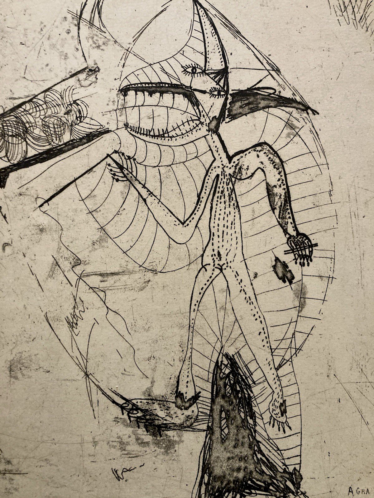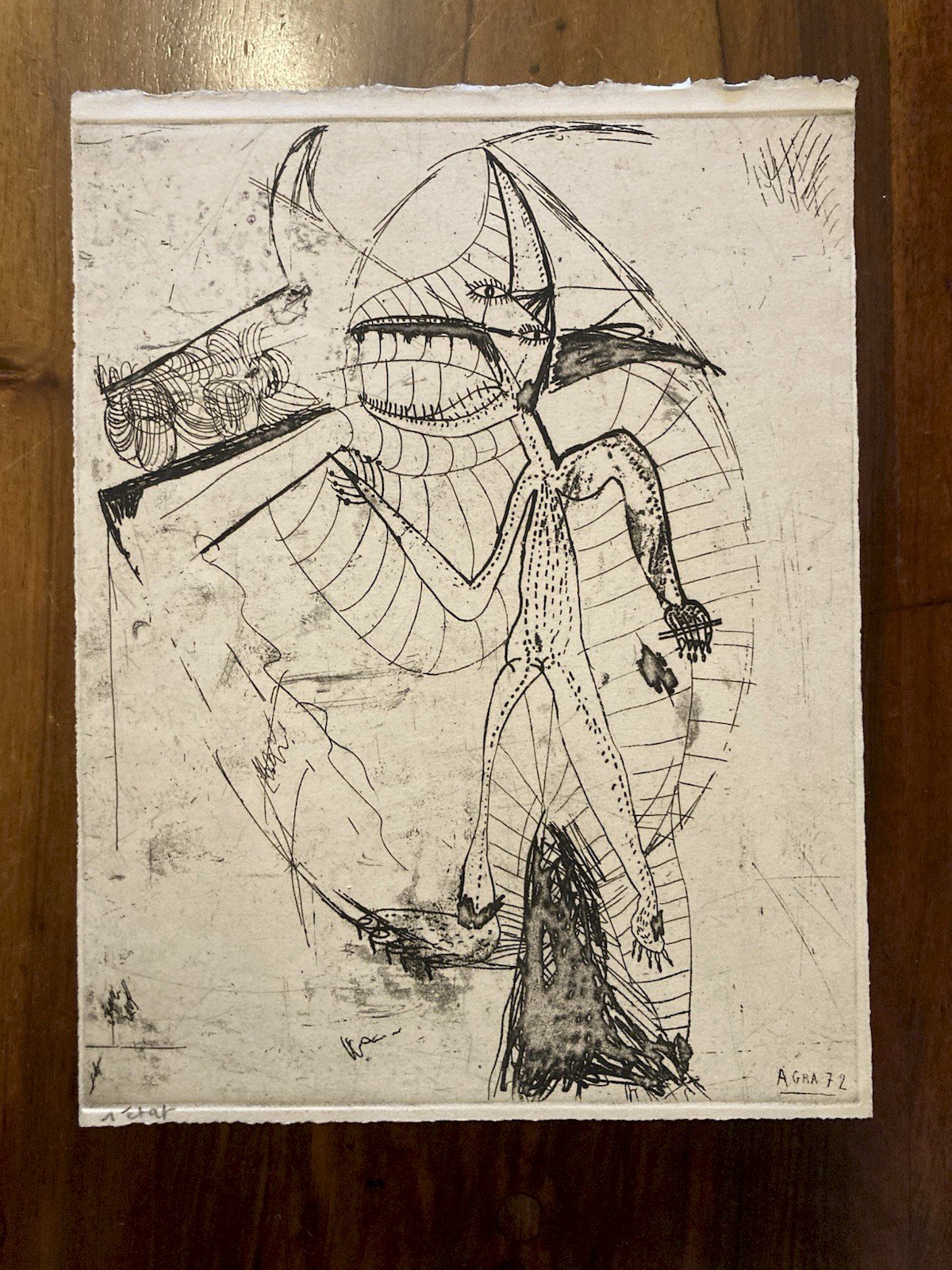 Very beautiful engraving, done in drypoint by the little-known artist Antoine Agra, showcasing great mastery of engraving. Overall good condition. Recommended products. Provided by Type: Engraving Country of origin: France Style: 1970 Genre: Surrealism.