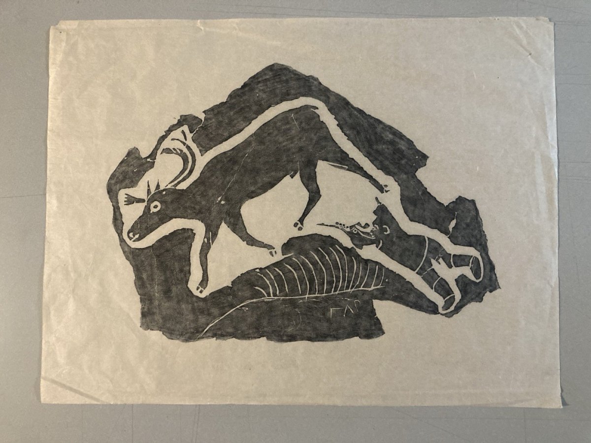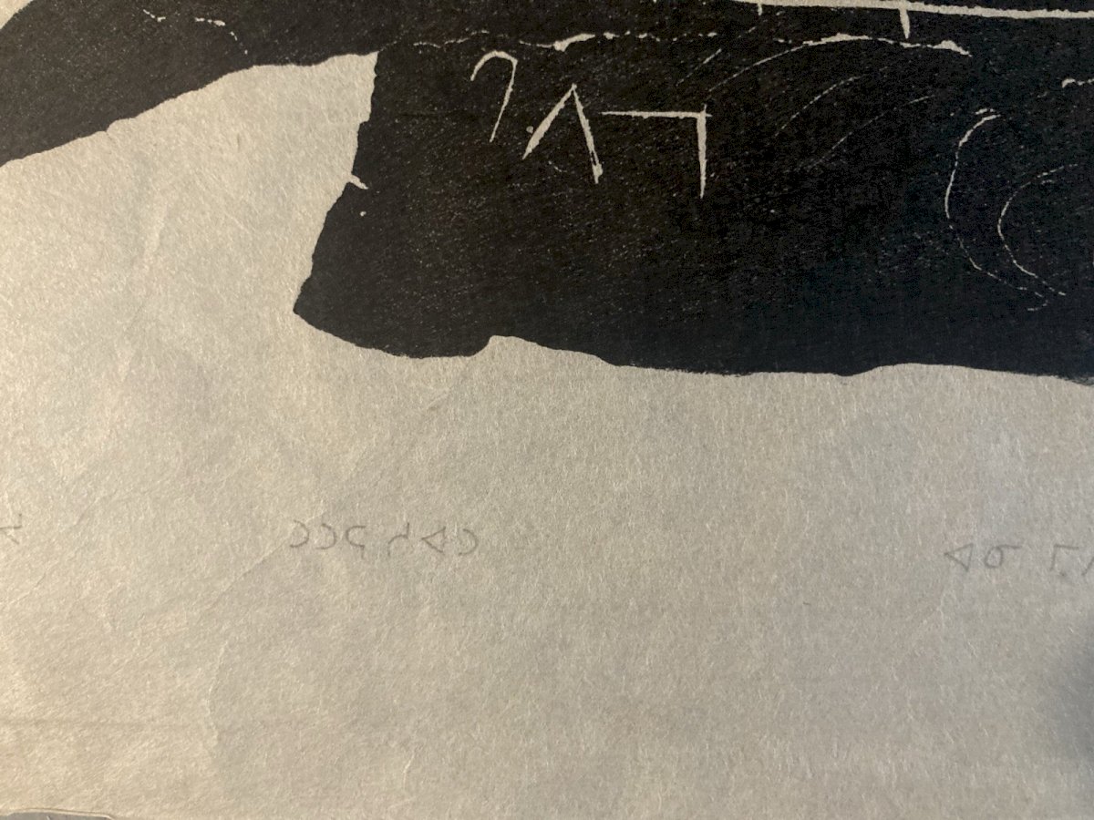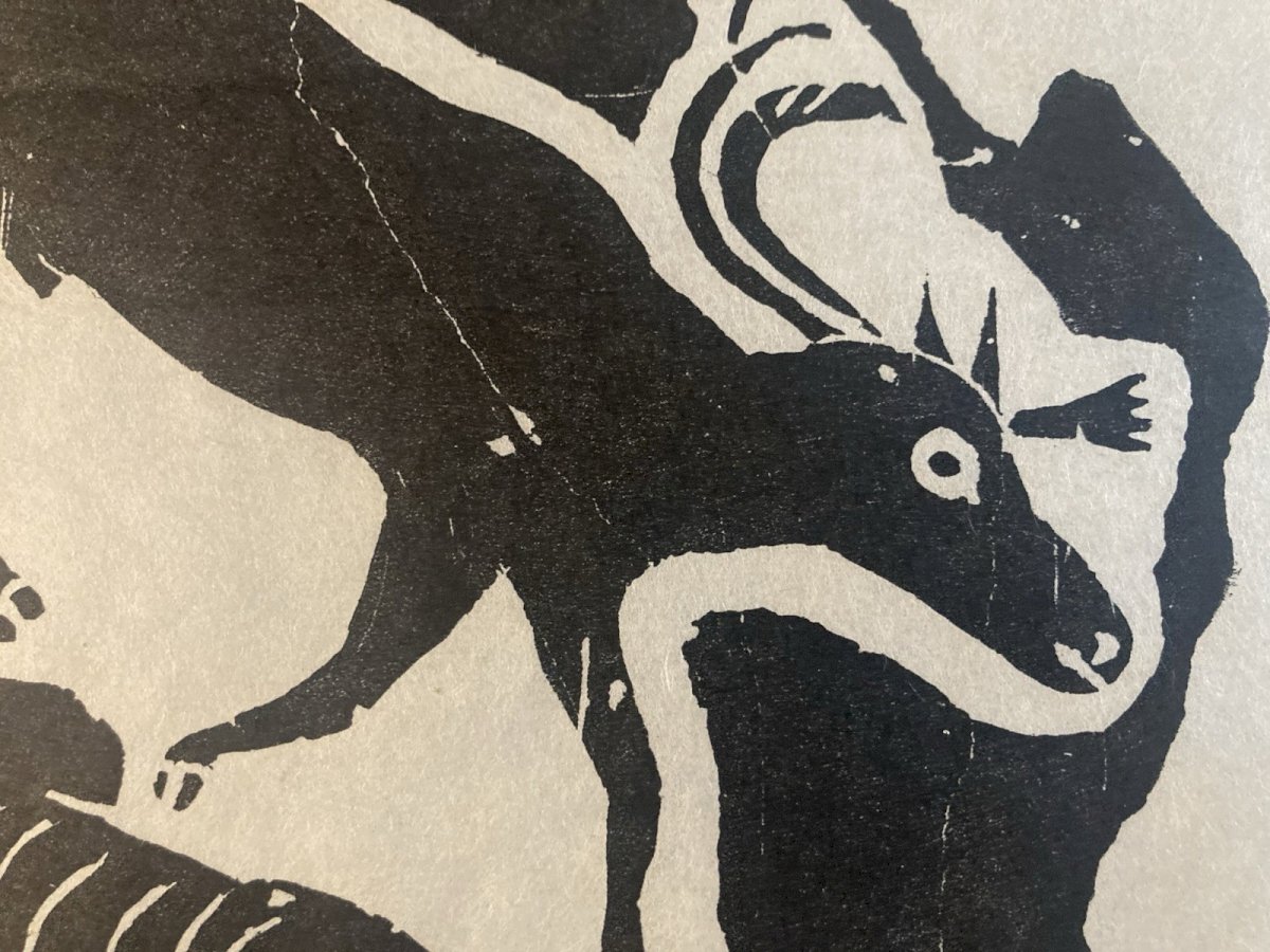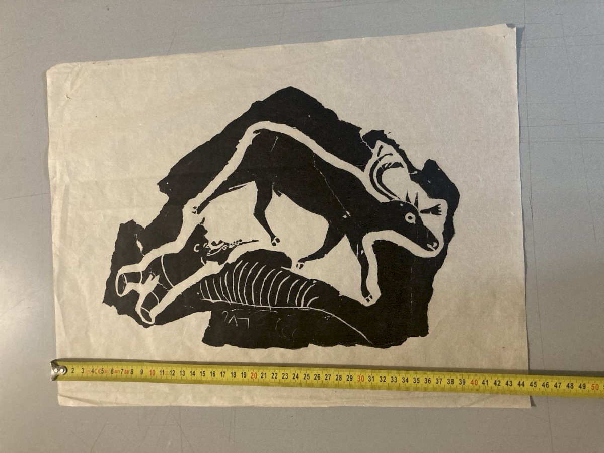 Description of the work Generally in good condition, see photo, the engraving is noted in pencil at the bottom of the image, see photo This is an engraving on paper, created in the 1960s by Inuit artist Annie Mikpiga (1900-1984). The composition, in black on a white background, represents a reindeer hunting scene: a leaping reindeer can be discerned and, below, an animal silhouette (probably a dog or a predator) as well as a stylized hunter. The intentionally stripped-down and contrasted graphic style evokes both the Inuit narrative tradition and a modern aesthetic of printed images. The work reflects the importance of hunting in the daily and spiritual life of Arctic communities, while also showcasing the artistic sensitivity unique to 20th-century Inuit engravers. ⸻ Biography of Annie Mikpiga (1900-1984) Annie Mikpiga (also spelled Annie Mikpigaq) was an Inuit artist born in 1900 and passed away in 1984. Originally from Nunavik (Quebec Arctic), she belongs to the first generation of Inuit creators whose drawings and engravings were disseminated beyond their community starting in the 1950s-1960s, notably thanks to art cooperatives. She specialized in engraving and drawing on paper, developing a refined style with bold and symbolic forms that draw from traditional narratives and scenes: hunting, Arctic animals, legends. Her work is part of the broader movement of the renaissance of graphic Inuit art that emerged in Canada in the mid-20th century, supported by initiatives to promote it in the international art market. Her works, now rare, are valuable testimonies of the visual transmission of Inuit knowledge and myths. They have been presented in several group exhibitions and are featured in some private and museum collections dedicated to Inuit art from Quebec and Canada. Recommended Products Provided by Style:1940-1960 Genre:Outsider art, Raw art Features:On Paper Theme:Character Country of origin:France