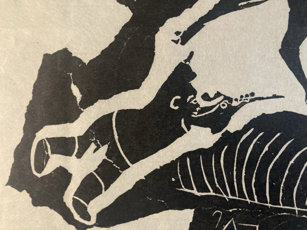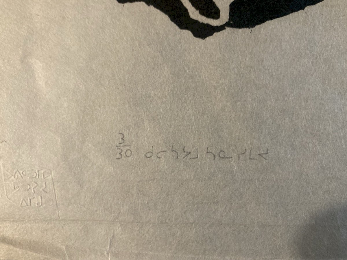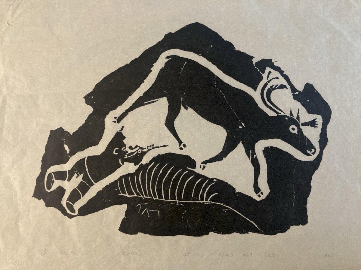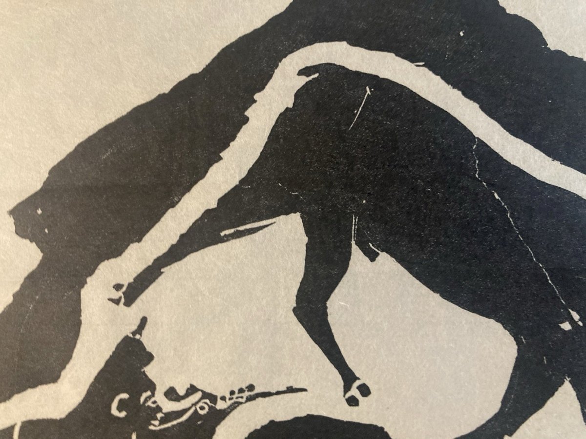 Description of the work Generally in good condition, see photo, the engraving is noted in pencil at the bottom of the image, see photo This is an engraving on paper, created in the 1960s by Inuit artist Annie Mikpiga (1900-1984). The composition, in black on a white background, represents a reindeer hunting scene: a leaping reindeer can be discerned and, below, an animal silhouette (probably a dog or a predator) as well as a stylized hunter. The intentionally stripped-down and contrasted graphic style evokes both the Inuit narrative tradition and a modern aesthetic of printed images. The work reflects the importance of hunting in the daily and spiritual life of Arctic communities, while also showcasing the artistic sensitivity unique to 20th-century Inuit engravers. ⸻ Biography of Annie Mikpiga (1900-1984) Annie Mikpiga (also spelled Annie Mikpigaq) was an Inuit artist born in 1900 and passed away in 1984. Originally from Nunavik (Quebec Arctic), she belongs to the first generation of Inuit creators whose drawings and engravings were disseminated beyond their community starting in the 1950s-1960s, notably thanks to art cooperatives. She specialized in engraving and drawing on paper, developing a refined style with bold and symbolic forms that draw from traditional narratives and scenes: hunting, Arctic animals, legends. Her work is part of the broader movement of the renaissance of graphic Inuit art that emerged in Canada in the mid-20th century, supported by initiatives to promote it in the international art market. Her works, now rare, are valuable testimonies of the visual transmission of Inuit knowledge and myths. They have been presented in several group exhibitions and are featured in some private and museum collections dedicated to Inuit art from Quebec and Canada. Recommended Products Provided by Style:1940-1960 Genre:Outsider art, Raw art Features:On Paper Theme:Character Country of origin:France