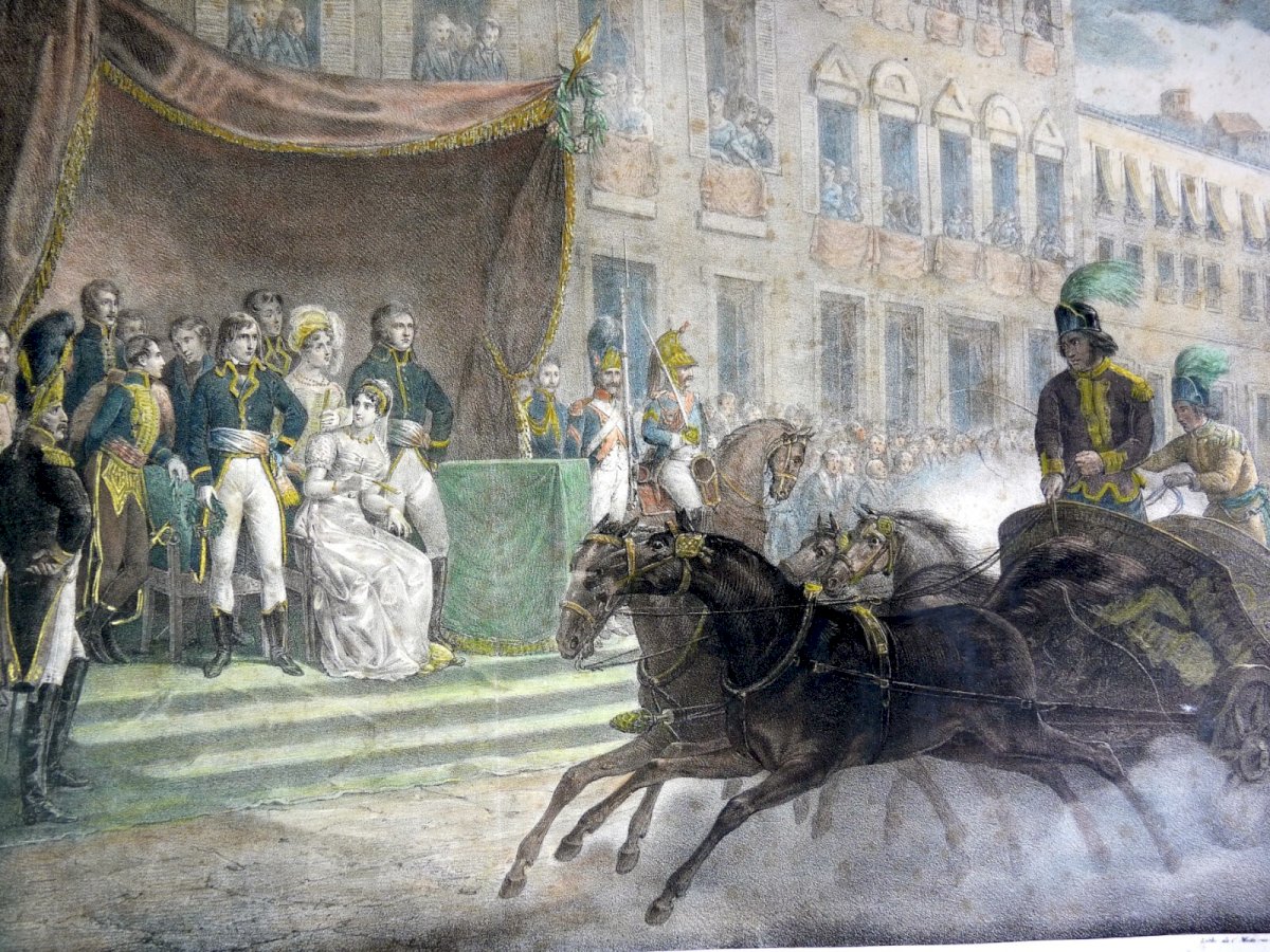 Enhanced engraving colors XIX FESTIVAL in MILAN - NAPOLEON after Aubry, Ch. Motte. Overall good condition, some tears on the edges, see photos. Dimensions of view: 44.5 x 33 cm, Dimensions of paper support: 54 x 44 cm. Authenticity: Original Type: Engraving Period: XIX century and before Support: On paper Genre: Classicism Characteristics: Signed Theme: History, War