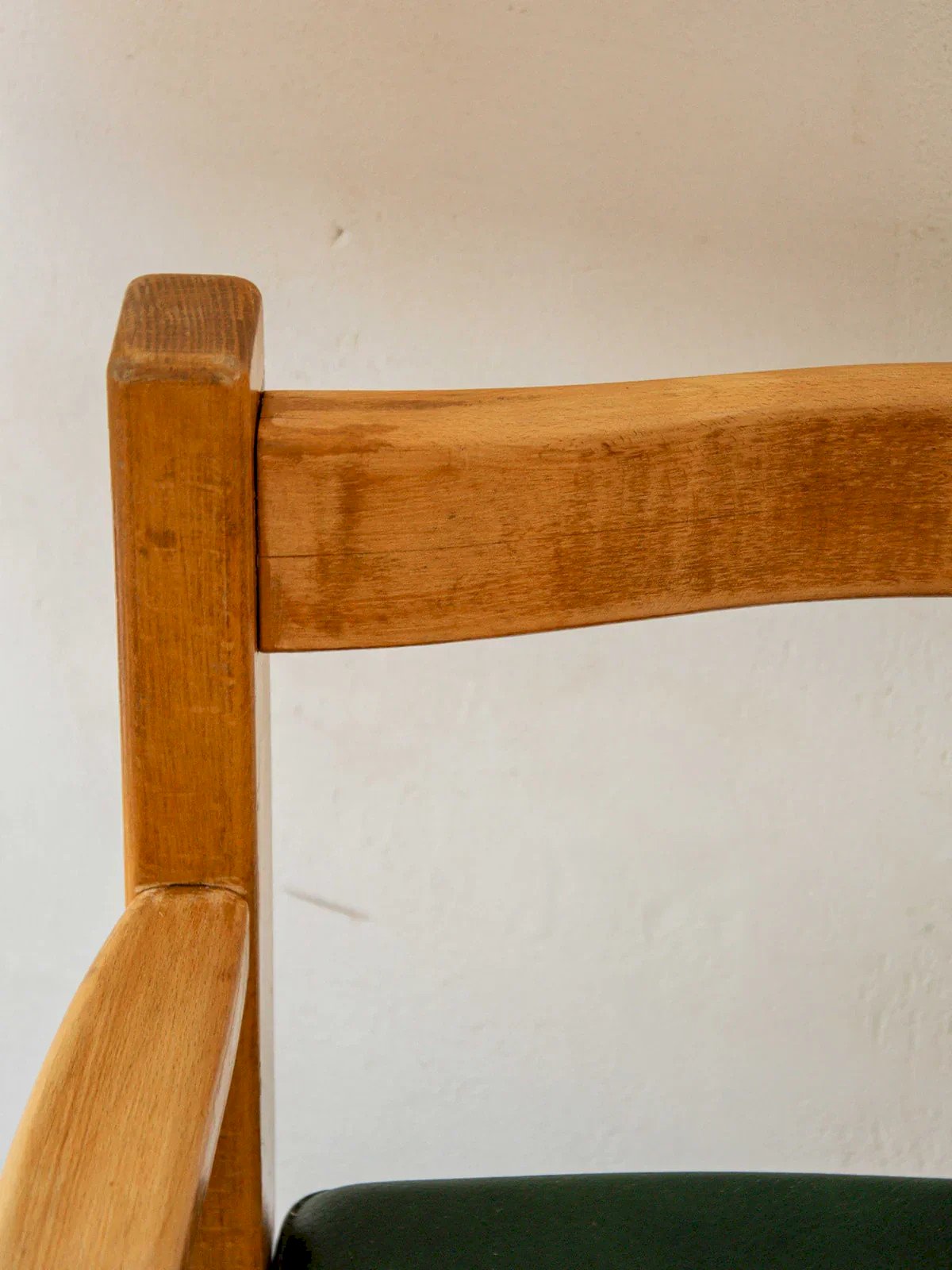 This armchair made of solid elm captivates with the beauty of its warm wood and its simple yet bold lines. The green faux leather seat, both retro and easy to maintain, adds a touch of elegant color. Sturdy and comfortable, it fits seamlessly into both vintage and contemporary interiors. The visible grain patterns of the wood, shown in the photo, testify to the quality of the material and the care taken in its production. Length: 54 cm Width: 46 cm Height: 82 cm Seat height: 52 cm Condition: Used: An item that has been used. Item showing some signs of superficial wear... Used: An item that has been used. Item showing some signs of superficial wear, fully operational and working correctly. It may be a demonstration model or an item returned to the store after a short period of use. Any imperfections: Color: Multicolor Height: Faux leather, Wood Width: Armchairs and lounge chairs Brand: Debongout Type: Vintage product Material: Faux leather, Wood Style: Country
