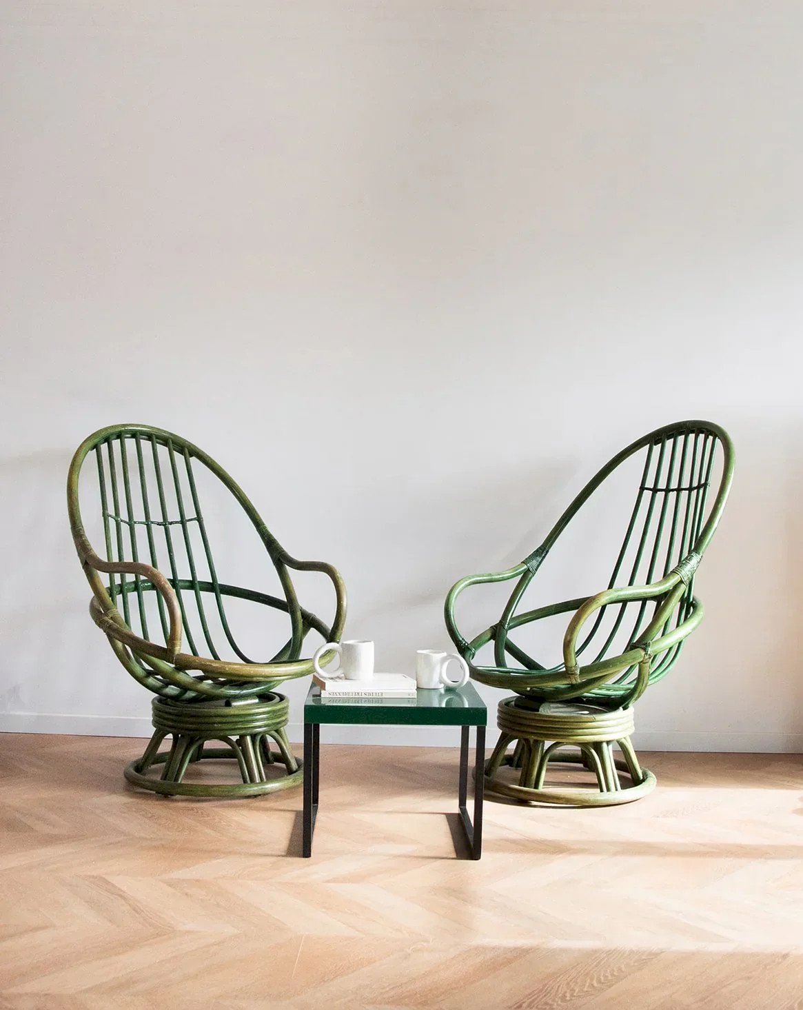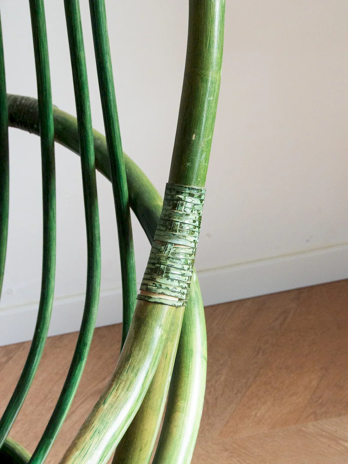 Discover this green rattan swivel chair with natural and vintage charm. Its bamboo structure brings lightness and originality, while the rattan emphasizes their authenticity. The rounded backrest provides comfort and softness, inviting relaxation. The swivel system adds a practical and playful touch to the design. A unique seat that combines style, comfort, and exotic character. Available in 2 quantities sold individually. Length: 73 cm Width: 85 cm Height: 113 cm Seat height: 38 cm Condition: Used: Item that has been used. Item showing some superficial signs of wear, fully operational and functioning correctly. It may be a demonstration model or an item returned to the store after a short period of use, with possible imperfections. Color: Multicolor Height: Bamboo, Rattan Width: Armchairs and lounge chairs Brand: Debongout Type: Vintage product Material: Bamboo, Rattan Style: Country