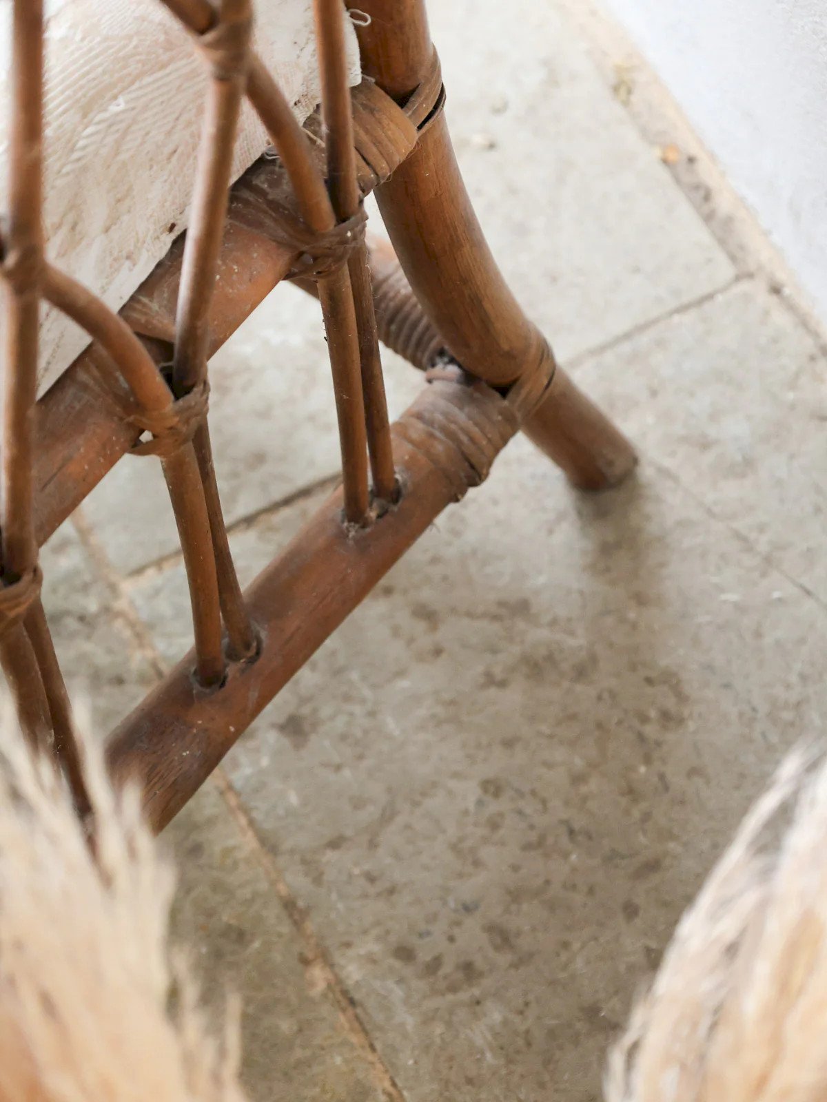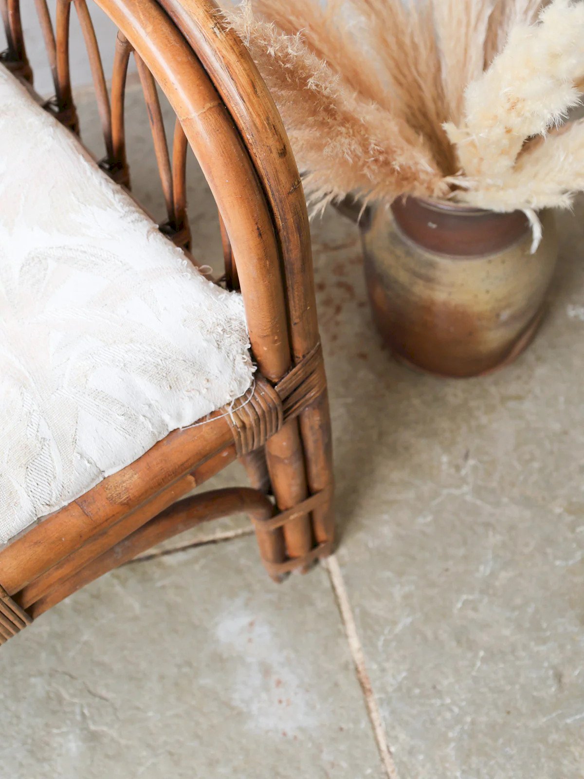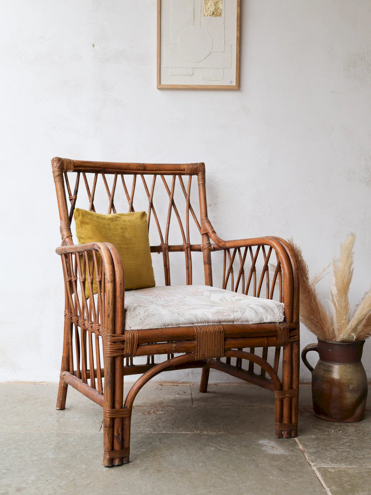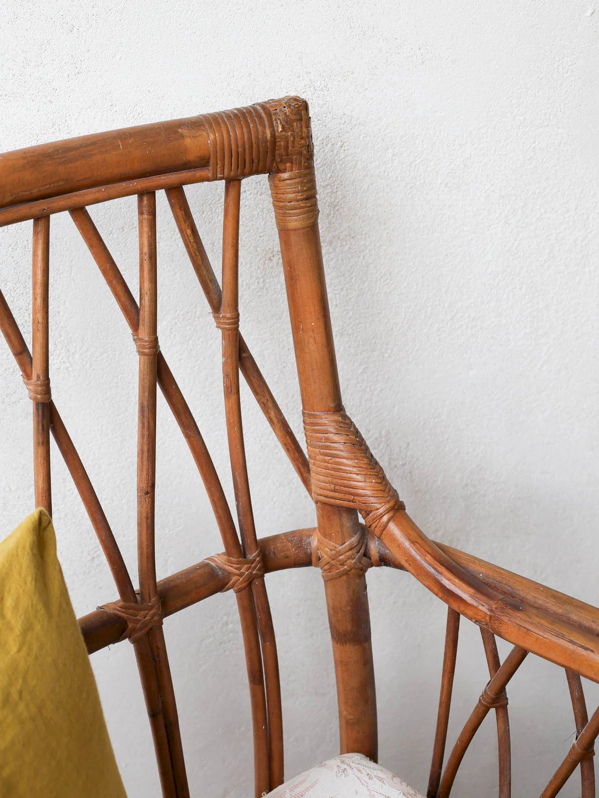 Adopt this bamboo chair with a square backrest, combining a lightweight structure and a graphic silhouette. Its deep seat and white floral-patterned cushion in green and pink provide warm comfort and a touch of spring freshness. The blend of natural materials and delicate upholstery enhances a reading nook, a porch, or a bedroom, bringing a serene and bright atmosphere. Compact lines and well-thought-out proportions for interiors that appreciate elegant simplicity. Width: 62 cm Depth: 52 cm Height: 87 cm Seat height: 37 cm Seat depth: 50 cm Seat width: 50 cm Condition: Used: Item that has been used. Item showing some superficial signs of wear, fully operational and functioning properly. It may be a display model or a returned item after a short period of use, with any possible imperfections. Color: Multicolor Height: Wood, Bamboo, Fabric Width: Chairs and Armchairs Brand: Debongout Type: Vintage product Material: Wood, Bamboo, Fabric Style: Country