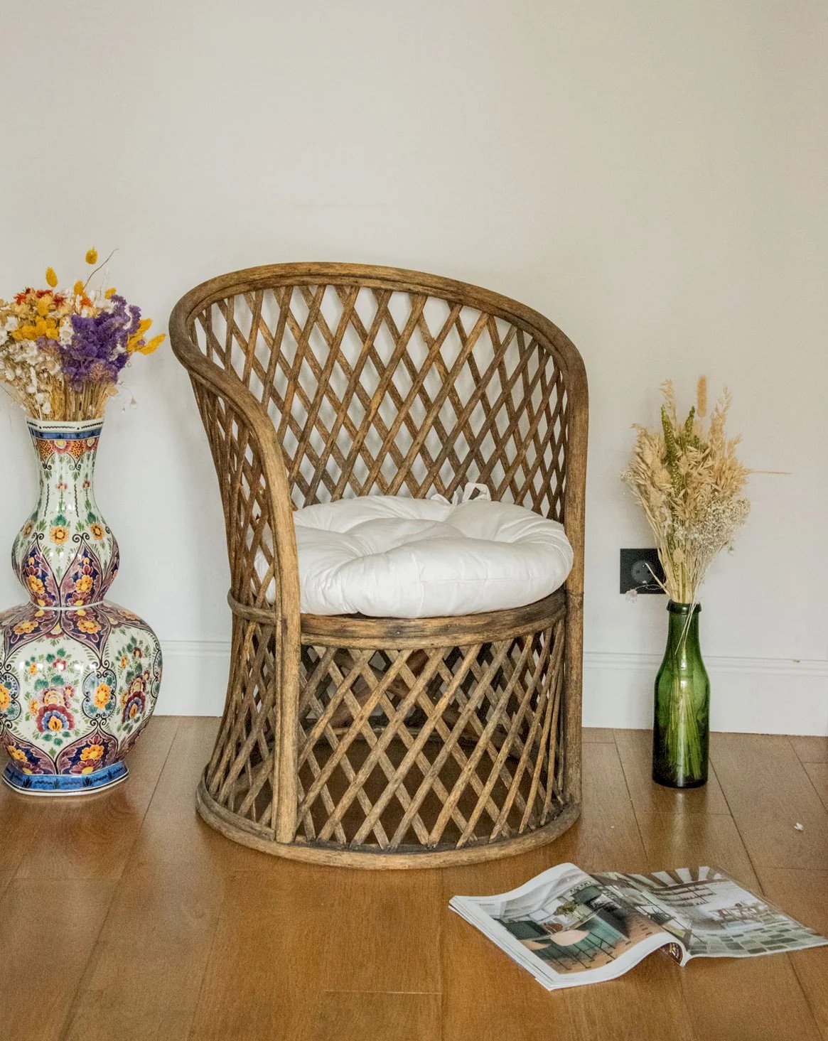 Adopt this patinated dark wood armchair with rounded lines and a welcoming backrest that invites relaxation. Its warm wood emphasizes a sober and elegant silhouette, while the new cushion adds comfort and modernity for a reading nook or an intimate living room. Compact in size but generous in seating, it creates a soft and inviting atmosphere, ideal for crafting a contemporary vintage decor. Light signs of wear are present. Length: 63 cm Width: 63 cm Height: 81 cm Seat diameter: 46 cm Condition: Used: Item that has been used. Item showing some superficial wear marks, fully operational and functioning correctly. It may be a demonstration model or an item returned to the store after a short period of use, with potential imperfections. Color: Multicolor Height: Wood, Fabric Width: Armchairs and lounge chairs Brand: Debongout Type: Thrifted product Material: Wood, Fabric Style: Country