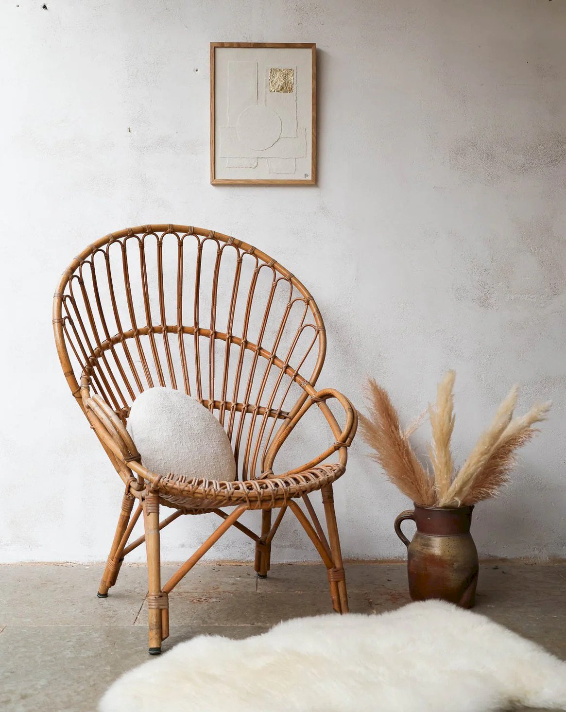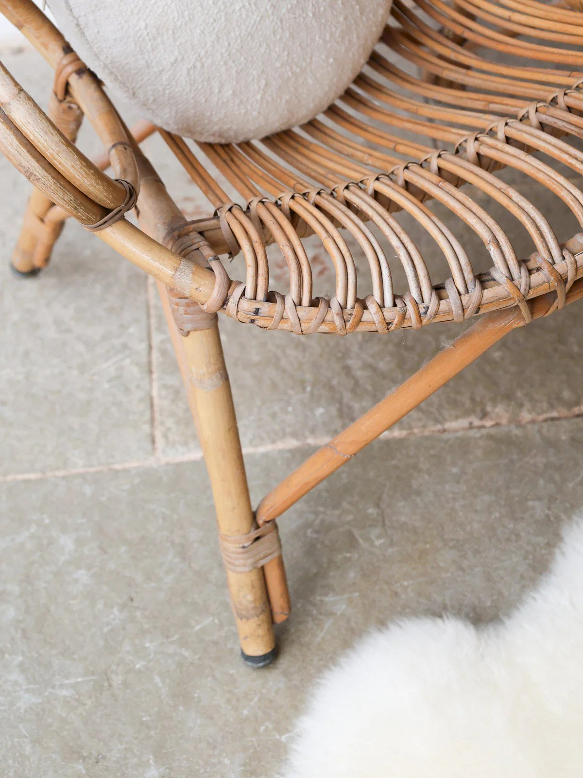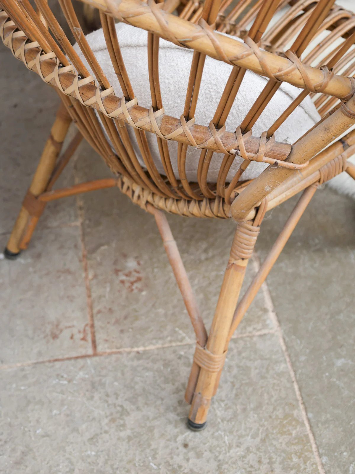 Embrace this rounded-back rattan chair, whose enveloping silhouette invites relaxation and comfort. Its lightweight structure and harmonious proportions offer a low and welcoming seat, ideal for a reading nook, a sunroom, or a living room with natural accents. The artisanal weaving highlights the warmth of the material and exudes a subtle elegance, creating a soft and bohemian atmosphere. Easy to integrate, it adds a warm and airy touch to your interior. Light signs of wear. Width: 70 cm Depth: 56 cm Height: 103 cm Seat Height: 36 cm Seat Depth: 46 cm Seat Width: 56 cm Condition: Used: Item that has been used. Item showing some superficial signs of wear, fully operational and functioning correctly. It may be a demonstration model or an item returned to the store after a short period of use. Potential imperfections. Color: Multicolor Material: Wood, Rattan Width: Chairs and Armchairs Brand: Debongout Type: Vintage Product Material: Wood, Rattan Style: Country