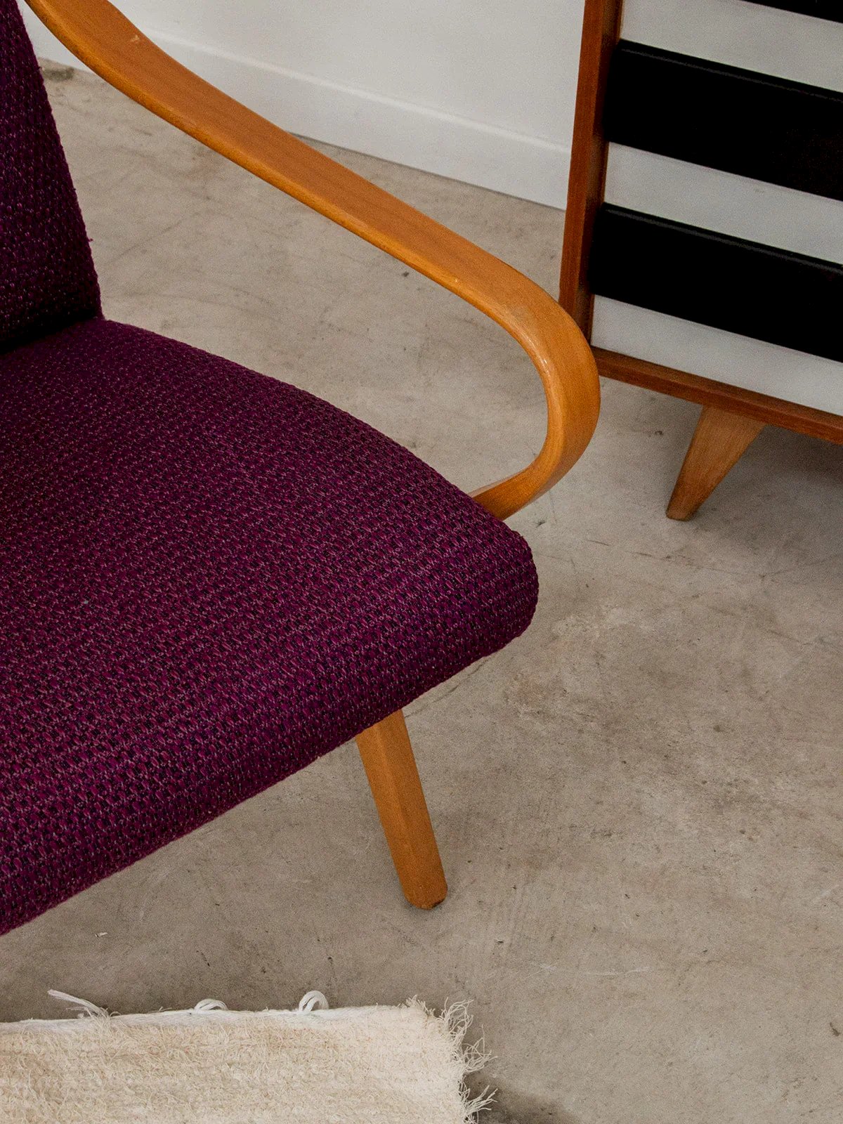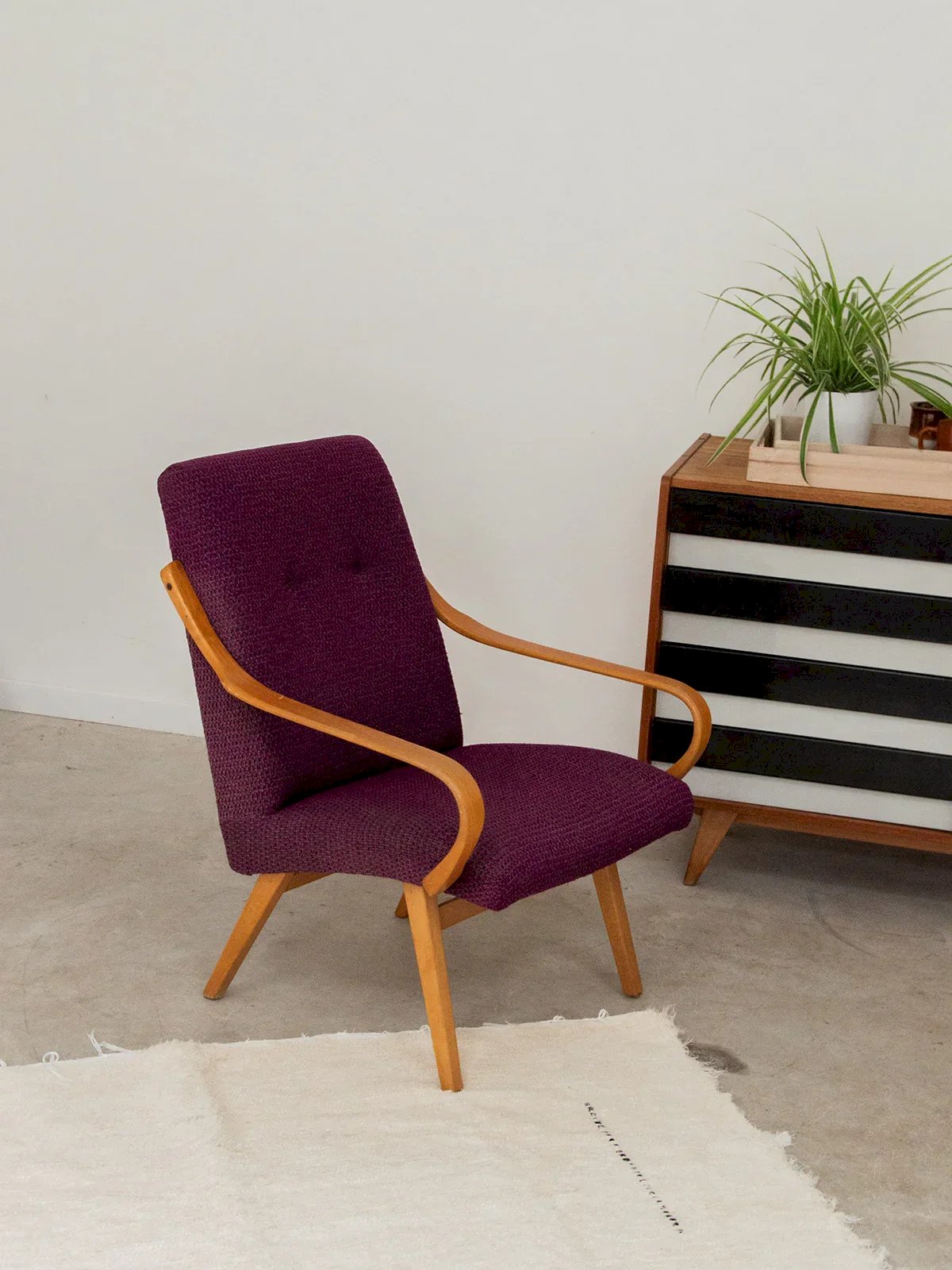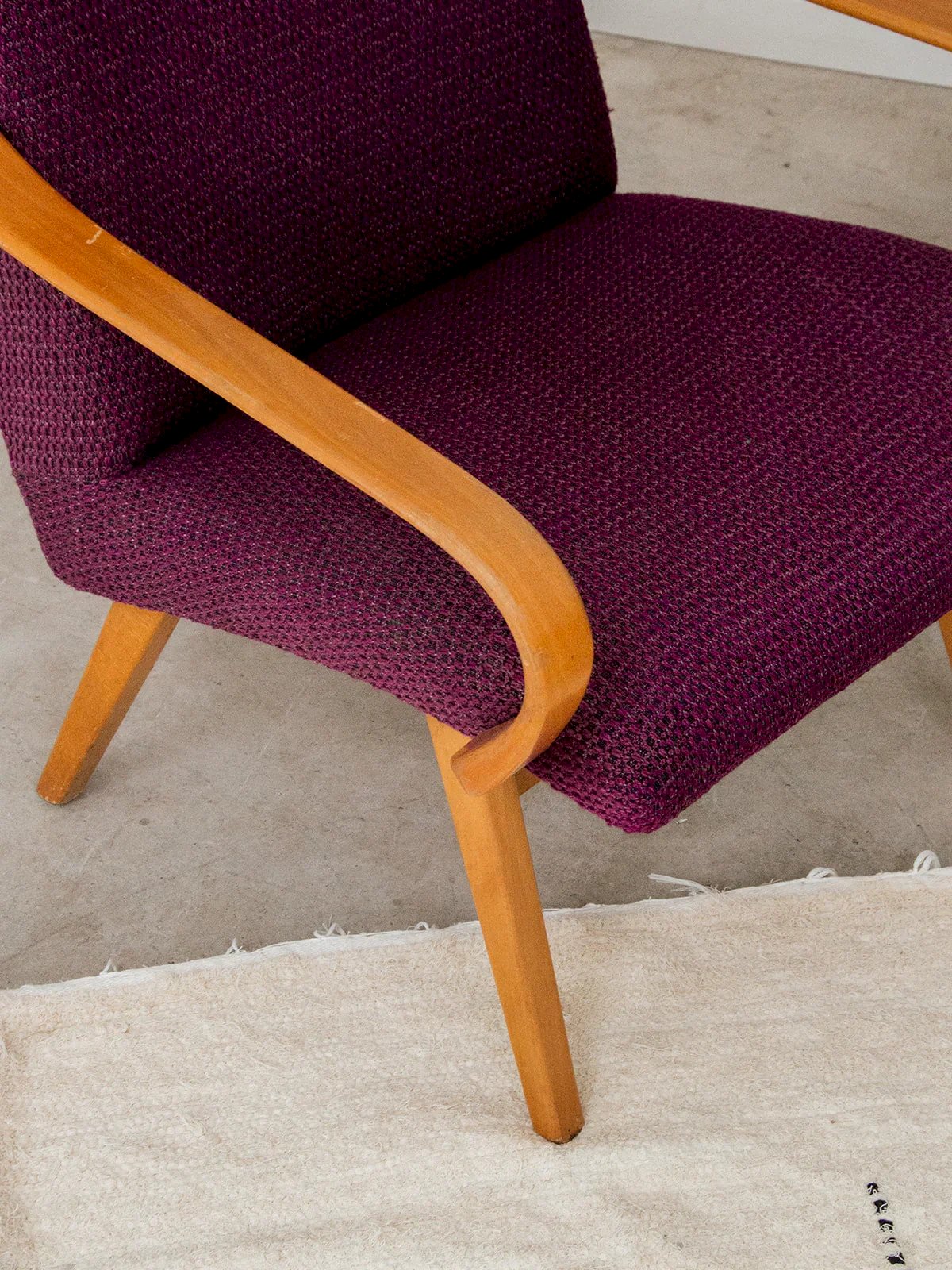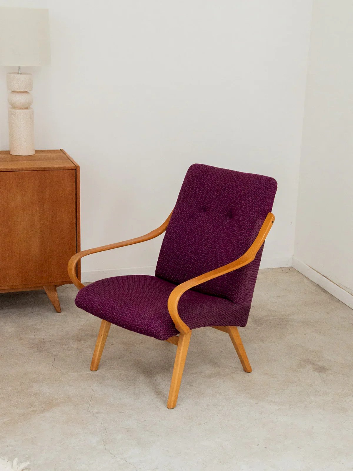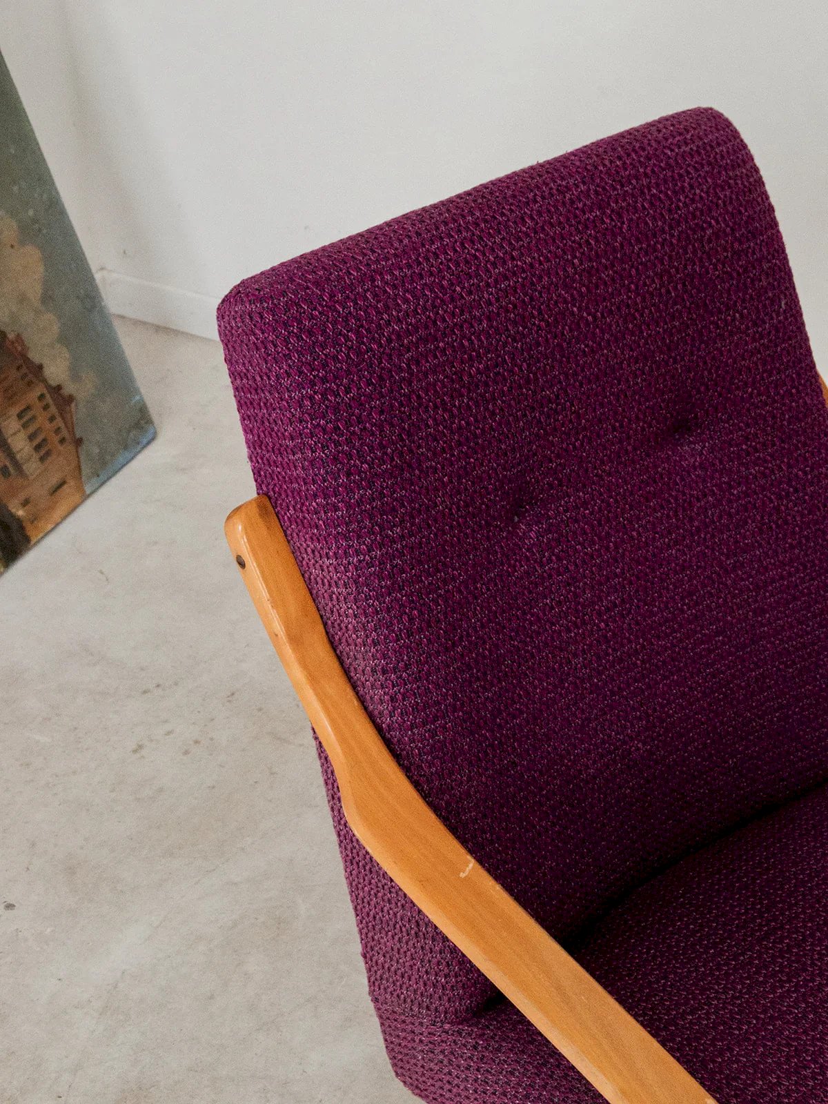 Bring a touch of color and softness to your interior with this deep purple upholstered armchair. Its curved armrests that taper towards the front provide optimal comfort, while its light wood structure adds a natural and bright note. An elegant and welcoming piece, perfect for a cozy corner or a modern living room. Price per unit, two quantities available. Length: 63 cm Width: 72 cm Height: 82 cm Seat height: 38 cm Seat width: 46 cm Seat depth: 50 cm Condition: Used: Item has been used. Item shows some superficial wear, fully operational and functioning correctly. It may be a demonstration model or an item returned to the store after a short period of use, with any potential imperfections. Color: Multicolor Height: Fabric, Wood Width: Armchairs and Lounge Chairs Brand: Debongout Type: Vintage Product Material: Fabric, Wood Style: Country