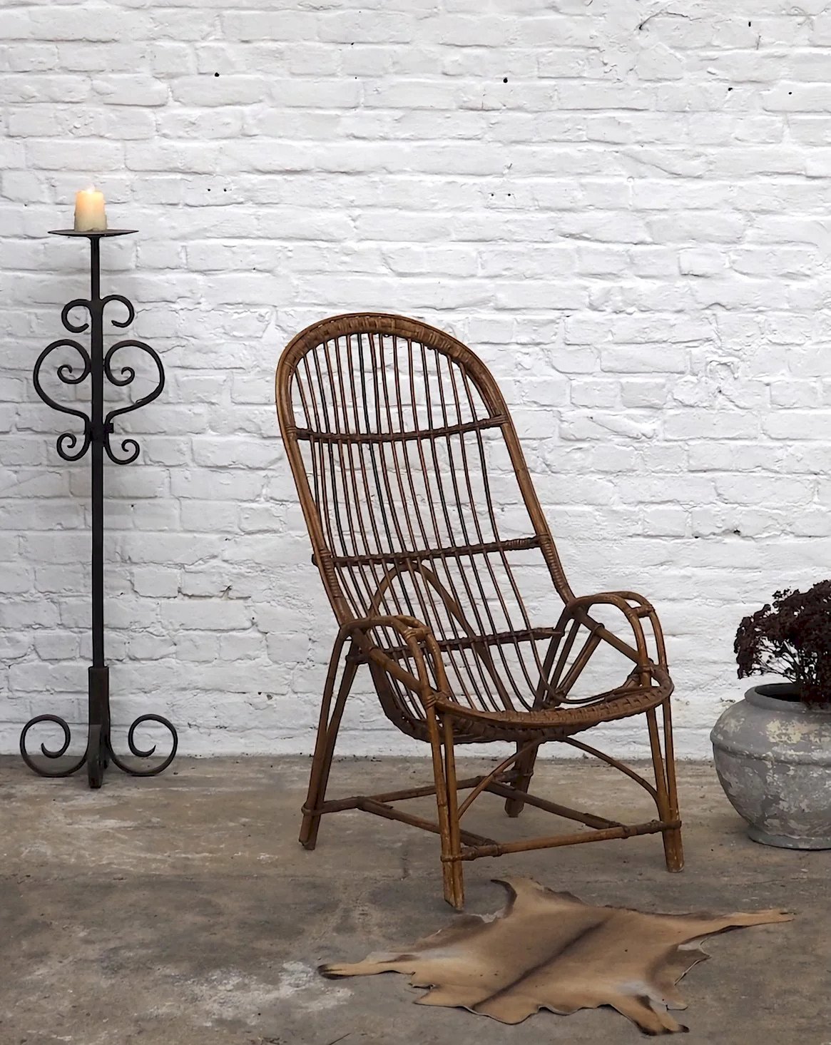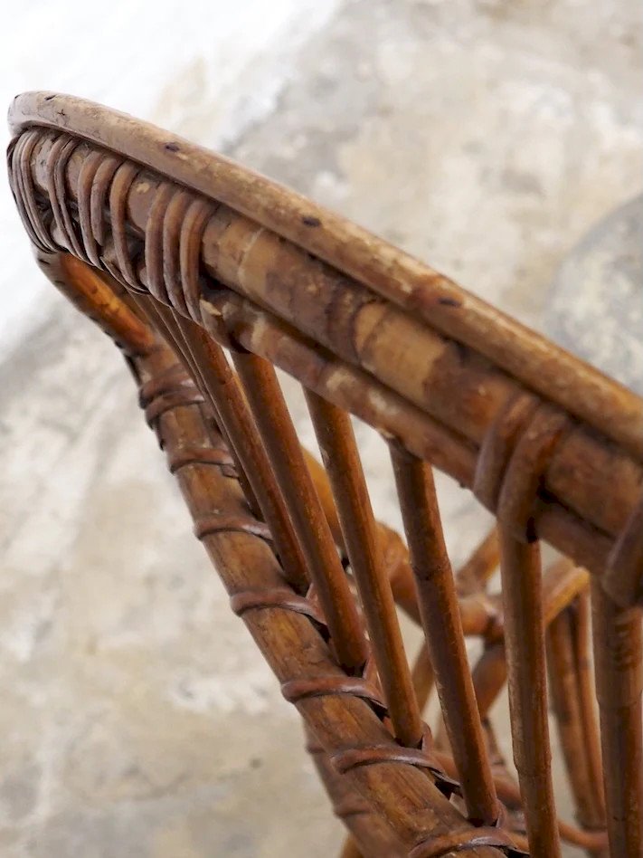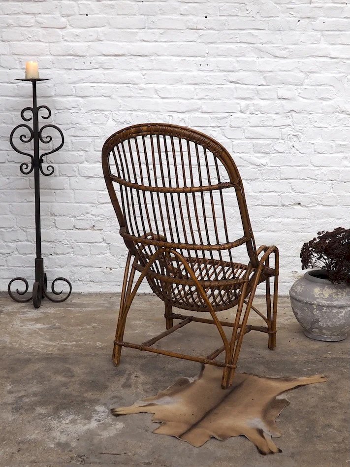 Adopt this low rattan armchair from the 1960s, with its enveloping curves and natural weaving that diffuse an organic warmth into the room. Its low, proportionate silhouette creates a comfortable seat, perfect for a reading nook, a veranda, or a bohemian-style living room, while the lightweight structure makes it easy to move according to the desired ambiance. The patinated rattan gives it a soft, authentic presence, capable of harmonizing with both contemporary and vintage interiors. Width: 63 cm Depth: 90 cm Seat depth: 44 cm Height: 109 cm Seat height: 37 cm Condition: Used: Item that has been used. Item showing some superficial signs of wear,... Used: Item that has been used. Item showing some superficial signs of wear, fully operational and functioning correctly. It may be a demonstration model or an item returned to the store after a short period of use, including any imperfections. Color: Multicolor Height: Rattan Width: Armchairs and easy chairs Brand: Debongout Type: Vintage product Material: Rattan Style: Country