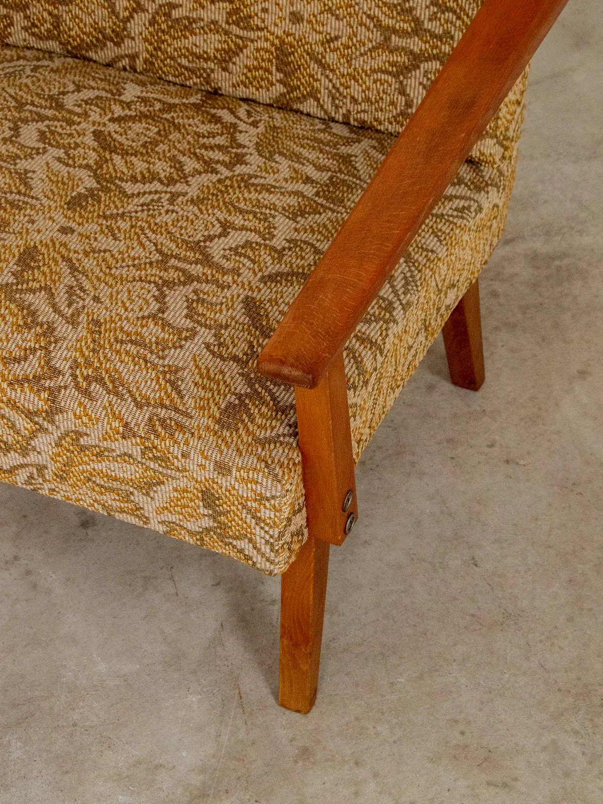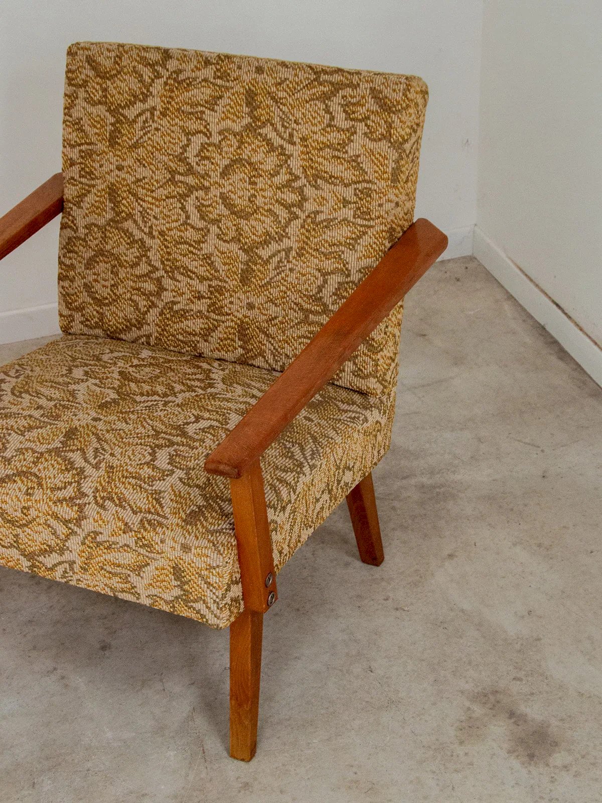 Discover this vintage and refined armchair, supported by a light wooden structure with clean lines. Its straight armrests and tapered legs give it a balanced and graphic look. The seat and backrest are dressed in a patterned fabric in shades of green, mustard, and beige, bringing a warm and subtly retro touch. A character piece, ideal for enriching a living room or reading nook with style. Length: 64 cm Height: 75 cm Back height: 44 cm Seat width: 52.5 cm Total depth: 42 cm Condition: Used: Item that has been used. Item showing some superficial wear marks, fully operational and functioning properly. It may be a demonstration model or an item returned to the store after a short period of use. Any possible imperfections. Color: Multicolor Height: Fabric, Wood Width: Armchairs and lounge chairs Brand: Debongout Type: Thrifted product Material: Fabric, Wood Style: Country