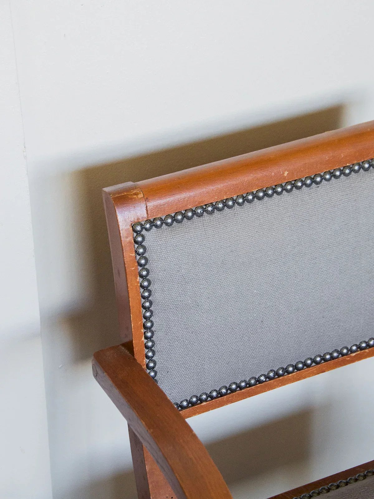 Bring a retro and elegant touch to your interior with this pair of 1960s bridge chairs. The wood, marked by the years, retains some signs of use while remaining stable and robust. The seat, redone in a slightly textured medium gray fabric, offers sobriety and elegance. Comfortable and sturdy, they fit well around a table as well as in a living room. Authentic pieces that combine vintage character with modern comfort. Length: 50 cm Height: 80 cm Seat height: 47 cm Depth: 46 cm Condition: Used: Item has been used. Item shows some signs of superficial wear...Used: Item has been used. Item shows some signs of superficial wear, fully operational and functioning correctly. It may be a demonstration model or an item returned to the store after a short period of use. Any imperfections should be noted. Color: Multicolor Height: Wood, Fabric Width: Chairs and armchairs Brand: Debongout Type: Curated product Material: Wood, Fabric Style: Country.