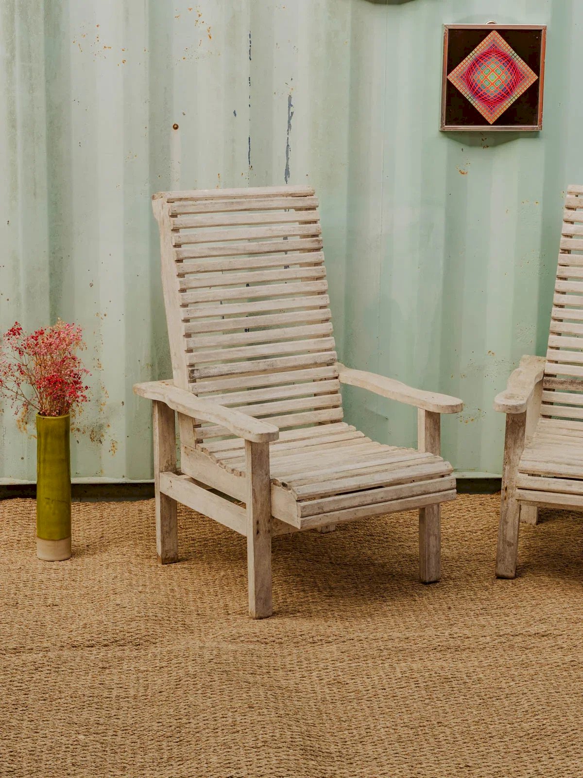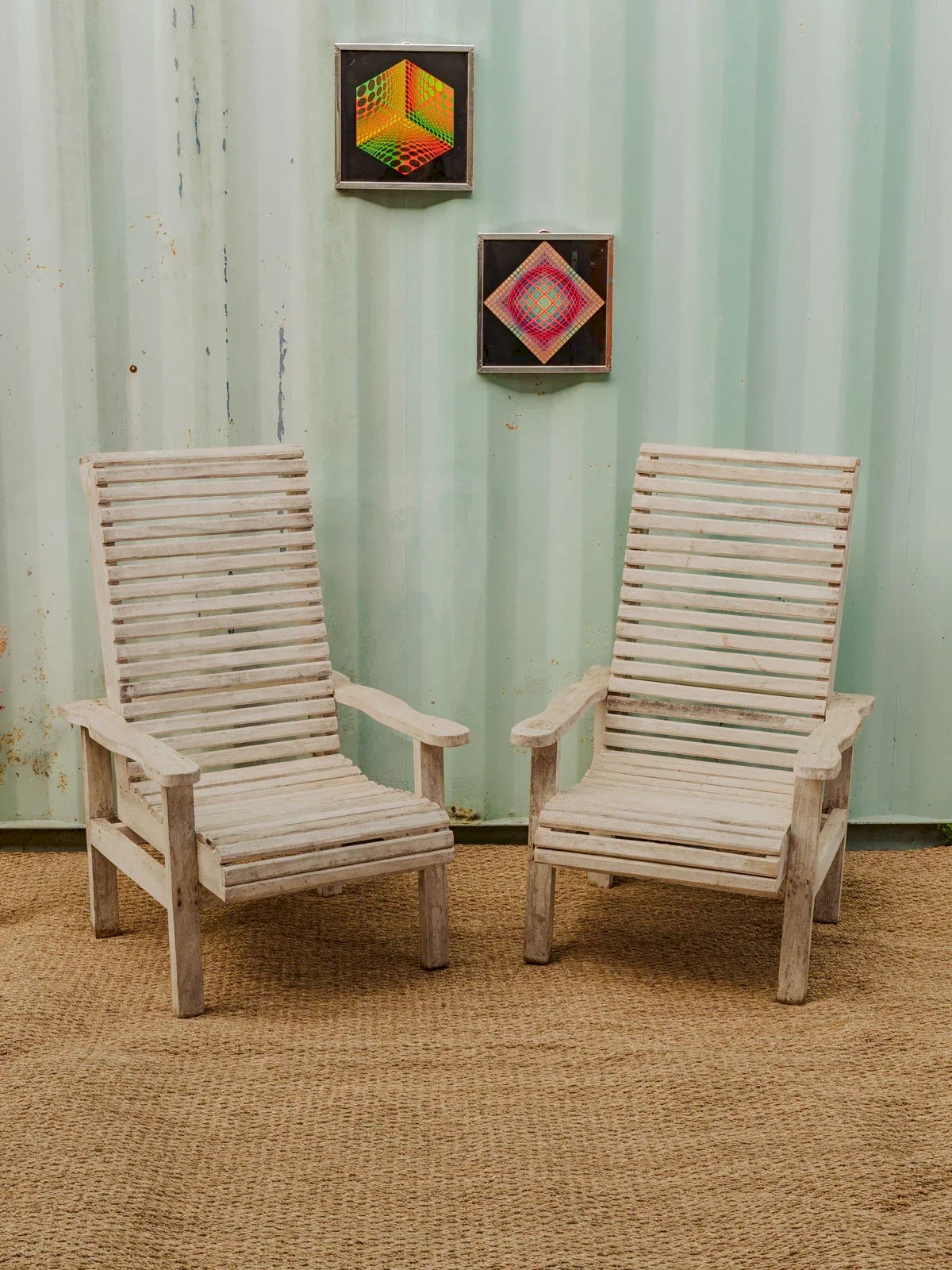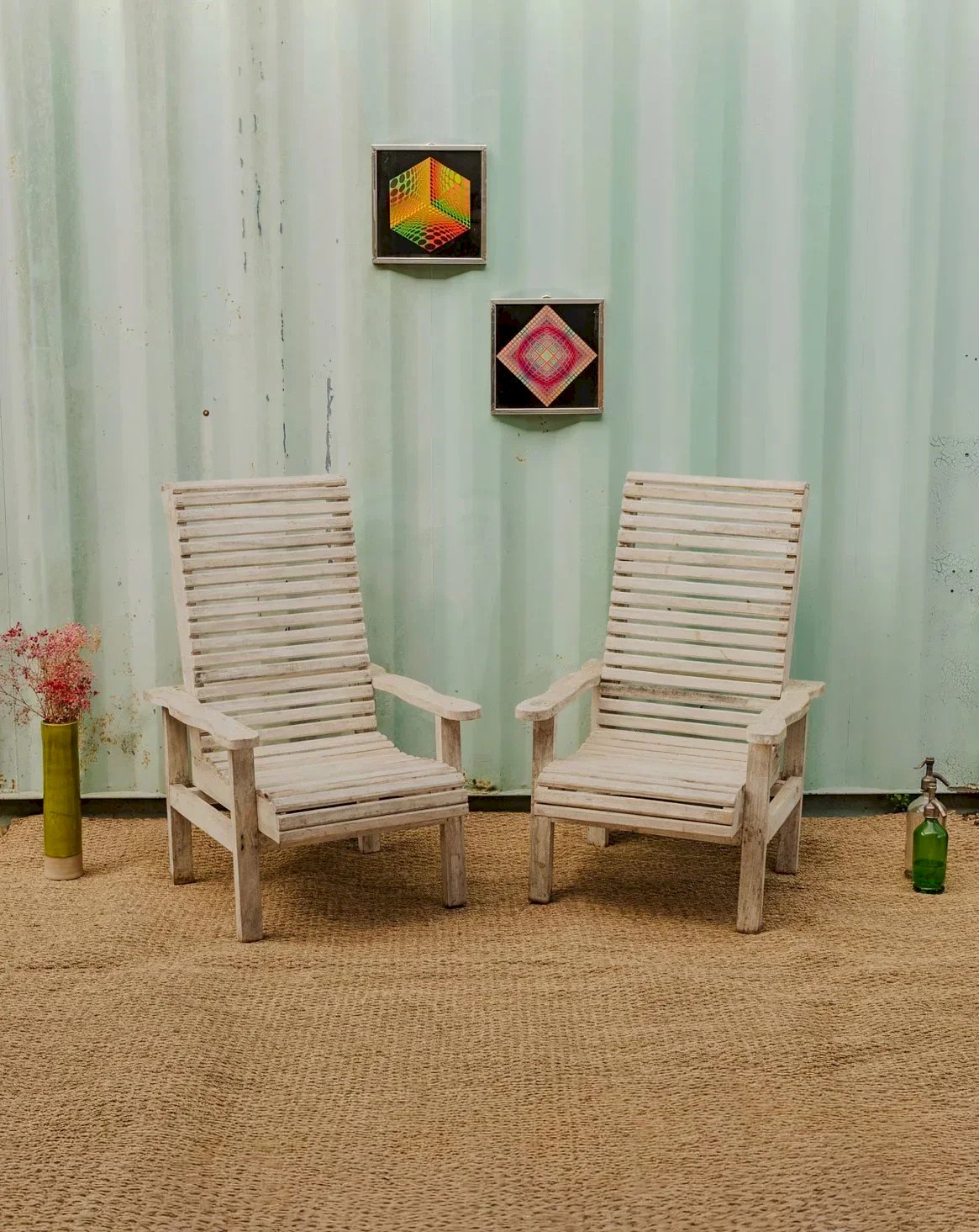 Adopt this set of two sanded wooden armchairs, dressed in a gray patina that brings a warm and contemporary look to your terrace or garden. Their low seat and proportions invite relaxation, perfect for a reading nook or a convivial outdoor lounge. The sanded wood reveals a natural texture and a simple finish, easy to pair with cushions to vary the ambiance. Slight signs of wear are present. Length: 61 cm Width: 50 cm Height: 97.5 cm Seat height: 35 cm Condition: Used: Item has been used. Item shows some superficial signs of wear, fully operational and functioning properly. It may be a demonstration model or an item returned to the store after a short period of use. Any imperfections are possible. Color: Multicolor Height: Wood Width: Armchairs and lounge chairs Brand: Debongout Type: Vintage product Material: Wood Style: Country