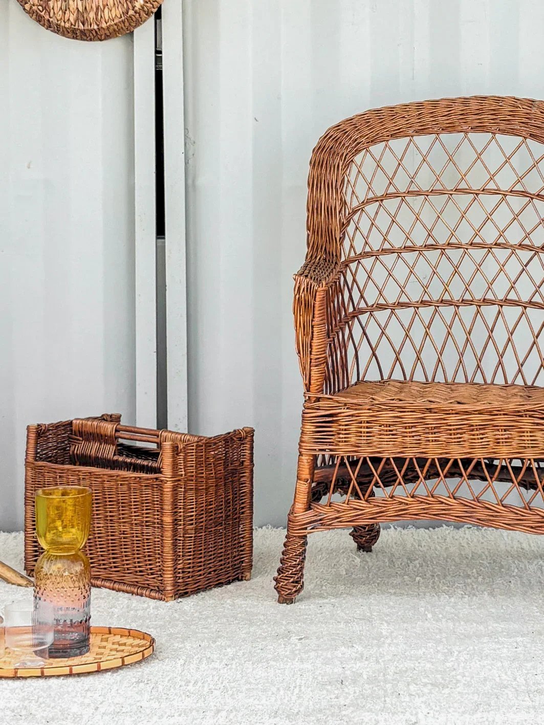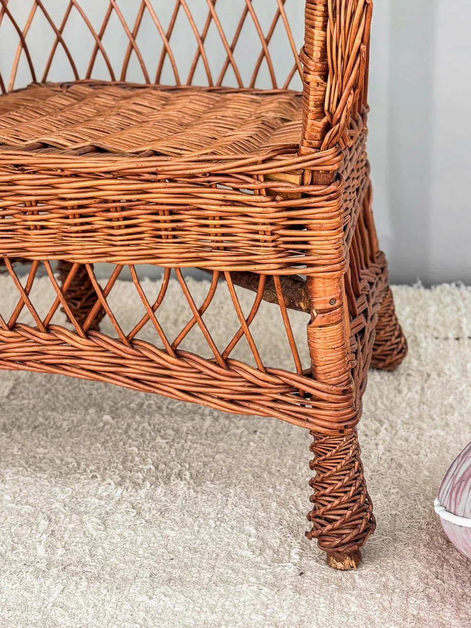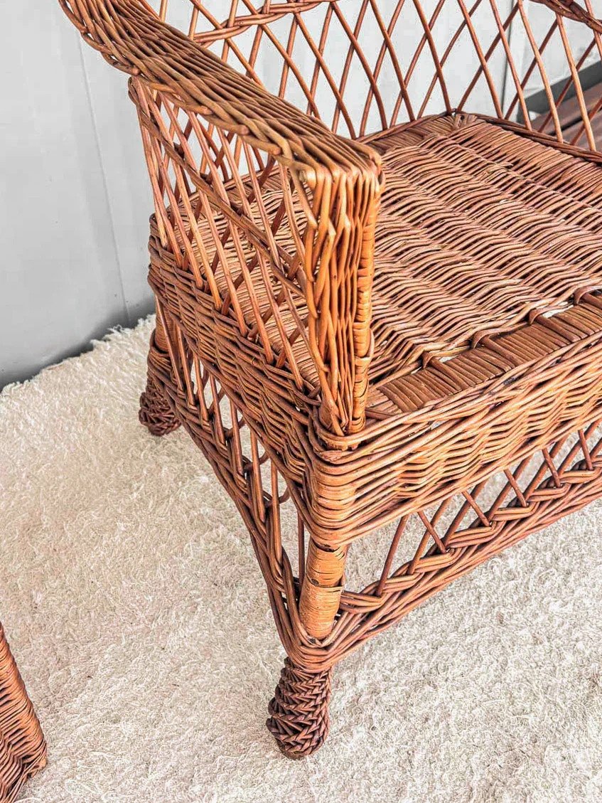 Discover this vintage wicker armchair from the 1950s, a true period treasure that will add a retro touch to your interior. With its wide armrests and elegant design, it combines comfort and style to create a cozy corner perfect for relaxing. Its generous dimensions make it an ideal piece of furniture to enhance your living room or veranda. Width: 61 cm Height: 102 cm Seat Height: 41 cm Depth: 46 cm Condition: Used: Item that has been used. Item showing some superficial signs of wear, fully operational and functioning properly. It may be a demonstration model or an item returned to the store after a short period of use. Possible imperfections. Color: Multicolor Height: Wicker Width: Armchairs and lounge chairs Brand: Debongout Type: Curated product Material: Wicker Style: Country