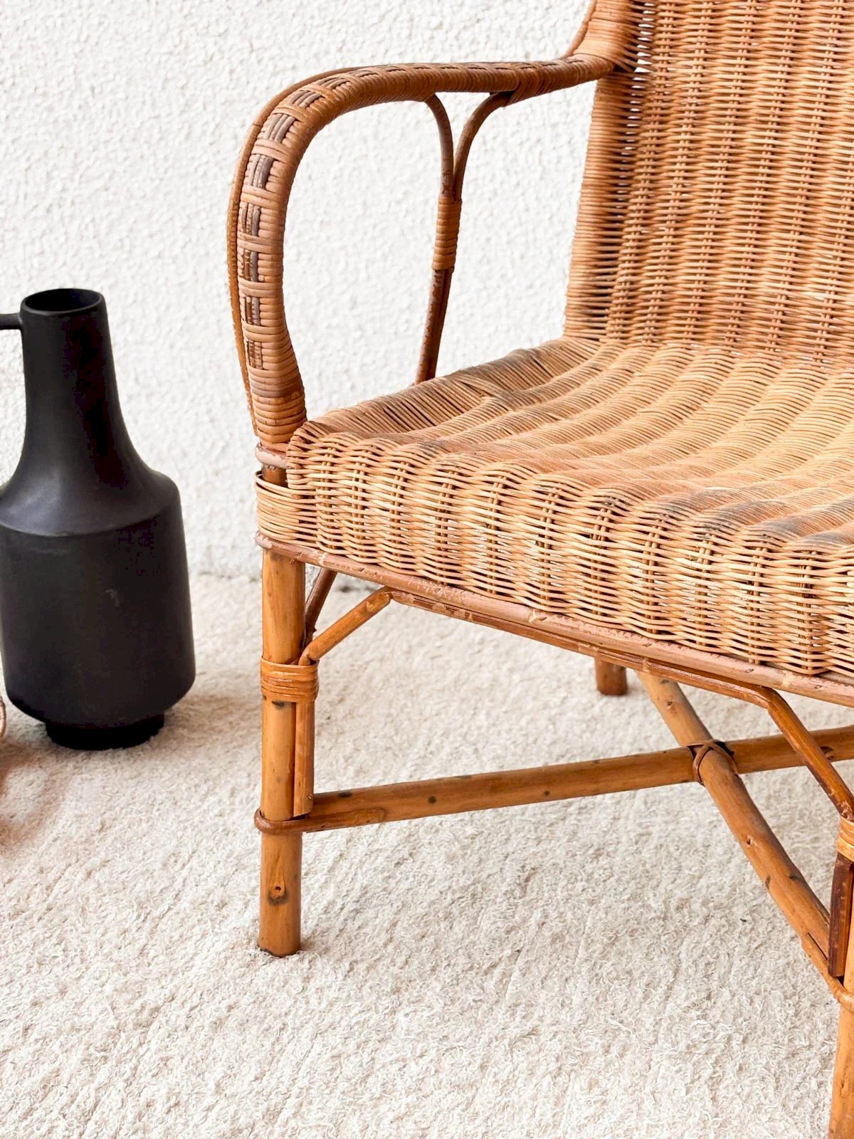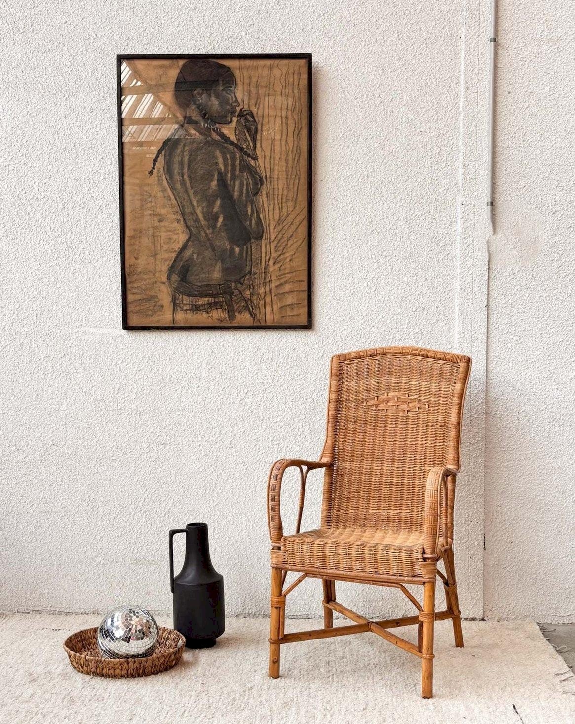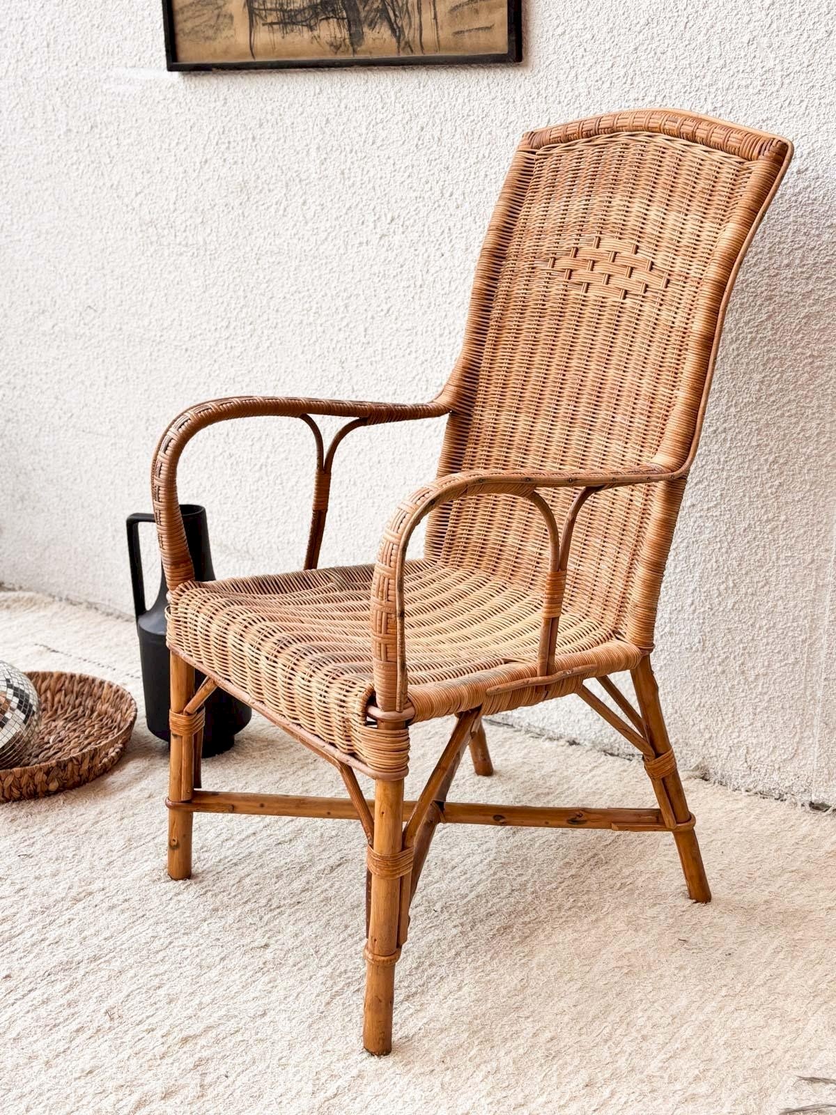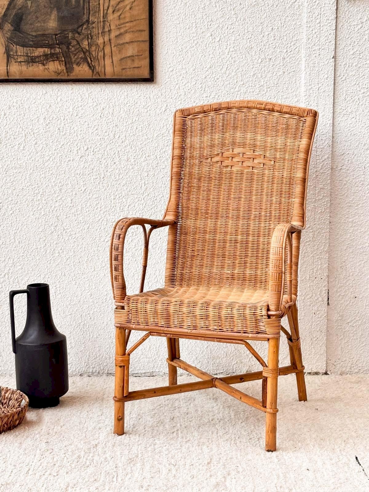 Discover our vintage rattan armchair, an elegant and timeless piece that will bring a warm touch to your interior. It offers optimal comfort while seamlessly fitting into any decor. With its light and airy design, it is ideal for moments of relaxation. Width: 55 cm Height: 106 cm Seat height: 45 cm Depth: 42 cm Condition: Used: Item has been used. Item shows some signs of superficial wear, ...Used: Item has been used. Item shows some signs of superficial wear, fully operational and functioning correctly. It may be a demonstration model or an item returned to the store after a short period of use, any imperfections. Color: Multicolor Height: Rattan Width: Armchairs and lounge chairs Brand: Debongout Type: Vintage product Material: Rattan Style: Country