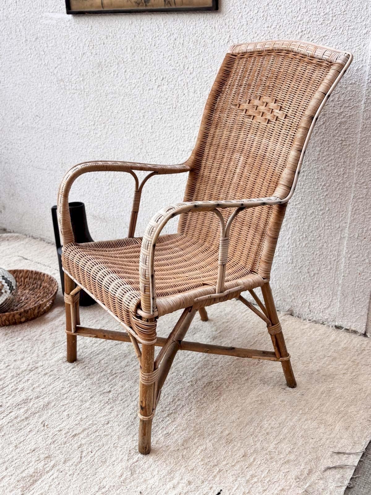 Dive into timeless elegance with our vintage rattan armchair, a nod to an everlasting retro style. Carefully crafted, this armchair combines comfort and aesthetics, perfect for adding a warm touch to your interior decor. Its delicate weaving and clean design make it versatile furniture, ideal for a living room or a reading nook. Give your space an authentic charm while enjoying moments of relaxation. Width: 55 cm Height: 106 cm Seat height: 45 cm Depth: 42 cm Condition: Used: Item has been used. Item shows some superficial signs of wear... Used: Item has been used. Item shows some superficial signs of wear, fully operational and functioning correctly. It may be a demonstration model or a returned item in-store after a short period of use. Any imperfections. Color: Multicolor Height: Rattan Width: Armchairs and lounge chairs Brand: Debongout Type: Thrifted product Material: Rattan Style: Country