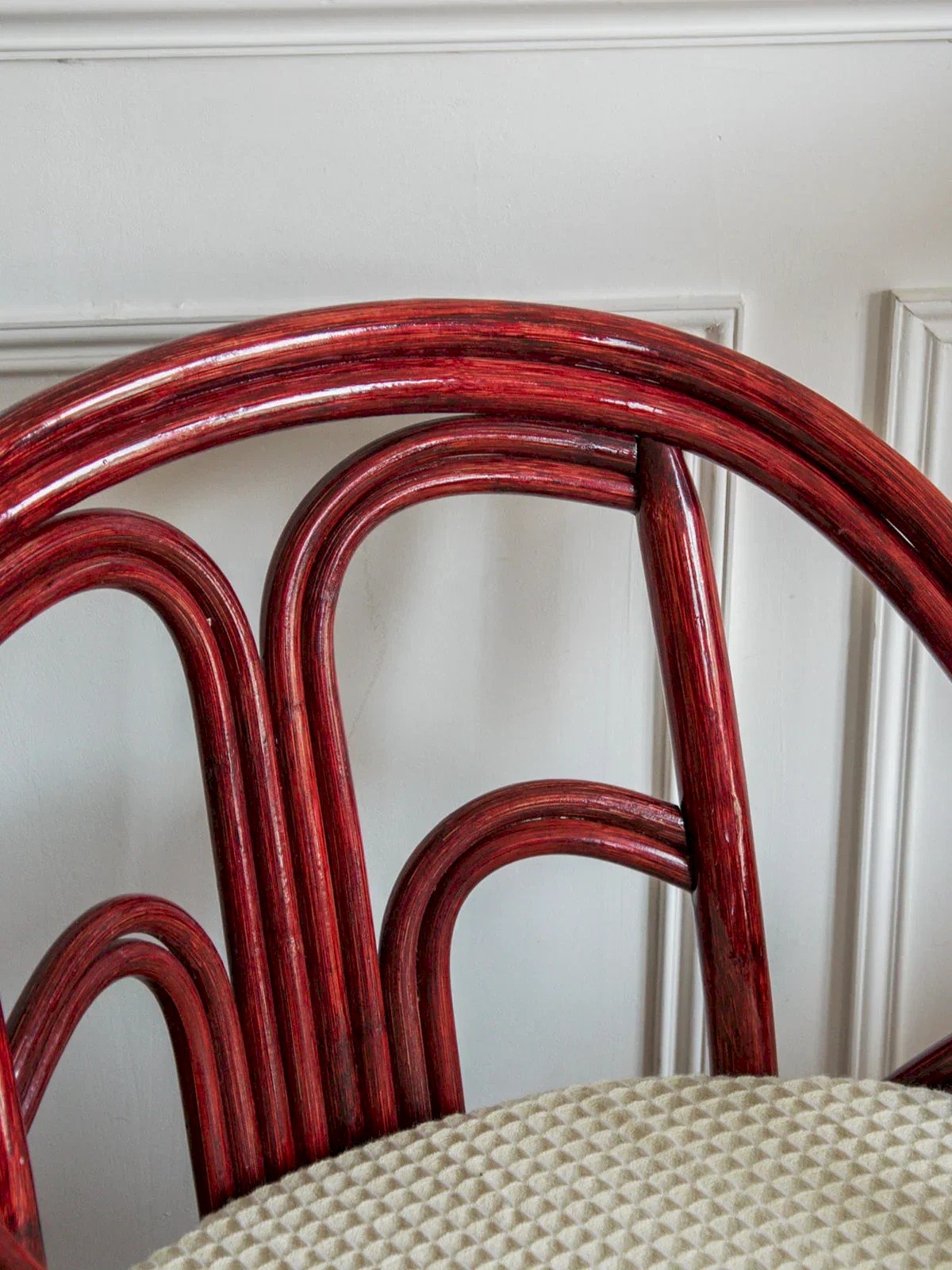 Fall for this unique red rattan armchair. With its armrests and renovated beige fabric seat, it combines comfort and vintage style. Perfect for adding a warm touch to your living room or reading nook, it fits naturally in any room of the house. A true favorite for a decor full of personality. Length: 60 cm Height: 78 cm Seat height: 43 cm Depth: 58 cm Seat depth: 53 cm Condition: Used: Item that has been used. Item showing some signs of superficial wear, ...Used: Item that has been used. Item showing some signs of superficial wear, fully operational and functioning correctly. It may be a display model or an item returned to the store after a short period of use. Any imperfections. Color: Multicolor Height: Rattan, Fabric Width: Armchairs and lounge chairs Brand: Debongout Type: Thrifted product Material: Rattan, Fabric Style: Country