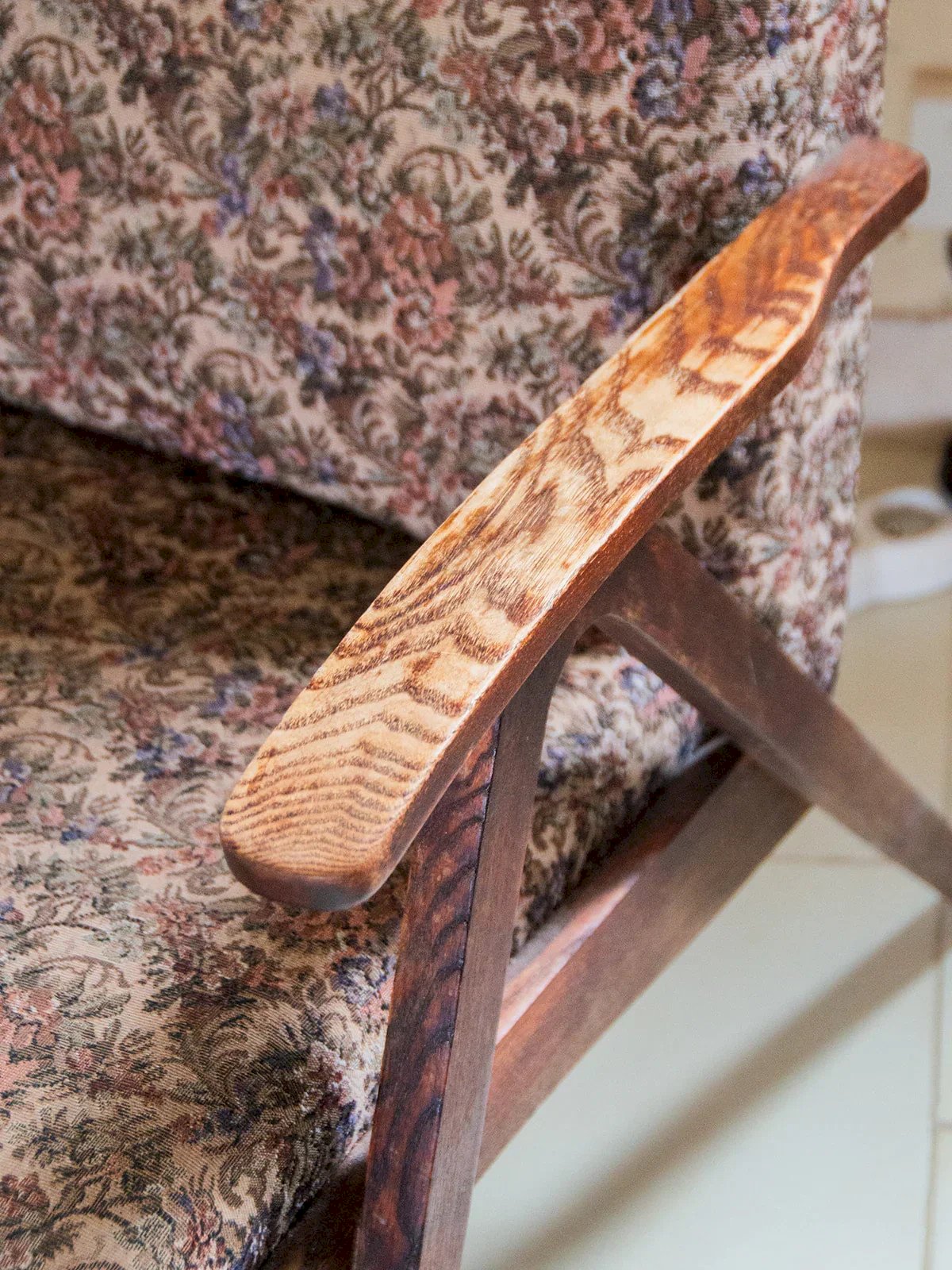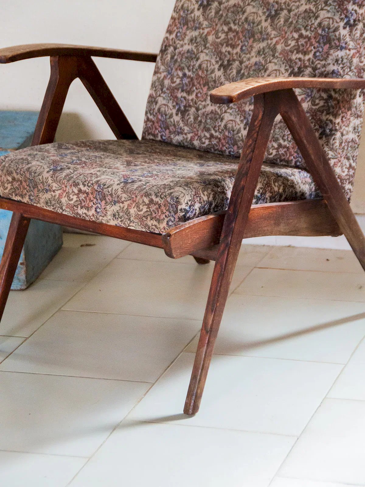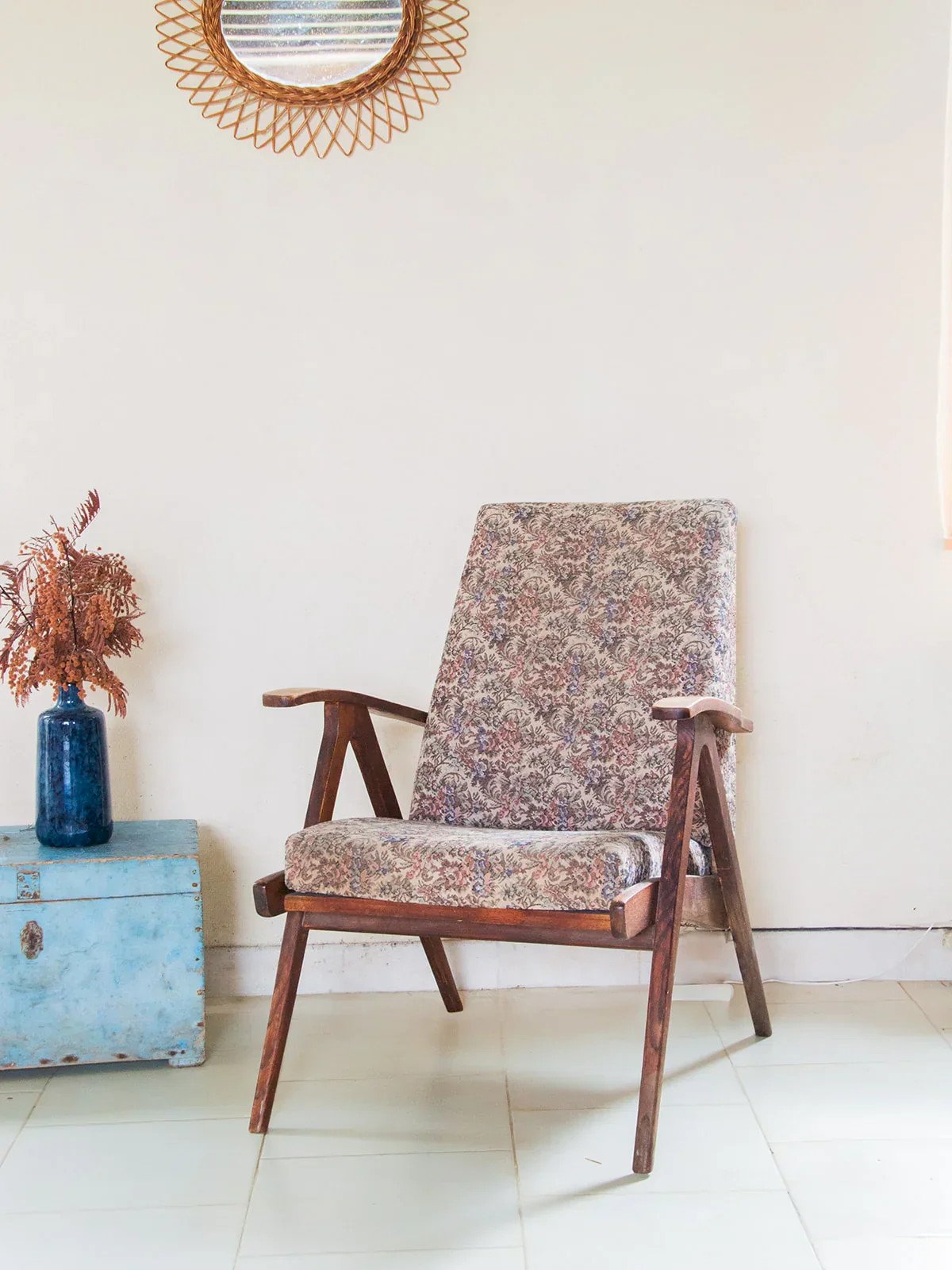 Add a vintage touch to your interior with this dark wood Scandinavian armchair. Its floral fabric gives it charm and a warm look. Sturdy and comfortable, it will fit perfectly in a living room or bedroom. Ideal for creating an elegant and cozy relaxation corner. Sold individually, two quantities are available! Length: 61 cm Height: 81 cm Seat height: 40 cm Total depth: 43 cm Condition: Used: Item that has been used. Item showing some superficial wear marks, ...Used: Item that has been used. Item showing some superficial wear marks, fully operational and functioning properly. It may be a display model or an item returned to the store after a short period of use. Any possible imperfections. Color: Multicolored Height: Wood, Fabric Width: Armchairs and Lounge Chairs Brand: Debongout Type: Vintage product Material: Wood, Fabric Style: Country