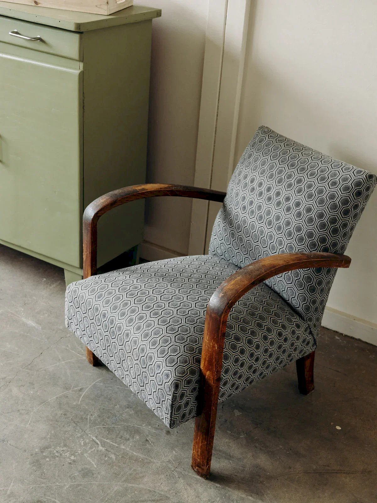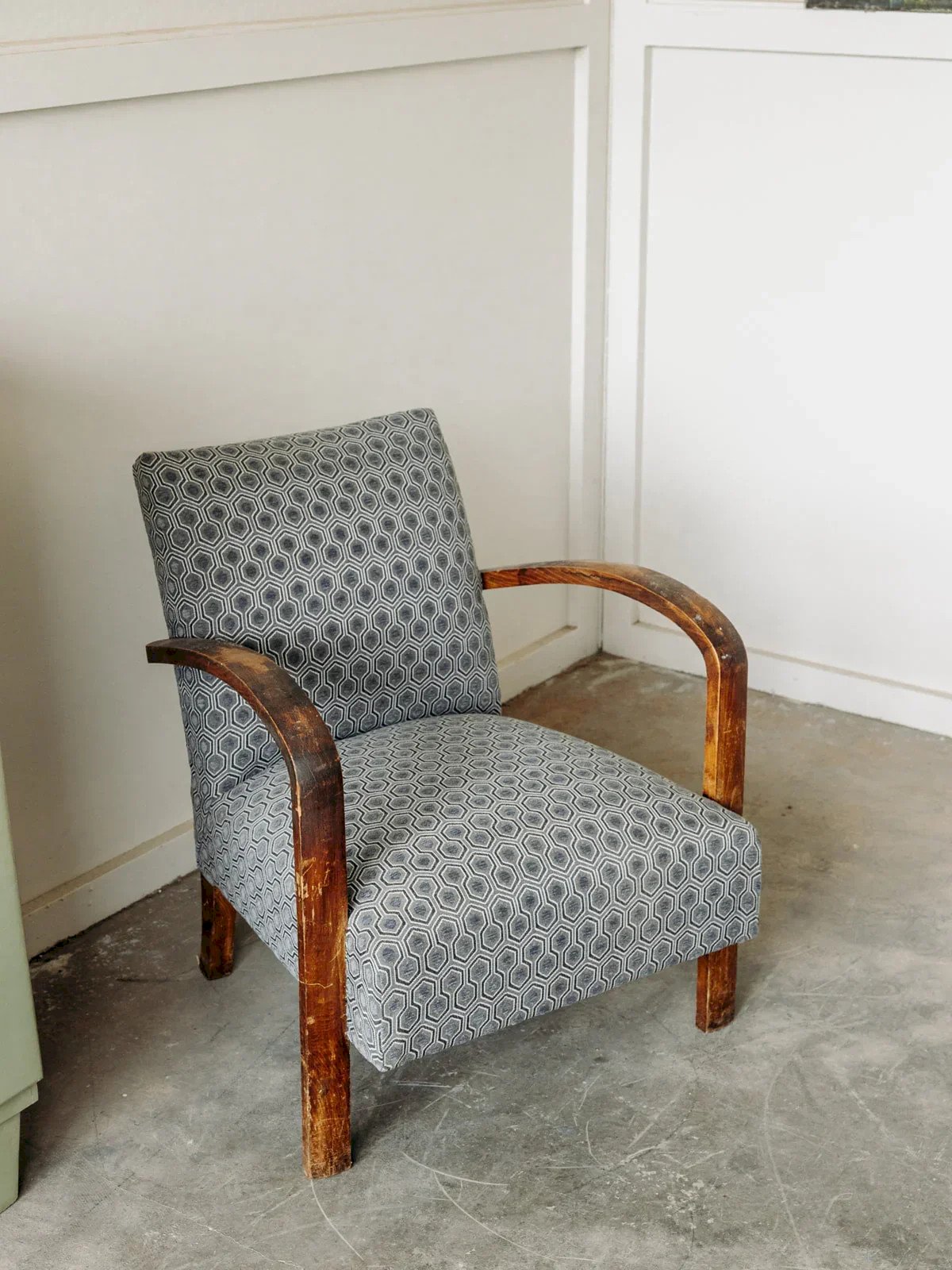 Discover this armchair with timeless charm, entirely reupholstered in a boldly elegant blue-purple patterned fabric. Its solid wooden structure and curved armrests give it a welcoming and refined silhouette. Perfect for adding a touch of color and character to your interior. Ideal as an accent piece in a living room, bedroom, or reading nook. A unique armchair, blending comfort and style with personality. Length: 62 cm Height: 73 cm Seat height: 32 cm Depth: 61 cm Seat depth: 48 cm Condition: Second hand: Item has been used. Item shows some superficial wear marks, fully operational and functioning correctly. It may be a demonstration model or an item returned to the store after a short period of use, with possible imperfections. Color: Multicolor Height: Wood, Fabric Width: Armchairs and lounge chairs Brand: Debongout Type: Vintage product Material: Wood, Fabric Style: Country