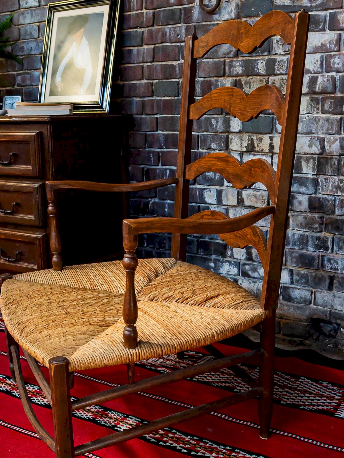 Discover this charming Norman nursing armchair, an emblem of the early 20th century, made of chestnut wood. Its traditional rush seating gives this piece of furniture a touch of authenticity and comfort. This rare armchair, due to its size, is in very good overall condition, ready to enhance your interior with its warm appearance and rich history. An essential piece for vintage furniture enthusiasts. Length: 68 cm Width: 64 cm Height: 106 cm Seat height: 34 cm Seat depth: 64 cm Seat width: 68 cm Backrest height: 61 cm Armrest height: 61 cm Condition: Used: Item has been used. Item shows some signs of superficial wear, fully operational and functioning correctly. It may be a demonstration model or an item returned to the store after a short period of use. Any possible imperfections. Color: Multicolor Height: Wood, Straw Width: Armchairs and lounge chairs Brand: Debongout Type: Thrifted product Material: Wood, Straw Style: Country