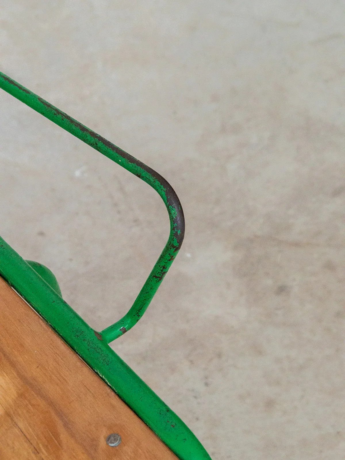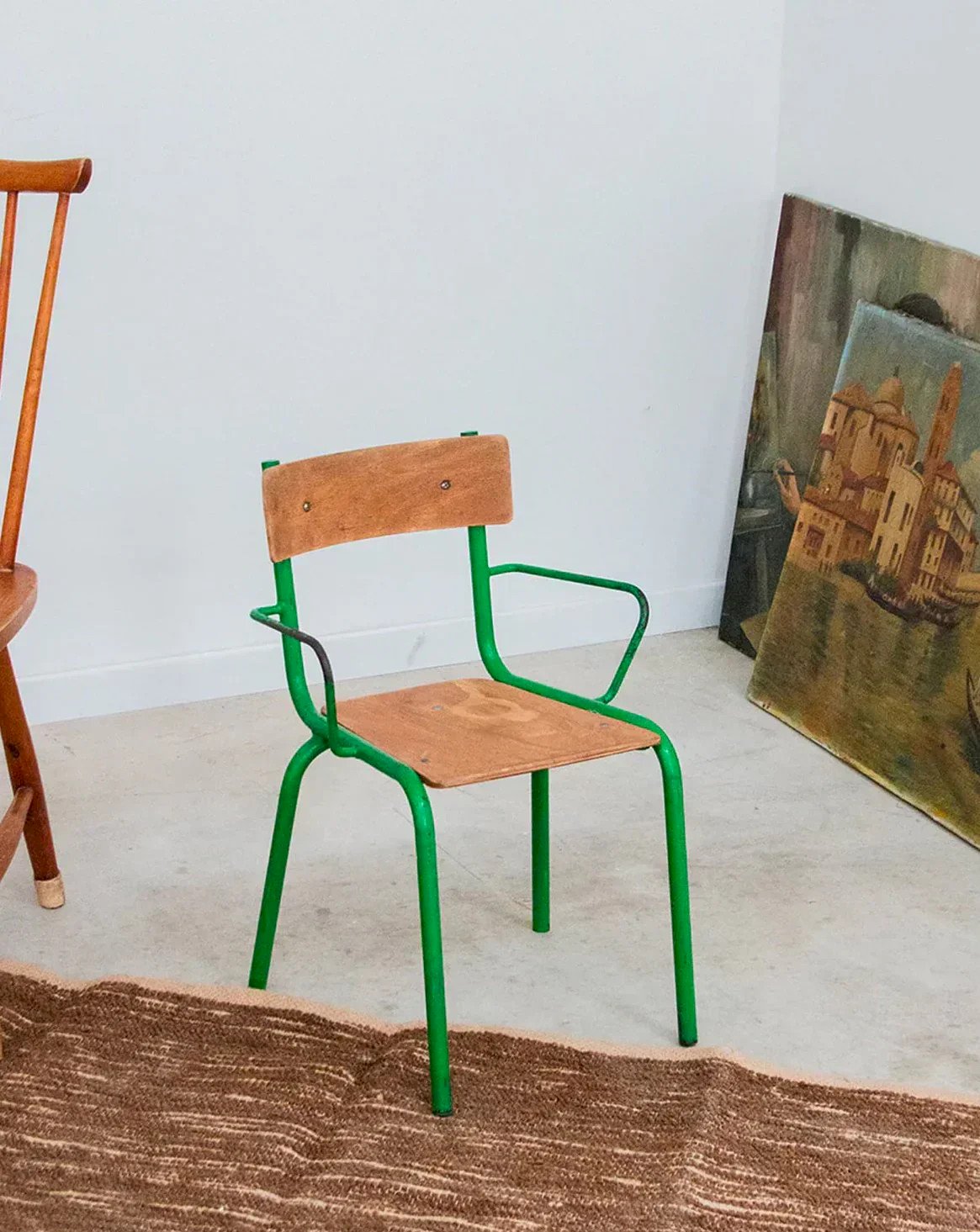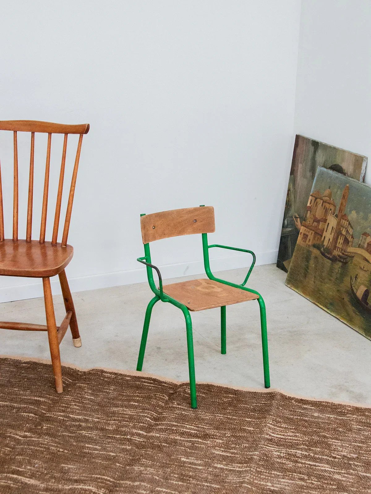 Discover the green wooden and metal children's chair, a stylish and functional piece of furniture for your little one's room. Thanks to its small dimensions, it is perfectly suited for young children. Its playful design and sturdiness make it an ideal choice for adding a splash of color and modernity to their space. Give them a comfortable place to sit and play, while seamlessly fitting into your decor. Length: 38 cm Width: 48 cm Height: 58 cm Seat height: 33 cm Condition: Used: Item has been used. Item shows some superficial signs of wear... Used: Item has been used. Item shows some superficial signs of wear, fully operational and functioning correctly. It may be a demonstration model or a product returned to the store after a short period of use. Any imperfections may be present. Color: Multicolor Height: Wood Width: Chairs Brand: Debongout Type: Vintage product Material: Wood Style: Country