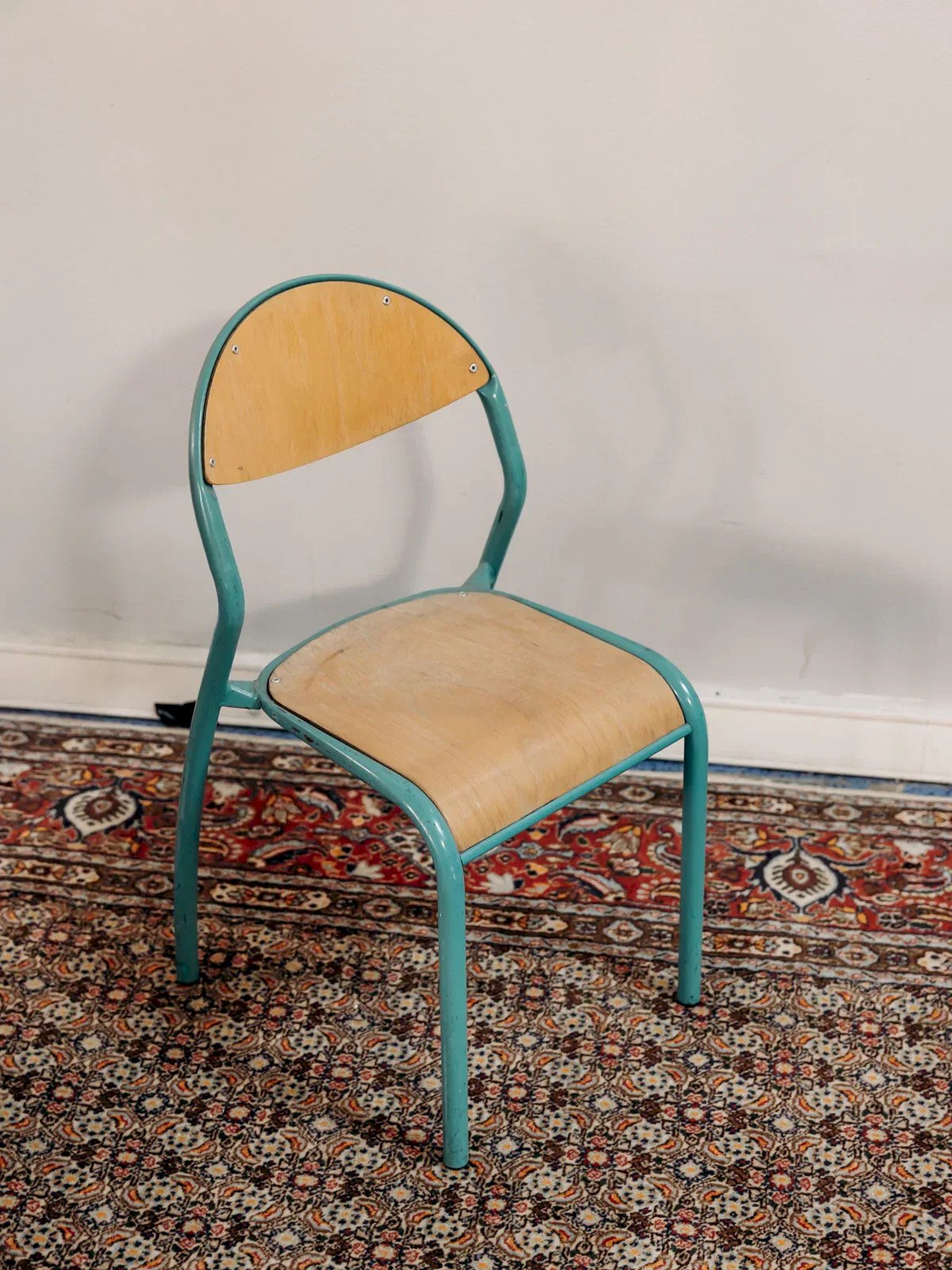 Adopt this light blue metal chair with a subtle charm, combining a lightweight structure with rounded wooden seat and back for a tactile softness. Its graphic design and compact proportions make it ideal for an intimate dining room, a coffee corner, or a contemporary office, where it adds a colorful and airy touch. The contrast between metal and wood creates both an industrial and warm atmosphere, true to current interiors. Minor wear present. Width: 36 cm Depth: 35 cm Seat depth: 43 cm Seat width: 36 cm Height: 76 cm Seat height: 43 cm Condition: Used: Item that has been used. Item showing some superficial signs of wear, fully operational and functioning correctly. It may be a demonstration model or an item returned to the store after a short period of use. Any imperfections. Color: Multicolor Height: Country Width: Metal, Wood Length: Chairs Brand: Debongout Type: Vintage product Material: Metal, Wood Style: Country Assembly required: No Assembly level: Fully assembled.