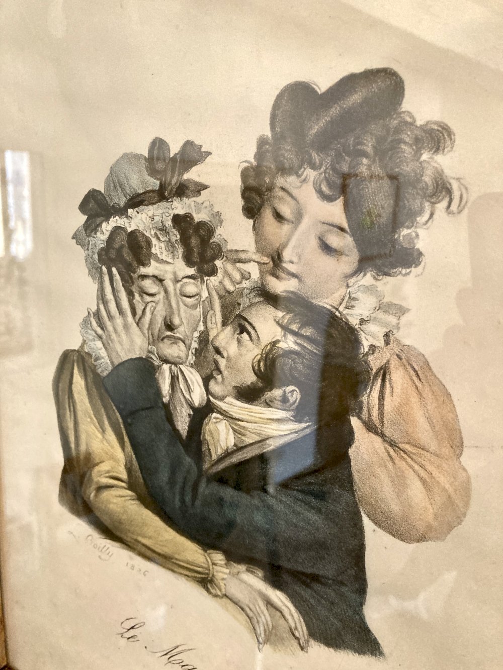 The engraving is an etching enhanced with color, presented under glass in its antique varnished wooden frame. The whole piece has a beautiful patina and a decorative charm typical of 19th-century wall prints.
