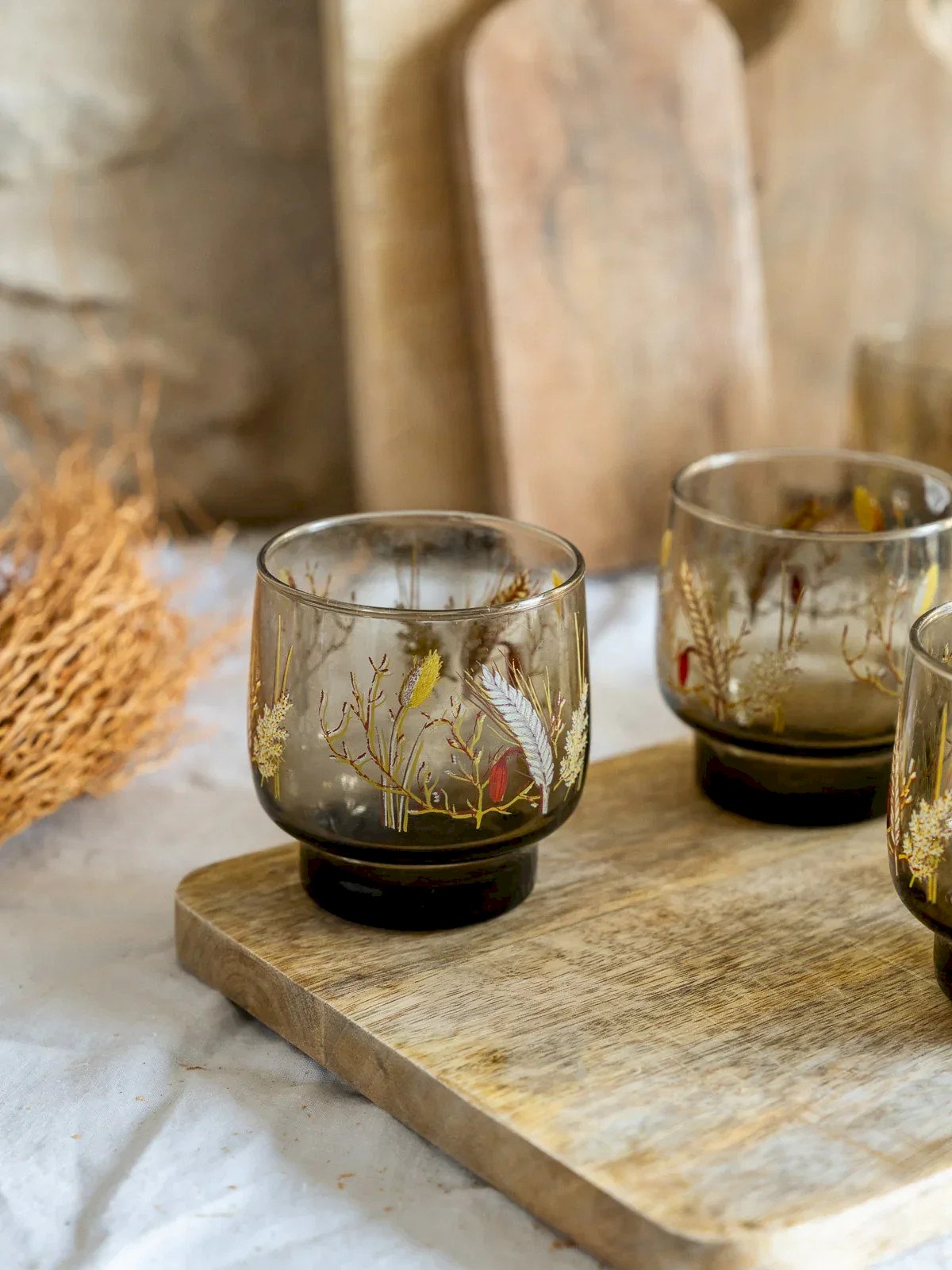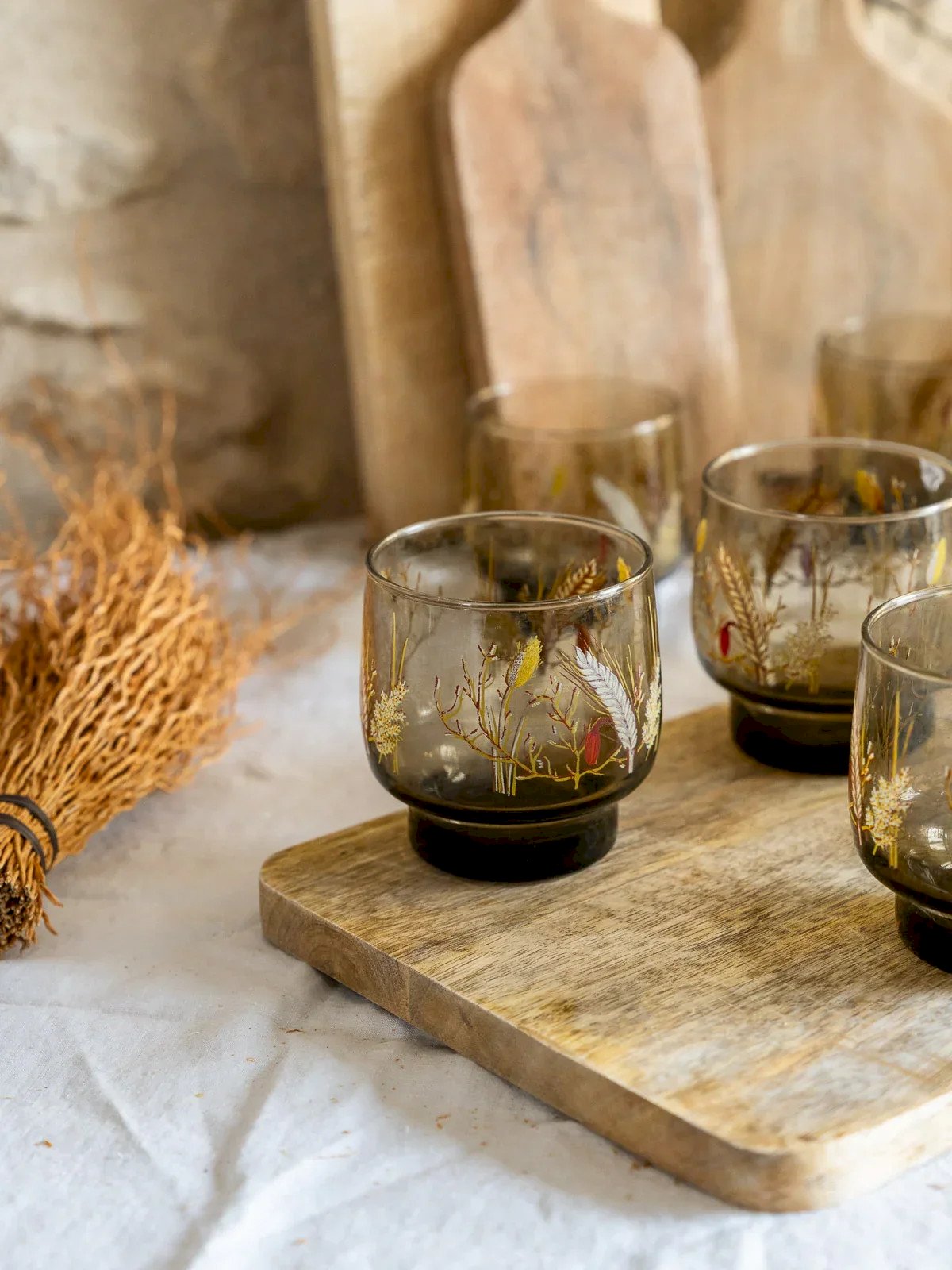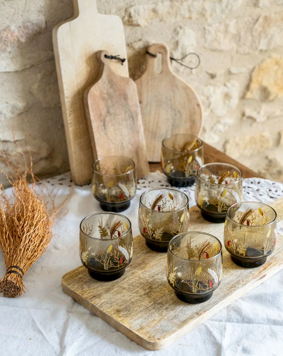Add a retro touch to your table with this set of 7 vintage smoked glass glasses, delicately adorned with an elegant wheat pattern. Perfect for your gatherings with friends or family dinners, these glasses combine aesthetics and practicality. Their transparent finish and refined design will enhance all your favorite cocktails or drinks while bringing warmth and charm to your interior. Treat yourself to a moment of conviviality with these unique pieces of timeless style. Height: 8 cm Diameter: 7 cm Condition: Used: Item that has been used. Item showing some superficial wear marks... Used: Item that has been used. Item showing some superficial wear marks, fully operational and functioning correctly. It may be a demonstration model or an item returned to the store after a short period of use with possible imperfections. Brand: Debongout Type: Thrifted Product Material: Glass Style: Country