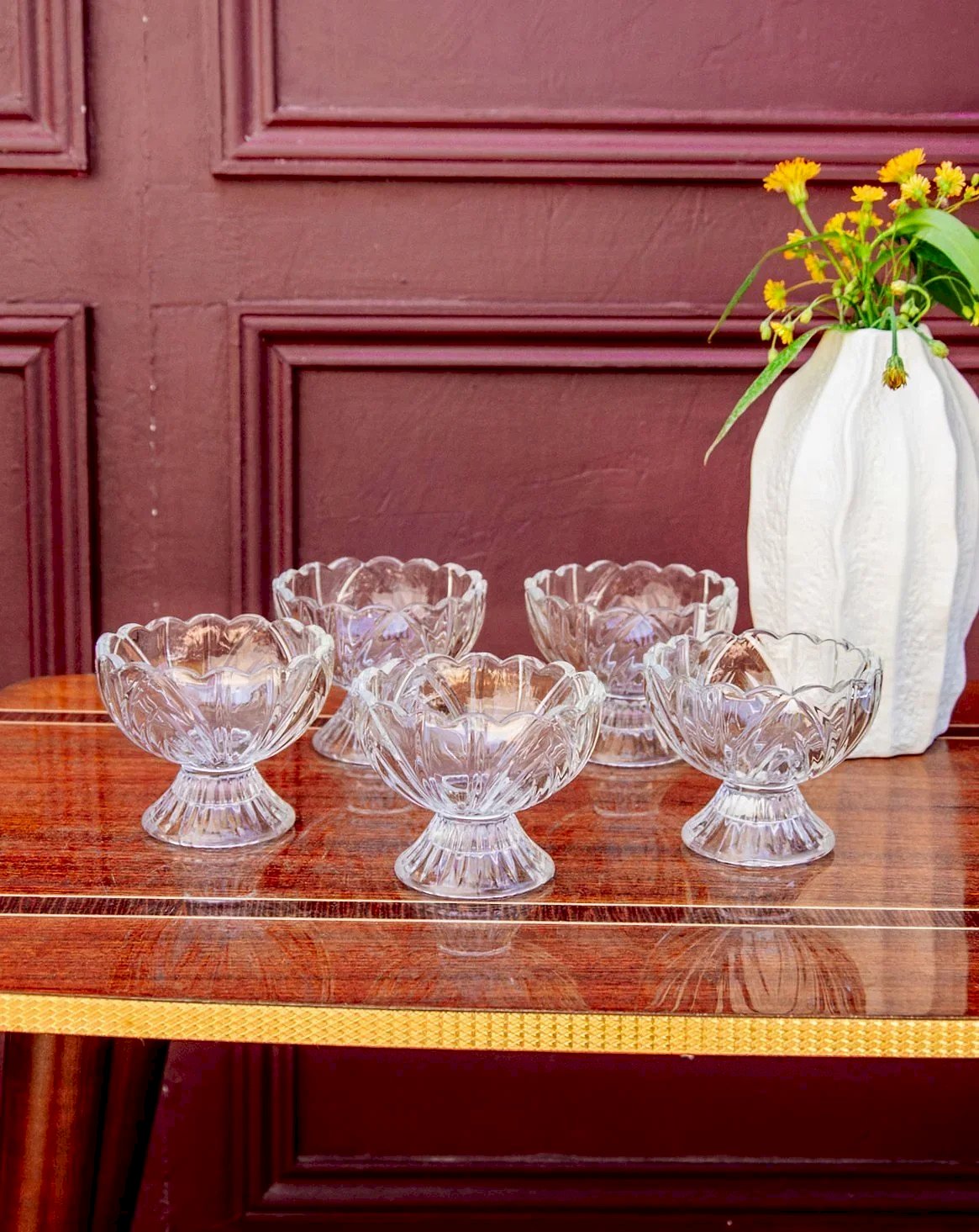 Discover this charming set of five glass bowls, perfect for enhancing your desserts. Their delicately waved edge evokes the softness of flower petals, bringing lightness and elegance to each presentation. Ideal for ice creams, fruit cups, or to brighten up a summer table, these bowls are invitations to indulgence with style. A little treasure to adopt for moments filled with delicacy. Height: 7.5 cm Diameter: 6 cm Condition: Used: Item that has been used. Item showing some signs of superficial wear... Used: Item that has been used. Item showing some signs of superficial wear, fully operational and functioning correctly. It may be a demonstration model or an item returned to the store after a short period of use. any imperfections. Brand: Debongout Type: Thrifted product Material: Glass Style: Country